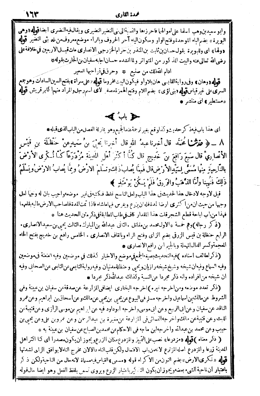 ذكر مَعْنَاهُ: قَوْله: (مزدرعاً) ، نصب على التَّمْيِيز، والمزدرع مَكَان الزَّرْع وَيجوز أَن يكون مصدرا، أَي: كُنَّا أَكثر أهل الْمَدِينَة زرعا، والمزدرع أَصله المزترع لِأَنَّهُ من بَاب الافتعال، وَلَكِن قلب التَّاء دَالا لِأَن مخرج التَّاء لَا يُوَافق الزَّاي لشدتها. قَوْله: (نكرِي الأَرْض) ، بِضَم النُّون من الإكراء. قَوْله: (مُسَمّى) ، الْقيَاس فِيهِ مُسَمَّاة لِأَنَّهُ حَال من النَّاحِيَة، وَلَكِن ذكر بِاعْتِبَار أَن نَاحيَة الشَّيْء بعضه، وَيجوز أَن يكون التَّذْكِير بِاعْتِبَار الزَّرْع، ويروى: تسمي، بِلَفْظ الْفِعْل، وَهُوَ أَيْضا حَال. قَوْله: