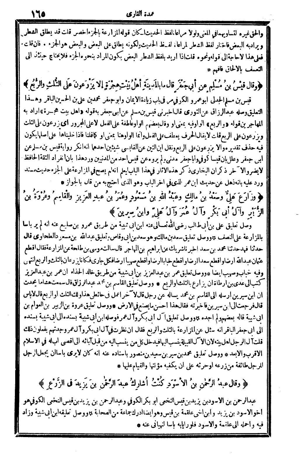 وَزَارَعَ عَلِيٌّ وسَعْد بنُ مَالِكٍ وعَبْدُ الله بنُ مَسْعُودٍ وعُمَرُ بنُ عَبْدِ العَزِيزِ والْقَاسِمُ وعُرْوَةُ بنُ الزُّبَيْرِ وآلُ أبِي بَكْرٍ وآلِ عُمَرَ وآلُ عَلِيٍّ وابنُ سِيرينَ
