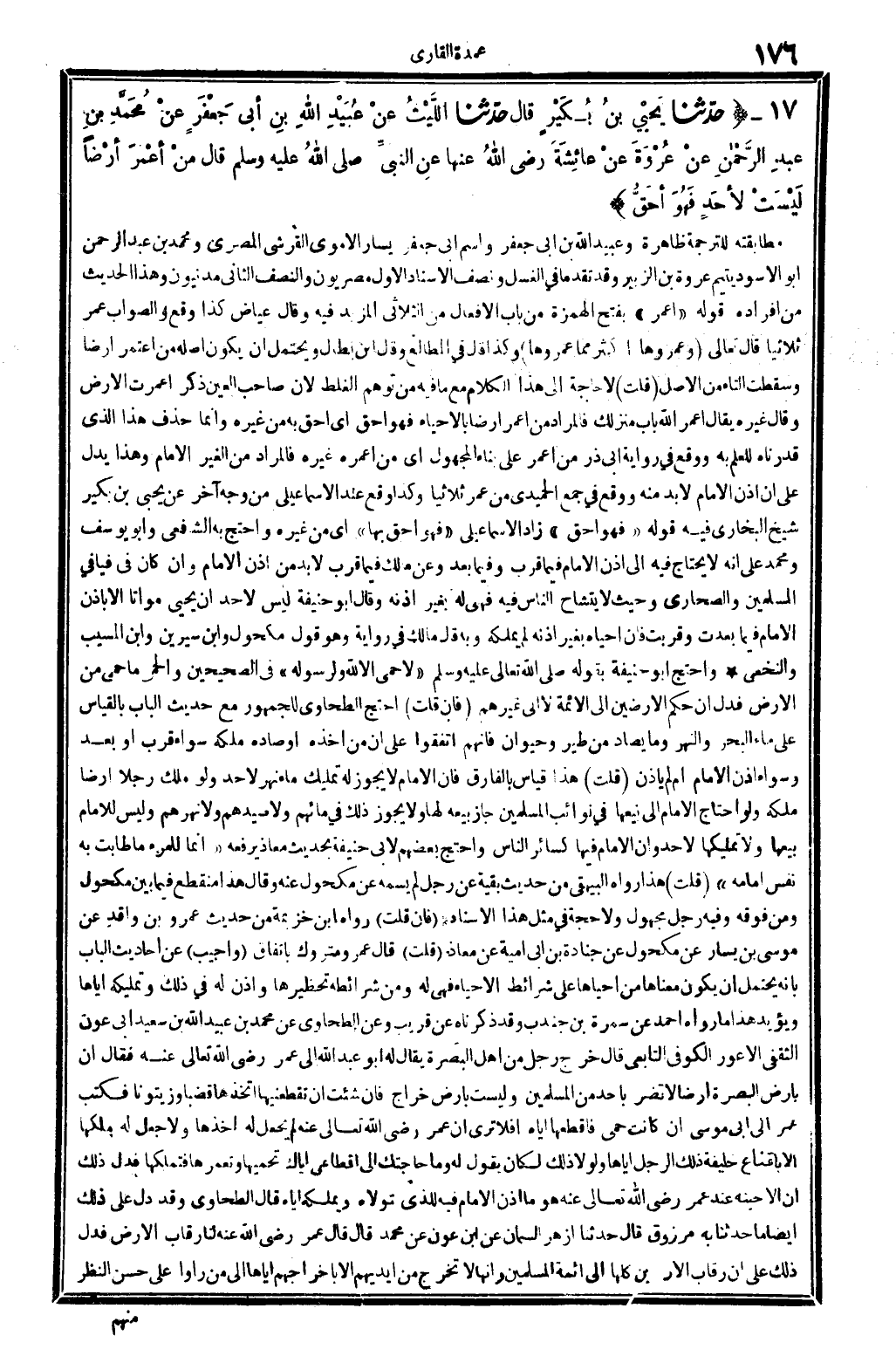 وَأجِيب: عَن أَحَادِيث الْبَاب بِأَنَّهُ يحْتَمل أَن يكون مَعْنَاهَا: من أَحْيَاهَا على شَرَائِط الْإِحْيَاء فَهِيَ لَهُ، وَمن شَرَائِطه: تحظيرها، وَإِذن لَهُ فِي ذَلِك، وتمليكه إِيَّاهَا. وَيُؤَيّد هَذَا مَا رَوَاهُ أَحْمد عَن سَمُرَة بن جُنْدُب، وَقد ذَكرْنَاهُ عَن قريب، وَعَن الطَّحَاوِيّ: عَن مُحَمَّد بن عبيد الله بن سعيد أبي عون الثَّقَفِيّ الْأَعْوَر الْكُوفِي التَّابِعِيّ، قَالَ: خرج رجل من أهل الْبَصْرَة يُقَال لَهُ: أَبُو عبد الله إِلَى عمر، رَضِي الله تَعَالَى عَنهُ، فَقَالَ: إِن بِأَرْض الْبَصْرَة أَرضًا لَا تضر بِأحد من الْمُسلمين وَلَيْسَ بِأَرْض خراج. فَإِن شِئْت أَن تقطعنيها اتخذها قضباً وَزَيْتُونًا! فَكتب عمر إِلَى أبي مُوسَى: إِن كَانَت حمى فاقطعها إِيَّاه، أفَلاَ تَرى أَن عمر، رَضِي الله تَعَالَى عَنهُ، لم يَجْعَل لَهُ أَخذهَا وَلَا جعل لَهُ ملكهَا إلاَّ بإقطاع خَليفَة ذَلِك الرجل إِيَّاهَا وَلَوْلَا ذَلِك لَكَانَ يَقُول لَهُ: وَمَا حَاجَتك إِلَى إقطاعي إياك تحميها وتعمرها فتملكها فَدلَّ ذَلِك أَن الْإِحْيَاء عِنْد عمر، رَضِي الله تَعَالَى عَنهُ، هُوَ مَا أذن الإِمَام فِيهِ للَّذي يَتَوَلَّاهُ ويملكه إِيَّاه. قَالَ الطَّحَاوِيّ: وَقد دلّ على ذَلِك أَيْضا مَا حَدثنَا بِهِ ابْن مَرْزُوق، قَالَ: حَدثنَا أَزْهَر السمان عَن ابْن عون عَن مُحَمَّد، قَالَ: قَالَ عمر، رَضِي الله تَعَالَى عَنهُ: لنا رِقَاب الأَرْض، فَدلَّ ذَلِك على أَن رِقَاب الْأَرْضين كلهَا إِلَى أَئِمَّة الْمُسلمين، وَأَنَّهَا لَا تخرج من أَيْديهم إلاَّ بإخراجهم إِيَّاهَا إِلَى من رَأَوْا على حسن النّظر