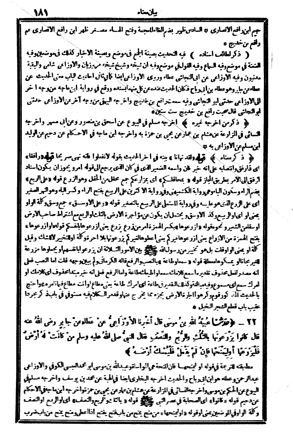 ذكر لطائف إِسْنَاده فِيهِ: التحديث بِصِيغَة الْجمع فِي مَوضِع وبصيغة الْإِخْبَار كَذَلِك فِي موضِعين. وَفِيه: العنعنة فِي مَوضِع. وَفِيه: السماع. وَفِيه: القَوْل فِي مَوضِع. وَفِيه: أَن شَيْخه وَشَيخ شَيْخه مروزيان وَالْأَوْزَاعِيّ شَامي والبقية مدنيون. وَفِيه: الْأَوْزَاعِيّ عَن أبي النَّجَاشِيّ عَطاء، وروى الْأَوْزَاعِيّ أَيْضا، كَمَا فِي ثَانِي أَحَادِيث الْبَاب، معنى الحَدِيث عَن عَطاء عَن جَابر، وَهُوَ عَطاء بن أبي رَبَاح، فَكَانَ الحَدِيث عِنْده عَن كل مِنْهُمَا بِسَنَدِهِ، وَوَقع فِي رِوَايَة ابْن مَاجَه من وَجه آخر إِلَى الْأَوْزَاعِيّ: حَدثنِي أَبُو النَّجَاشِيّ. وَفِيه: سَمِعت رَافع بن خديج. وَأخرجه الْبَيْهَقِيّ من وَجه آخر عَن الْأَوْزَاعِيّ: حَدثنِي أَبُو النَّجَاشِيّ: قَالَ: صَحِبت رَافع بن خديج سِتّ سِنِين ...