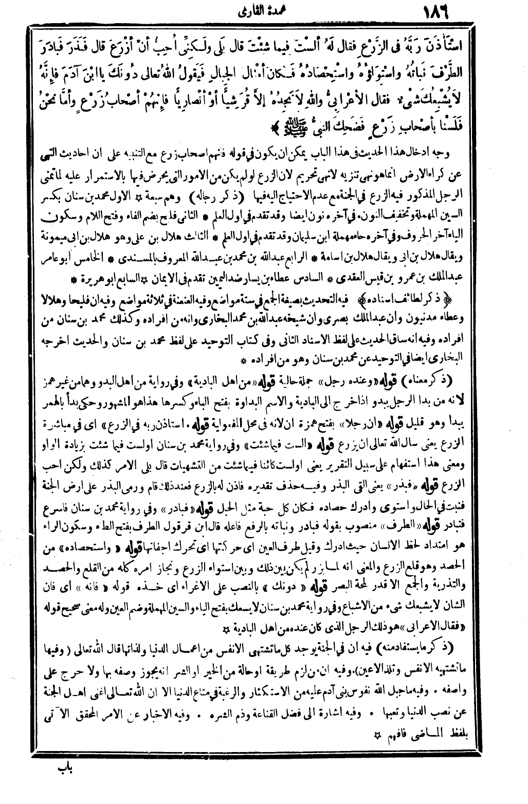 اسْتأذَنَ رَبَّهُ فِي الزَّرْعِ فَقَالَ لَهُ ألَسْتَ فِيما شِئْتَ قَالَ بَلى ولَكِنِّي أحِبُّ أنْ أزْرَعَ قَالَ فَبَذَرَ فبَادَرَ الطَّرْفَ نباتُهُ واسْتوَاؤُهُ واسْتِحْصَادُهُ فكَانَ أمْثال الجِبالِ فيَقُولُ الله تَعَالَى دُونَكَ يَا ابْنَ آدَمَ فإنَّهُ لاَ يُشْبِعُكَ شيءٌ فَقَالَ الأعْرَابِيُّ وَالله لَا تَجِدُهُ إلاَّ قُرَشِيَّاً أوْ أنْصَاريَّاً فإنَّهُمْ أصْحابُ زَرْعٍ وأمَّا نَحْنُ فلَسْنَا بأصْحَابِ زَرْعٍ فضَحِكَ النبيُّ صلى الله عَلَيْهِ وَسلم. (الحَدِيث 8432 طرفه فِي: 9157) .