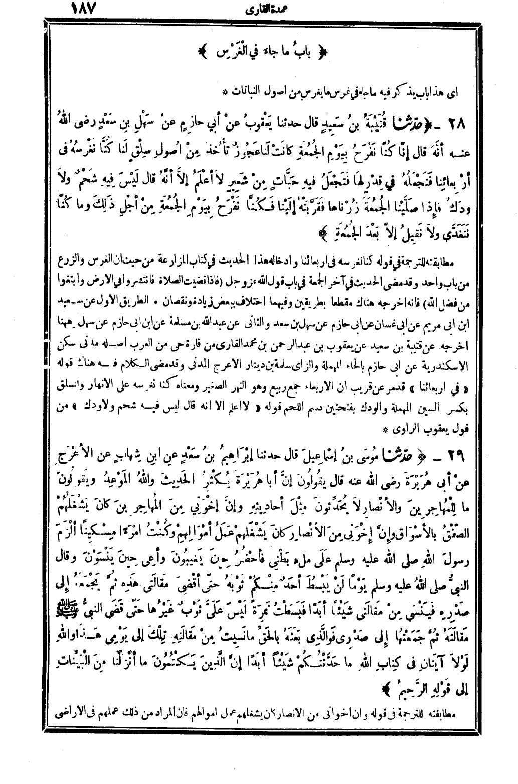 9432 - حدَّثنا قُتَيْبَةُ بنُ سَعِيدٍ قَالَ حدَّثنا يَعْقوبُ عنْ أبِي حازِمٍ عنْ سَهْلِ بنِ سعْدٍ رَضِي الله تَعَالَى عَنهُ أنَّهُ قالَ إنَّا كُنَّا نَفْرَحُ بِيَوْمِ الجُمُعَةِ كانَتْ لَنا عَجُوزٌ تأخُذُ مِنْ أصُولِ سِلْقٍ لَنا كُنَّا نَغرُسُهُ فِي أرْبِعَائِنَا فتَجْعَلُهُ فِي قِدْرٍ لَهَا فتَجْعَلُ فِيهِ حَبَّاتٍ مِنْ شَعِيرٍ لَا أعْلَمُ إلاَّ أنَّهُ قَالَ لَيسَ فِيهِ شَحْمٌ ولاَ ودَكٌ فإذَا صلَّيْنَا الجُمُعَةُ زُرْنَاهَا فقَرَّبَتْهُ إلَيْنَا فَكُنَّا نَفْرَحُ بِيَوْمِ الجُمُعَةِ مِنْ أجْلِ ذَلِكَ وَمَا كُنَّا نتَغَدَّى ولاَ نَقِيلُ إلاَّ بَعْدَ الجُمُعَةِ. .