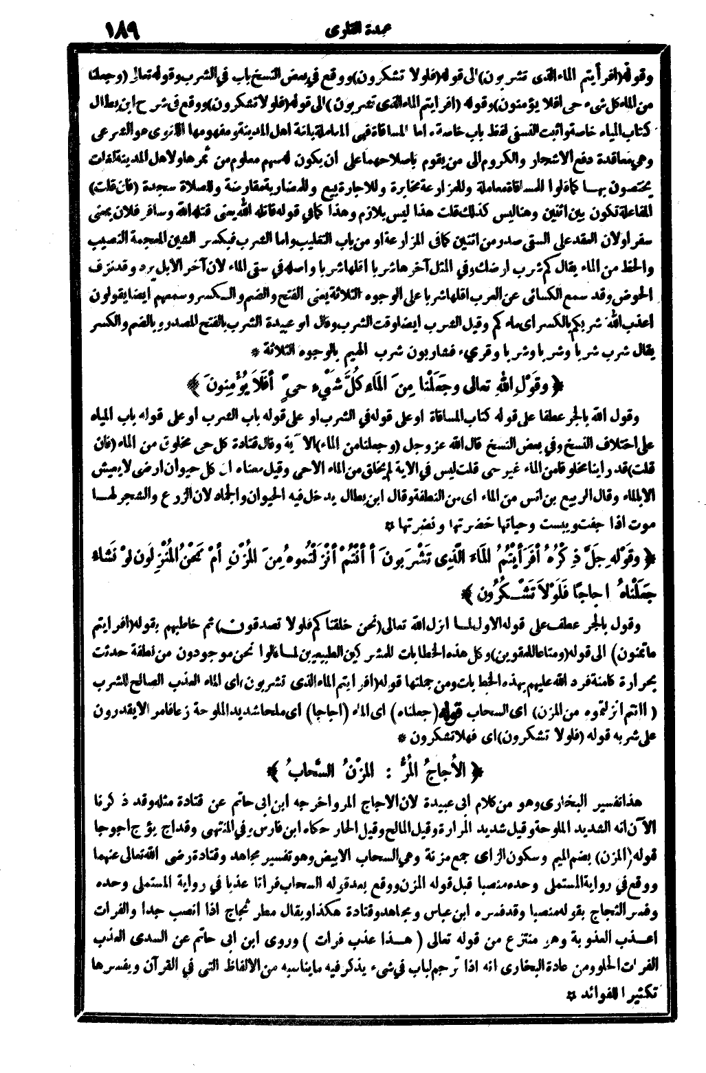 وَقَوله: {أَفَرَأَيْتُم المَاء الَّذِي تشربون} (الْوَاقِعَة: 86) . إِلَى قَوْله: {فلولا تشكرون} (الْوَاقِعَة: 86) . وَوَقع فِي بعض النّسخ: بَاب فِي الشّرْب، وَقَوله تَعَالَى: {وَجَعَلنَا من المَاء كل شَيْء حَيّ أَفلا يُؤمنُونَ} (الْأَنْبِيَاء: 03) . وَقَوله: {أَفَرَأَيْتُم المَاء الَّذِي تشربون} (الْوَاقِعَة: 86) . إِلَى قَوْله: {فلولا تشكرون} (الْوَاقِعَة: 86) . وَوَقع فِي شرح ابْن بطال: كتاب المياة خَاصَّة، وَأثبت النَّسَفِيّ لفظ: بَاب خَاصَّة.