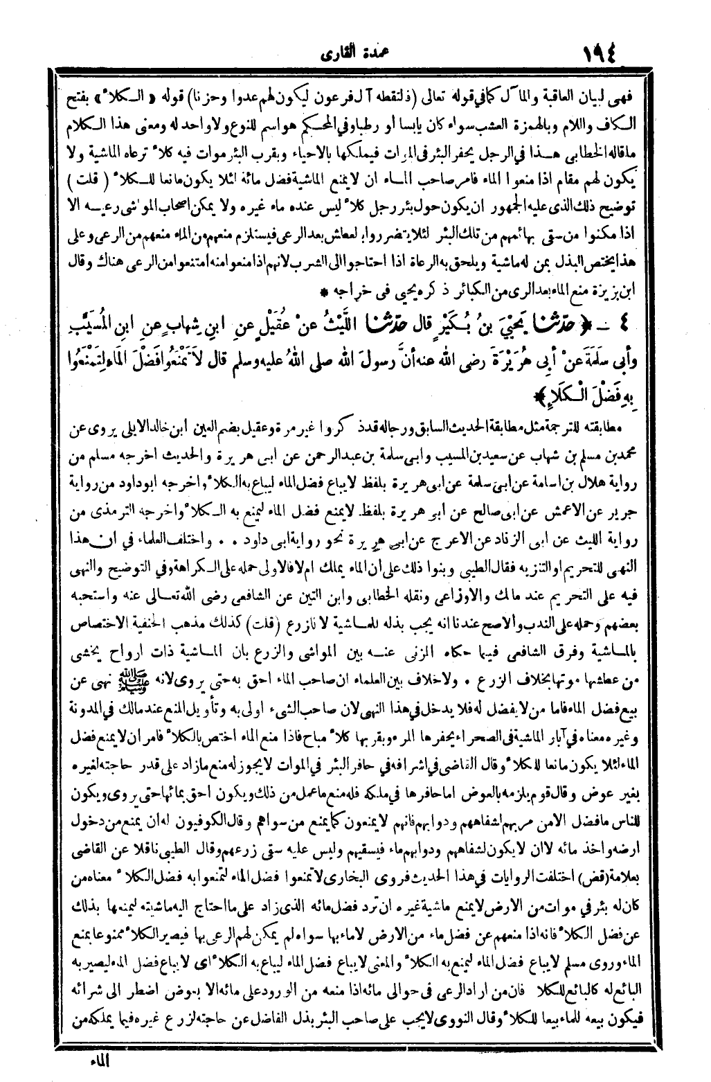 وَلَا خلاف بَين الْعلمَاء أَن صَاحب المَاء أَحَق بِهِ حَتَّى يُروى لِأَنَّهُ صلى الله عَلَيْهِ وَسلم نهى عَن بيع فضل المَاء، فَأَما من لَا يفضل لَهُ فَلَا يدْخل فِي هَذَا النَّهْي، لِأَن صَاحب الشَّيْء أولى بِهِ. وَتَأْويل الْمَنْع عِنْد مَالك فِي (الْمُدَوَّنَة) وَغَيره: مَعْنَاهُ فِي آبار الْمَاشِيَة فِي الصَّحرَاء يحفرها الْمَرْء وبقربها كلأ مُبَاح، فَإِذا منع المَاء اخْتصَّ بالكلأ، فَأمر أَن لَا يمْنَع فضل المَاء لِئَلَّا يكون مَانِعا للكلأ. وَقَالَ القَاضِي فِي (إشرافه) فِي حافر الْبِئْر فِي الْموَات: لَا يجوز لَهُ منع مَا زَاد على قدر حَاجته لغيره بِغَيْر عوض، وَقَالَ قوم: يلْزمه بِالْعِوَضِ، أما حافرها فِي ملكه فَلهُ منع مَا عمل من ذَلِك، وَيكون أَحَق بِمَائِهَا حَتَّى يرْوى، وَيكون للنَّاس مَا فضل إلاَّ من مر بهم لشفاههم ودوابهم فَإِنَّهُم لَا يمْنَعُونَ كَمَا يمْنَع من سواهُم. وَقَالَ الْكُوفِيُّونَ: لَهُ أَن يمْنَع من دُخُول أرضه وَأخذ مَائه لَا أَن لَا يكون لشفاههم ودوابهم مَاء فيسقيهم، وَلَيْسَ عَلَيْهِ سقِِي زرعهم. وَقَالَ الطَّيِّبِيّ، نَاقِلا عَن القَاضِي بعلامة (قض) : اخْتلفت الرِّوَايَات فِي هَذَا الحَدِيث فروى البُخَارِيّ: لَا تمنعوا فضل المَاء لتمنعوا بِهِ فضل الْكلأ، مَعْنَاهُ: من كَانَ لَهُ بِئْر فِي موَات من الأَرْض لَا يمْنَع مَاشِيَة غَيره أَن ترد فضل مَائه الَّذِي زَاد على مَا احْتَاجَ إِلَيْهِ ليمنعها بذلك عَن فضل الْكلأ، فَإِنَّهُ إِذا مَنعهم عَن فضل مَاء من الأَرْض لَا مَاء بهَا (مَا شيته) ، سواهُ لم يُمكن لَهُم الرَّعْي بهَا، فَيصير الْكلأ مَمْنُوعًا بِمَنْع المَاء. وروى مُسلم: لَا يُبَاع فضل المَاء ليمنع بِهِ الْكلأ. وَالْمعْنَى: لَا يُبَاع فضل المَاء ليباع بِهِ الْكلأ، أَي: لَا يُبَاع فضل المَاء ليصير بِهِ البَائِع لَهُ كالبائع للكلأ، فَإِن من أَرَادَ الرَّعْي فِي حوالي مَائه إِذا مَنعه من الْوُرُود على مَائه، إلاَّ بعوض اضْطر إِلَى شِرَائِهِ، فَيكون بَيْعه للْمَاء بيعا للكلأ. وَقَالَ النَّوَوِيّ: لَا يجب على صَاحب الْبِئْر بذل الْفَاضِل عَن حَاجته لزرع غَيره فِيمَا يملكهُ من