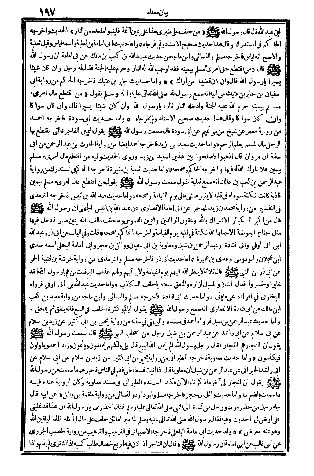 ابْن عبد الله، قَالَ: قَالَ رَسُول الله صلى الله عَلَيْهِ وَسلم: (من حلف على منبري هَذَا على يَمِين آثمة فَليَتَبَوَّأ مَقْعَده من النَّار) الحَدِيث، وَأخرجه الْحَاكِم فِي (الْمُسْتَدْرك) وَقَالَ: هَذَا حَدِيث صَحِيح الْإِسْنَاد وَلم يخرجَاهُ. وَأما حَدِيث أبي أُمَامَة بن ثَعْلَبَة، واسْمه: إِيَاس، وَقيل: ثَعْلَبَة، وَالأَصَح أَنه إِيَاس، فَأخْرجهُ مُسلم وَالنَّسَائِيّ وَابْن مَاجَه من حَدِيث عبد الله بن كَعْب بن مَالك عَن أبي أُمَامَة: أَن رَسُول الله صلى الله عَلَيْهِ وَسلم قَالَ: (من اقتطع حق امرىء مُسلم بِيَمِينِهِ فقد أوجب الله لَهُ النَّار وَحرم عَلَيْهِ الْجنَّة، فَقَالَ لَهُ رجل: وَإِن كَانَ شَيْئا يَسِيرا يَا رَسُول الله؟ قَالَ: وَإِن كَانَ قَضِيبًا من أَرَاك) . وَأما حَدِيث جَابر بن عتِيك فَأخْرجهُ الْحَاكِم من رِوَايَة أبي سُفْيَان بن جَابر بن عتِيك عَن أَبِيه أَنه سمع رَسُول الله، صلى الله عَلَيْهِ وَسلم يَقُول: (من اقتطع مَال امرىء مُسلم بِيَمِينِهِ حرم الله عَلَيْهِ الْجنَّة وَأدْخلهُ النَّار، قَالُوا: يَا رَسُول الله {وَإِن كَانَ شَيْئا يَسِيرا؟ قَالَ: وَإِن كَانَ سواكاً، وَإِن كَانَ سواكاً) . وَقَالَ: هَذَا حَدِيث صَحِيح الْإِسْنَاد وَلم يخرجَاهُ. وَأما حَدِيث أبي سَوْدَة فَأخْرجهُ أَحْمد من رِوَايَة معمر عَن شيخ من بني تَمِيم عَن أبي سَوْدَة، قَالَ: سَمِعت رَسُول الله صلى الله عَلَيْهِ وَسلم يَقُول: الْيَمين الْفَاجِرَة الَّتِي يقتطع بهَا الرجل مَال الْمُسلم يعقم الرَّحِم. وَأما حَدِيث سعيد بن زيد فَأخْرجهُ أَحْمد أَيْضا من رِوَايَة الْحَارِث بن عبد الرَّحْمَن عَن أبي سَلمَة أَن مَرْوَان قَالَ: إذهبوا فأصلحوا بَين هذَيْن، لسَعِيد بن زيد، وروى الحَدِيث وَفِيه: من اقتطع مَال امرىء مُسلم بِيَمِين فَلَا بَارك الله لَهُ فِيهَا، وَأخرجه الْحَاكِم وَصَححهُ. وَأما حَدِيث ثَعْلَبَة بن مُغيرَة فَأخْرجهُ الْحَاكِم فِي (الْمُسْتَدْرك) من رِوَايَة عبد الرَّحْمَن بن كَعْب بن مَالك أَنه سمع ثَعْلَبَة يَقُول: سَمِعت رَسُول الله صلى الله عَلَيْهِ وَسلم يَقُول: من اقتطع مَال امرىء مُسلم بِيَمِين كَاذِبَة كَانَت نُكْتَة سَوْدَاء فِي قلبه لَا يغيرها شَيْء إِلَى يَوْم الْقِيَامَة، وَصَححهُ. وَأما حَدِيث عبد الله بن أنيس فَأخْرجهُ التِّرْمِذِيّ فِي التَّفْسِير من رِوَايَة مُحَمَّد بن زيد المُهَاجر عَن أبي أُمَامَة الْأنْصَارِيّ عَن عبد الله بن أنيس الْجُهَنِيّ: أَن رَسُول الله صلى الله عَلَيْهِ وَسلم قَالَ: من أكبر الْكَبَائِر الْإِشْرَاك بِاللَّه، وعقوق الْوَالِدين، وَالْيَمِين الْغمُوس، وَمَا حلف حَالف بِاللَّه يَمِين صَبر فَأدْخل فِيهَا مثل جنَاح الْبَعُوضَة إلاَّ جعلهَا الله نُكْتَة فِي قلبه يَوْم الْقِيَامَة، وَأخرجه الْحَاكِم وَصَححهُ.