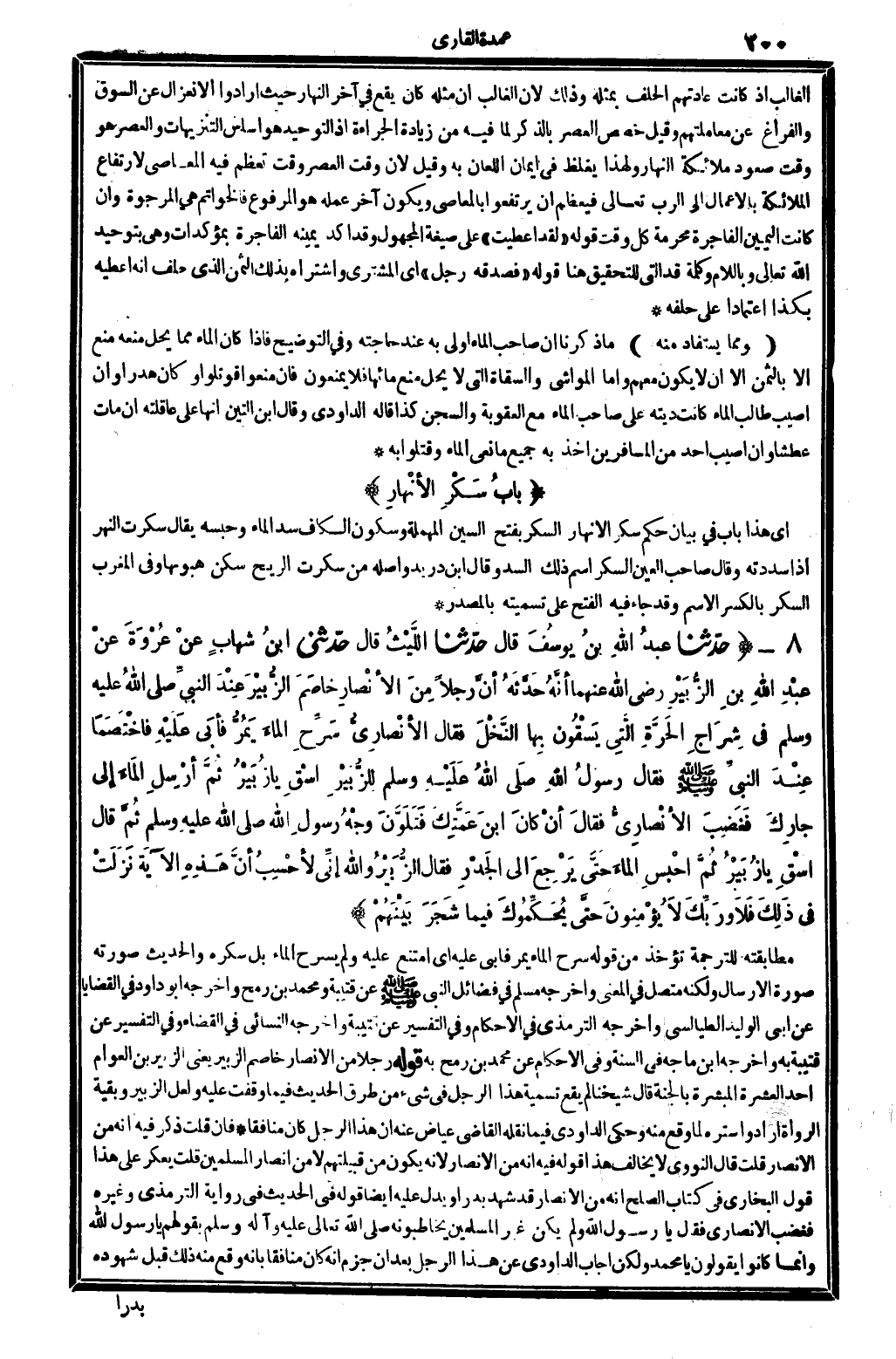 أَي: هَذَا بَاب فِي بَيَان حكم سكر الْأَنْهَار، السكر، بِفَتْح السِّين الْمُهْملَة وَسُكُون الْكَاف: سد المَاء وحبسه، يُقَال: سكرت النَّهر إِذا سددته. وَقَالَ صَاحب (الْعين) السكر، اسْم ذَلِك السد، وَقَالَ ابْن دُرَيْد: وَأَصله من: سكرت الرّيح: سكن هبوبها، وَفِي (الْمغرب) : السكر، بِالْكَسْرِ الِاسْم وَقد جَاءَ فِيهِ الْفَتْح على تَسْمِيَته بِالْمَصْدَرِ.