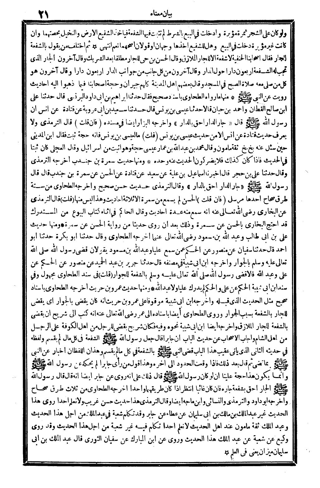 ثمَّ اخْتلف من يَقُول بِالشُّفْعَة للْجَار، فَقَالَ أَصْحَابنَا الْحَنَفِيَّة: لَا شُفْعَة إلاَّ للْجَار الملازق، وَقَالَ الْحسن بن حَيّ: للْجَار مُطلقًا بعد الشَّرِيك، وَقَالَ آخَرُونَ: الْجَار الَّذِي تجب لَهُ الشُّفْعَة أَرْبَعُونَ دَارا حول الدَّار. وَقَالَ آخَرُونَ: من كل جَانب من جَوَانِب الدَّار أَرْبَعُونَ دَارا. وَقَالَ آخَرُونَ: هُوَ كل من صلى مَعَه صَلَاة الصُّبْح فِي الْمَسْجِد، وَقَالَ بَعضهم: أهل الْمَدِينَة كلهم جيران، وَحجَّة أَصْحَابنَا فِيمَا ذَهَبُوا إِلَيْهِ أَحَادِيث رويت عَن النَّبِي صلى الله عَلَيْهِ وَسلم. مِنْهَا: مَا رَوَاهُ الطَّحَاوِيّ بِإِسْنَاد صَحِيح، فَقَالَ: حَدثنَا إِبْرَاهِيم بن أبي دَاوُد البرنسي، قَالَ: حَدثنَا عَليّ ابْن صَالح الْقطَّان وَأحمد بن حبَان، قَالَا: حَدثنَا عِيسَى بن يُونُس، قَالَ: حَدثنَا سعيد بن أبي عرُوبَة عَن قَتَادَة عَن أنس أَن رَسُول الله صلى الله عَلَيْهِ وَسلم قَالَ: (جَار الدَّار أَحَق بِالدَّار) . وَأخرجه الْبَزَّار أَيْضا فِي (مُسْنده) . فَإِن قلت: قَالَ التِّرْمِذِيّ: وَلَا يعرف حَدِيث قَتَادَة عَن أنس إلاَّ من حَدِيث عِيسَى بن يُونُس؟ قلت: مَا لعيسى بن يُونُس فَإِنَّهُ حجَّة ثَبت، فَقَالَ ابْن الْمَدِينِيّ حِين سُئِلَ عَنهُ: بخٍ بخٍ ثِقَة مَأْمُون، وَقَالَ مُحَمَّد بن عبد الله بن عمار عِيسَى: حجَّة، وَهُوَ أثبت من إِسْرَائِيل. وَقَالَ الْعجلِيّ: كَانَ ثبتا فِي الحَدِيث، فَإِذا كَانَ كَذَلِك فَلَا يضر كَون الحَدِيث عَنهُ وَحده. وَمِنْهَا: حَدِيث سَمُرَة بن جُنْدُب أخرجه التِّرْمِذِيّ، وَقَالَ: حَدثنَا عَليّ بن حجر، قَالَ: أخبرنَا إِسْمَاعِيل بن علية عَن سعيد عَن قَتَادَة عَن الْحسن عَن سَمُرَة بن جُنْدُب، قَالَ: قَالَ رَسُول الله صلى الله عَلَيْهِ وَسلم: (جَار الدَّار أَحَق بِالدَّار) . وَقَالَ التِّرْمِذِيّ: حَدِيث حسن صَحِيح، وَأخرجه الطَّحَاوِيّ من سِتَّة طرق صِحَاح أَحدهَا مُرْسل. فَإِن قلت: الْحسن لم يسمع من سَمُرَة إلاَّ ثَلَاثَة أَحَادِيث، وَهَذَا لَيْسَ مِنْهَا؟ قلت: قَالَ التِّرْمِذِيّ عَن البُخَارِيّ، رَضِي الله تَعَالَى عَنهُ: إِنَّه سمع مِنْهُ عدَّة أَحَادِيث، وَقَالَ الْحَاكِم فِي أثْنَاء كتاب الْبيُوع من (الْمُسْتَدْرك) : قد احْتج البُخَارِيّ بالْحسنِ عَن سَمُرَة، وَذَلِكَ بعد أَن روى حَدِيثا من رِوَايَة الْحسن عَن سَمُرَة. وَمِنْهَا: حَدِيث عَليّ بن أبي طَالب وَعبد الله بن مَسْعُود، رَضِي الله تَعَالَى عَنْهُمَا، أخرجه الطَّحَاوِيّ، وَقَالَ: حَدثنَا أَبُو بكرَة حَدثنَا أَبُو أَحْمد، قَالَ: حَدثنَا سُفْيَان عَن مَنْصُور عَن الحكم عَمَّن سمع عليا وَعبد الله بن مَسْعُود يَقُولَانِ: قضى رَسُول الله، صلى الله عَلَيْهِ وَسلم، بالجوار. وَأخرجه ابْن أبي شيبَة فِي (مُصَنفه) قَالَ: حَدثنَا جرير بن عبد الحميد عَن مَنْصُور عَن الحكم عَن عَليّ وَعبد الله قَالَا: قضى رَسُول الله، صلى الله عَلَيْهِ وَسلم، بِالشُّفْعَة للجوار. قلت: فِي سَنَد الطَّحَاوِيّ مَجْهُول، وَفِي سَنَد ابْن أبي شيبَة الحكم عَن عَليّ، وَالْحكم لم يدْرك عليا وَلَا عبد الله. وَمِنْهَا: حَدِيث عَمْرو بن حُرَيْث، أخرجه الطَّحَاوِيّ بِإِسْنَاد صَحِيح مثل الحَدِيث الَّذِي قبله، وَأخرجه ابْن أبي شيبَة مَوْقُوفا على عَمْرو بن حُرَيْث أَنه: كَانَ يقْضِي بالجوار، أَي يقْضِي للْجَار بِالشُّفْعَة بِسَبَب الْجوَار، وروى الطَّحَاوِيّ أَيْضا بِإِسْنَادِهِ إِلَى عمر، رَضِي الله تَعَالَى عَنهُ، أَنه كتب إِلَى شُرَيْح أَن يقْضِي بِالشُّفْعَة للْجَار الملازق، وَأخرجه أَيْضا ابْن أبي شيبَة نَحوه، وَفِيه: فَكَانَ شُرَيْح يقْضِي للرجل من أهل الْكُوفَة على الرجل من أهل الشَّام، وَأجَاب الْأَصْحَاب عَن حَدِيث الْبَاب أَن جَابِرا قَالَ: جعل رَسُول الله صلى الله عَلَيْهِ وَسلم الشُّفْعَة فِي كل مَال لم يق