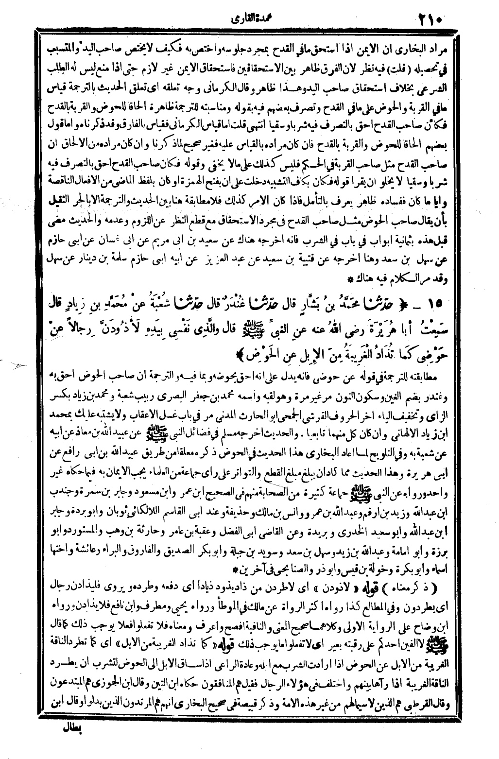 15 - (حَدثنَا مُحَمَّد بن بشار قَالَ حَدثنَا غنْدر قَالَ حَدثنَا شُعْبَة عَن مُحَمَّد بن زِيَاد قَالَ سَمِعت أَبَا هُرَيْرَة رَضِي الله عَنهُ عَن النَّبِي - صَلَّى اللَّهُ عَلَيْهِ وَسَلَّم َ - قَالَ وَالَّذِي نَفسِي بِيَدِهِ لأذودن رجَالًا عَن حَوْضِي كَمَا تذاد الغريبة من الْإِبِل عَن الْحَوْض) مطابقته للتَّرْجَمَة فِي قَوْله عَن حَوْضِي فَإِنَّهُ يدل على أَنه أَحَق بحوضه وَبِمَا فِيهِ والترجمة أَن صَاحب الْحَوْض أَحَق بِهِ وغندر بِضَم الْغَيْن وَسُكُون النُّون مر غير مرّة وَهُوَ لقبه واسْمه مُحَمَّد بن جَعْفَر الْبَصْرِيّ ربيب شُعْبَة وَمُحَمّد بن زِيَاد بِكَسْر الزَّاي وَتَخْفِيف الْيَاء آخر الْحُرُوف الْقرشِي الجُمَحِي أَبُو الْحَارِث الْمدنِي مر فِي بَاب غسل الأعقاب وَلَا يشْتَبه عَلَيْك بِمُحَمد بن زِيَاد الْأَلْهَانِي وَإِن كَانَ كل مِنْهُمَا تابعيا. والْحَدِيث أخرجه مُسلم فِي فَضَائِل النَّبِي - صَلَّى اللَّهُ عَلَيْهِ وَسَلَّم َ - عَن عبيد الله بن معَاذ عَن أَبِيه عَن شُعْبَة بِهِ وَفِي التَّلْوِيح لما أعَاد البُخَارِيّ هَذَا الحَدِيث فِي الْحَوْض ذكره مُعَلّقا من طَرِيق عبيد الله بن أبي رَافع عَن أبي هُرَيْرَة وَهَذَا الحَدِيث مِمَّا كَاد أَن يبلغ مبلغ الْقطع والتواتر على رَأْي جمَاعَة من الْعلمَاء يجب الْإِيمَان بِهِ فِيمَا حَكَاهُ غير وَاحِد وَرَوَاهُ عَن النَّبِي - صَلَّى اللَّهُ عَلَيْهِ وَسَلَّم َ - جمَاعَة كَثِيرَة من الصَّحَابَة مِنْهُم فِي الصَّحِيح ابْن عمر وَابْن مَسْعُود وَجَابِر بن سَمُرَة وجندب بن عبد الله وَزيد بن أَرقم وَعبد الله بن عَمْرو وَأنس بن مَالك وَحُذَيْفَة وَعند أبي الْقَاسِم اللالكائي ثَوْبَان وَأَبُو بردة وَجَابِر بن عبد الله وَأَبُو سعيد الْخُدْرِيّ وَبُرَيْدَة وَعَن القَاضِي أبي الْفضل وَعقبَة بن عَامر وحارثة بن وهب والمستورد وَأَبُو بَرزَة وَأَبُو أُمَامَة وَعبد الله بن زيد وَسَهل بن سعد وسُويد بن جبلة وَأَبُو بكر الصّديق والفاروق والبراء وَعَائِشَة وَأُخْتهَا أَسمَاء وَأَبُو بكرَة وَخَوْلَة بن قيس وَأَبُو ذَر والصنابحي فِي آخَرين (ذكر مَعْنَاهُ) قَوْله " لأذودن " أَي لأطردن من ذاد يذود ذيادا أَي دَفعه وطرده ويروى فليذادن رجال أَي يطردون وَفِي الْمطَالع كَذَا رَوَاهُ أَكثر الروَاة عَن مَالك فِي الْمُوَطَّأ وَرَوَاهُ يحيى ومطرف وَابْن نَافِع فَلَا يذادن وَرَوَاهُ ابْن وضاح على الرِّوَايَة الأولى وَكِلَاهُمَا صَحِيح الْمَعْنى والنافية أفْصح وَأعرف وَمَعْنَاهُ فَلَا تَفعلُوا فعلا يُوجب ذَلِك كَمَا قَالَ - صَلَّى اللَّهُ عَلَيْهِ وَسَلَّم َ - لَا أَلفَيْنِ أحدكُم على رقبته بعير أَي لَا تَفعلُوا مَا يُوجب ذَلِك قَوْله " كَمَا تذاد الغريبة من الْإِبِل " أَي كَمَا تطرد النَّاقة الغريبة من الْإِبِل عَن الْحَوْض إِذا أَرَادَت الشّرْب مَعَ إبِله وَعَادَة الرَّاعِي إِذا سَاق الْإِبِل إِلَى الْحَوْض لتشرب أَن يطرد النَّاقة الغريبة إِذا رَآهَا بَينهم وَاخْتلف فِي هَؤُلَاءِ الرِّجَال فَقيل هم المُنَافِقُونَ حَكَاهُ ابْن التِّين وَقَالَ ابْن الْجَوْزِيّ هم المبتدعون وَقَالَ الْقُرْطُبِيّ هم الَّذين لَا سِيمَا لَهُم من غير هَذِه الْأمة وَذكر قبيصَة فِي صَحِيح البُخَارِيّ أَنهم هم المرتدون الَّذين بدلُوا وَقَالَ ابْن