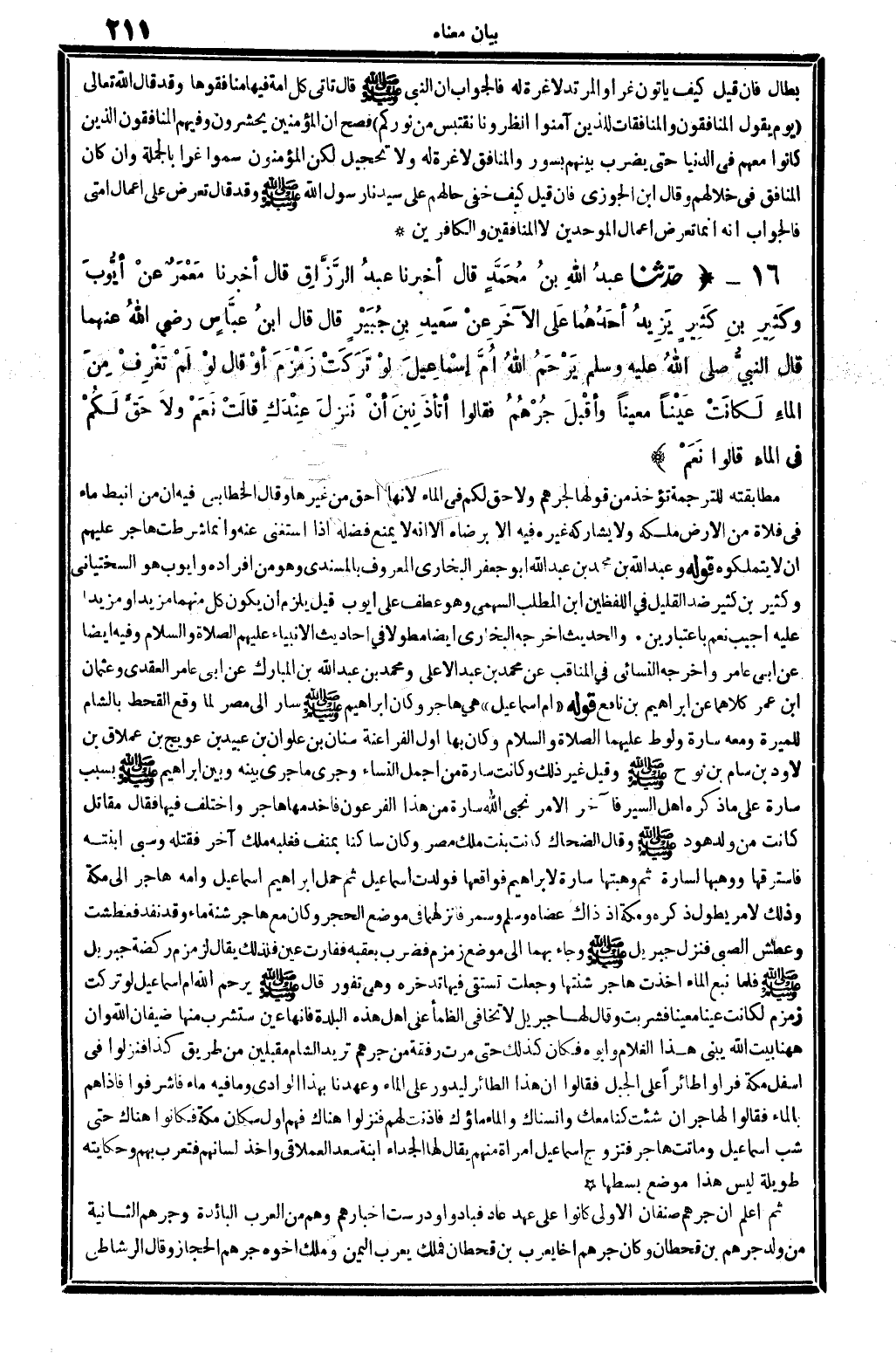 16 - (حَدثنَا عبد الله بن مُحَمَّد قَالَ أخبرنَا عبد الرَّزَّاق قَالَ أخبرنَا معمر عَن أَيُّوب وَكثير بن كثير يزِيد أَحدهمَا على الآخر عَن سعيد بن جُبَير قَالَ قَالَ ابْن عَبَّاس رَضِي الله عَنْهُمَا قَالَ النَّبِي - صَلَّى اللَّهُ عَلَيْهِ وَسَلَّم َ - يرحم الله أم إِسْمَاعِيل لَو تركت زَمْزَم أَو قَالَ لَو لم تغرف من المَاء لكَانَتْ عينا معينا وَأَقْبل جرهم فَقَالُوا أَتَأْذَنِينَ أَن ننزل عنْدك قَالَت نعم وَلَا حق لكم فِي المَاء قَالُوا نعم) مطابقته للتَّرْجَمَة تُؤْخَذ من قَوْلهَا لجرهم وَلَا حق لكم فِي المَاء لِأَنَّهَا أَحَق من غَيرهَا وَقَالَ الْخطابِيّ فِيهِ أَن من أنبط مَاء فِي فلاة من الأَرْض ملكه وَلَا يُشَارِكهُ غَيره فِيهِ إِلَّا بِرِضَاهُ إِلَّا أَنه لَا يمْنَع فَضله إِذا اسْتغنى عَنهُ وَإِنَّمَا شرطت هَاجر عَلَيْهِم أَن لَا يتملكوه قَوْله وَعبد الله بن مُحَمَّد بن عبد الله أَبُو جَعْفَر البُخَارِيّ الْمَعْرُوف بالمسندي وَهُوَ من أَفْرَاده وَأَيوب هُوَ السّخْتِيَانِيّ وَكثير بن كثير ضد الْقَلِيل فِي اللَّفْظَيْنِ ابْن الْمطلب السَّهْمِي وَهُوَ عطف على أَيُّوب قيل يلْزم أَن يكون كل مِنْهُمَا مزيدا أَو مزيدا عَلَيْهِ أُجِيب نعم باعتبارين. والْحَدِيث أخرجه البُخَارِيّ أَيْضا مطولا فِي أَحَادِيث الْأَنْبِيَاء عَلَيْهِم الصَّلَاة وَالسَّلَام وَفِيه أَيْضا عَن أبي عَامر وَأخرجه النَّسَائِيّ فِي المناقب عَن مُحَمَّد بن عبد الْأَعْلَى وَمُحَمّد بن عبد الله بن الْمُبَارك عَن أبي عَامر الْعَقدي وَعُثْمَان بن عمر كِلَاهُمَا عَن إِبْرَاهِيم بن نَافِع قَوْله " أم إِسْمَاعِيل " هِيَ هَاجر وَكَانَ إِبْرَاهِيم صلى الله عَلَيْهِ وَسلم سَار إِلَى مصر لما وَقع الْقَحْط بِالشَّام لِلْمِيرَةِ وَمَعَهُ سارة وَلُوط عَلَيْهِمَا الصَّلَاة وَالسَّلَام وَكَانَ بهَا أول الفراعنة سِنَان بن علوان بن عبيد بن عويج بن عملاق بن لاود بن سَام بن نوح صلى الله عَلَيْهِ وَسلم وَقيل غير ذَلِك وَكَانَت سارة من أجمل النِّسَاء وَجرى مَا جرى بَينه وَبَين إِبْرَاهِيم صلى الله عَلَيْهِ وَسلم بِسَبَب سارة على مَا ذكره أهل السّير فآخر الْأَمر نجى الله سارة من هَذَا الفرعون فَأَخْدَمَهَا هَاجر وَاخْتلف فِيهَا فَقَالَ مقَاتل كَانَت من ولد هود صلى الله عَلَيْهِ وَسلم وَقَالَ الضَّحَّاك كَانَت بنت ملك مصر وَكَانَ سَاكِنا بمنف فغلبه ملك آخر فَقتله وسبى ابْنَته فاسترقها ووهبها لسارة ثمَّ وهبتها سارة لإِبْرَاهِيم فواقعها فَولدت إِسْمَاعِيل ثمَّ حمل إِبْرَاهِيم إِسْمَاعِيل وَأمه هَاجر إِلَى مَكَّة وَذَلِكَ لأمر يطول ذكره وَمَكَّة إِذْ ذَاك عضاه وَسلم وَسمر فأنزلهما فِي مَوضِع الْحجر وَكَانَ مَعَ هَاجر شنة مَاء وَقد نفد فعطشت وعطش الصَّبِي فَنزل جِبْرِيل صلى الله عَلَيْهِ وَسلم وَجَاء بهما إِلَى مَوضِع زَمْزَم فَضرب بعقبه ففارت عين فَلذَلِك يُقَال لزمزم ركضة جِبْرِيل صلى الله عَلَيْهِ وَسلم فَلَمَّا نبع المَاء أخذت هَاجر شنتها وَجعلت تستقي فِيهَا تدخره وَهِي تَفُور قَالَ - صَلَّى اللَّهُ عَلَيْهِ وَسَلَّم َ - يرحم الله أم إِسْمَاعِيل لَو تركت زَمْزَم لكَانَتْ عينا معينا فَشَرِبت وَقَالَ لَهَا جِبْرِيل لَا تخافي الظمأ على أهل هَذِه الْبَلدة فَإِنَّهَا عين ستشرب مِنْهَا ضيفان الله وَإِن هَهُنَا بَيت الله يَبْنِي هَذَا الْغُلَام وَأَبوهُ فَكَانَ كَذَلِك حَتَّى مرت رفْقَة من جرهم تُرِيدُ الشَّام مُقْبِلين من طَرِيق كَذَا فنزلوا فِي أَسْفَل مَكَّة فَرَأَوْا طائرا على الْجَبَل فَقَالُوا إِن هَذَا الطَّائِر ليدور على المَاء وعهدنا بِهَذَا الْوَادي وَمَا فِيهِ مَاء فأشرفوا فَإِذا هم بِالْمَاءِ فَقَالُوا لهاجر إِن شِئْت كُنَّا مَعَك وانسناك وَالْمَاء ماؤك فَأَذنت لَهُم فنزلوا هُنَاكَ فهم أول سكان مَكَّة فَكَانُوا هُنَاكَ حَتَّى شب إِسْمَاعِيل وَمَاتَت