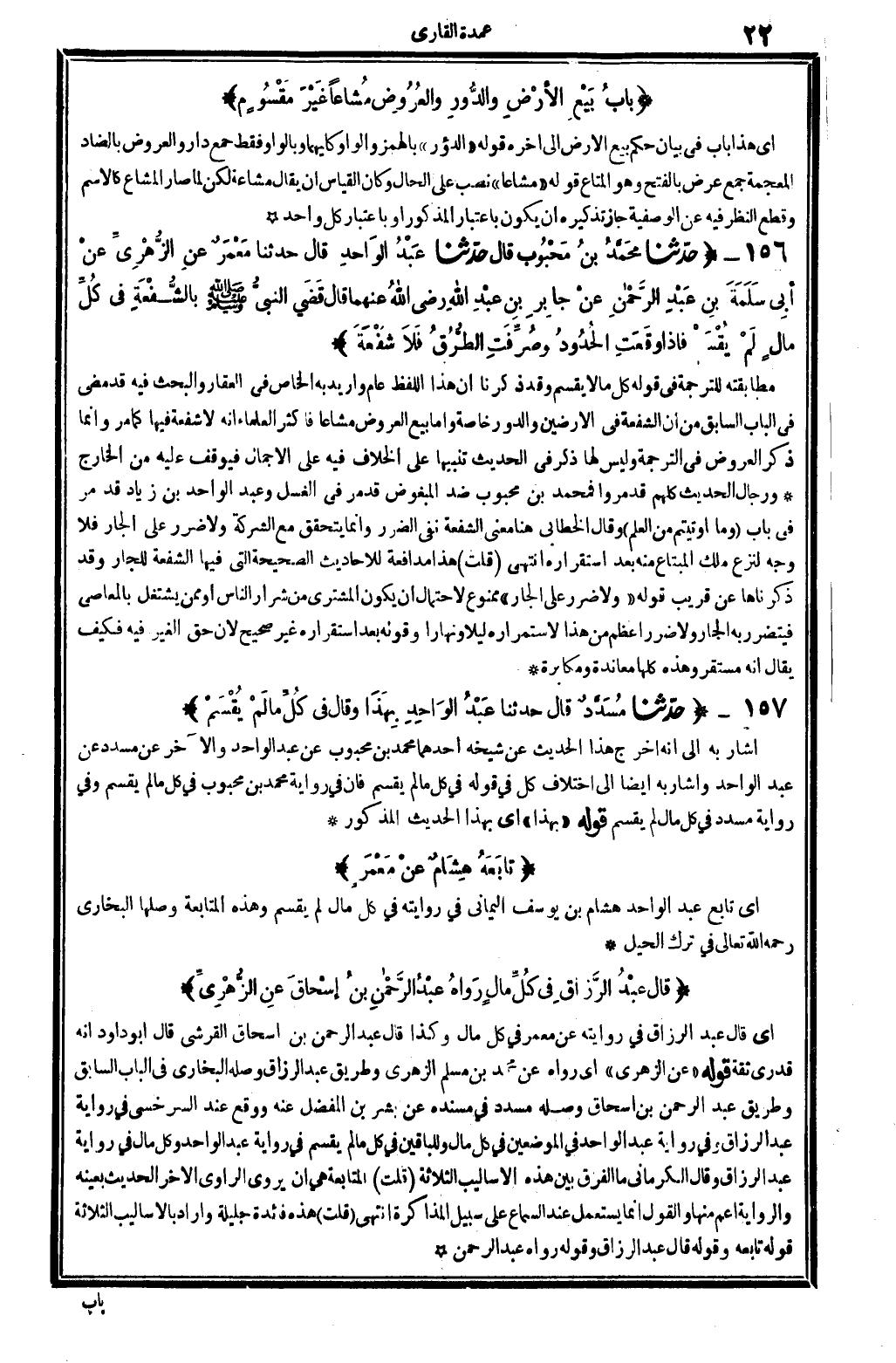 أَي: هَذَا بَاب فِي بَيَان حكم بيع الأَرْض ... إِلَى آخِره. قَوْله: (الدؤر) بِالْهَمْز وَالْوَاو كليهمَا بِالْوَاو فَقَط جمع دَار، وَالْعرُوض بالضاد الْمُعْجَمَة جمع عرض بِالْفَتْح، وَهُوَ الْمَتَاع. قَوْله: (مشَاعا) ، نصب على الْحَال، وَكَانَ الْقيَاس أَن يُقَال: مشاعة، لَكِن لما صَار: الْمشَاع كالاسم، وَقطع النّظر فِيهِ عَن الوصفية جَازَ تذكيره أَن يكون بِاعْتِبَار الْمَذْكُور أَو بِاعْتِبَار كل وَاحِد.