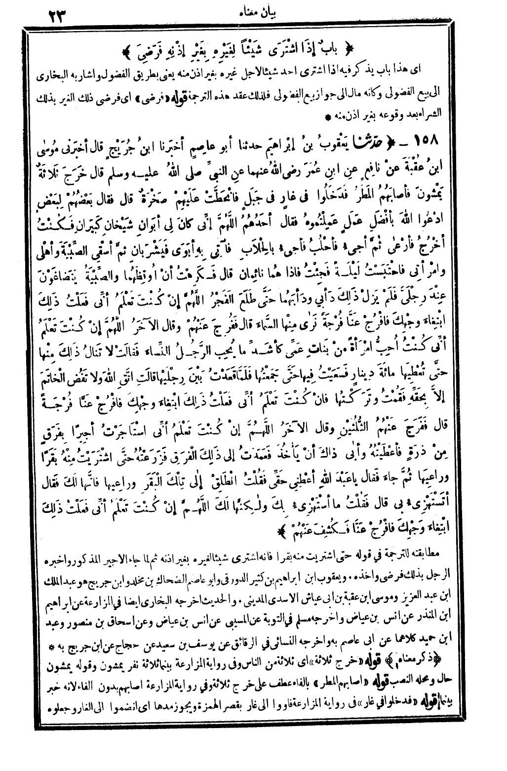 5122 - حدَّثنا يَعْقُوبُ بنُ إبْراهيم حدَّثنا أَبُو عاصِمٍ أخبرَنا ابنُ جُرَيْجٍ قَالَ أخبرَني مُوسى ابنُ عُقْبةَ عنْ نافِعٍ عنِ ابنِ عُمَرَ رَضِي الله تَعَالَى عَنْهُمَا عنِ النبيِّ صلى الله عَلَيْهِ وَسلم قَالَ خَرَجَ ثَلاثَةٌ يَمْشُونَ فأصَابَهُمُ المَطَرُ فدَخَلُوا فِي غارٍ فِي جَبَلً فانْحَطَّتْ عَلَيْهِمْ صَخْرَةٌ فَقَالَ بعضُهُمْ لِبَعْضٍ ادْعُوا الله بِأفْضَلِ عَمَلٍ عَمِلْتُمُوهُ فَقَالَ أحدُهُمْ اللَّهُمَّ إنِّي كانَ لِي أبَوَانِ شَيْخَانِ كبِيرانِ فكُنْتُ أخْرُجُ فأرْعَى ثُمَّ أجيءُ فأحْلُبُ فأجِيءُ بالحِلاَبِ فآتِي بِهِ أبَوَي فيَشْرَبانِ ثُمَّ أسْقِي الصِّبْيَةَ وأهْلِي وامْرَأتِي فاحْتَبَسْتُ لَيْلَةً فَجِئْتُ فإذَا هُمَا نائِمان قَالَ فَكَرِهْتُ أنْ أُوقِظَهُمَا والصِّبْيَةُ يتَضَاغَوْنَ عِنْدَ رِجْلَيَّ فلَمْ يَزَلْ ذَلِكَ دَأبِي ودَأبَهُمَا حَتَّى طلَعَ الفَجْرُ اللَّهُمَّ إنْ كُنْتَ تَعْلَمُ أنِّي فَعَلْتُ ذَلِكَ ابْتِغَاءَ وجْهِكَ فافْرُجْ عَنَّا فُرْجَةً نَراى مِنْهَا السَّماءَ قَالَ فَفُرِجَ عَنْهُمْ وَقَالَ الآخَرُ اللَّهُمَّ إنْ كُنْتَ تَعْلَمُ أنِّي كُنْتُ أُحِبُّ امْرَأةً منْ بناتِ عَمِّي كأشَدِّ مَا يُحِبُّ الرَّجُلُ النِّساءَ فقالَتْ لَا تَنالُ ذَلِكَ مِنْها حَتَّى تُعْطِيهَا مائَةَ دِينارٍ فسَعَيْتُ فِيها حتَّى جَمعْتُها فلَمَّا قَعدْتُ بَيْنَ رِجْلَيْهَا قالَتِ اتَّقِ الله ولاَ تَفُض الخَاتَمَ إلاَّ بِحَقِّهِ فقُمْتُ وتَرَكْتُهَا فإنْ كُنْتَ تَعْلَمُ أنِّي فَعَلْتُ ذَلِكَ ابْتِغَاءَ وجْهِكَ فافْرُجْ عَنَّا فُرْجَةً قَالَ ففَرَجَ عَنْهُمُ الثُّلْثَيْنِ وَقَالَ الآخَرُ اللَّهُمَّ إنْ كُنْتَ تَعْلَمُ أنِّي اسْتَأجَرْتُ أجِيرا بِفَرَقٍ مِنْ ذرَّةٍ فأعطيته وأبى ذَاك أنْ يأخُذَ فَعَمَدْتُ إِلَى ذالِكَ الْفَرْقِ فزَرَعْتُهُ حتَّى اشْتَرَيْتُ مِنْهُ بَقَرا وراعِيهَا ثُمَّ جاءَ فَقال يَا عَبْدَ الله أعْطِنِي حَقِّي فَقُلْتُ انْطَلِقْ إلاى تِلْكَ الْبَقَرِ وراعِيها فإنَّها لَكَ فقالَ أتَسْتَهْزِىءُ بِي فقُلْتُ مَا أسْتَهْزِيءُ بِكَ ولاكِنَّها لَكَ اللَّهُمَّ إنْ كُنْتَ تَعْلَمُ أنِّي فَعَلْتُ ذَلِكَ ابْتِغَاءَ وَجْهِكَ فافْرُجْ عَنَّا فَكُشِفَ عَنْهُمْ. .