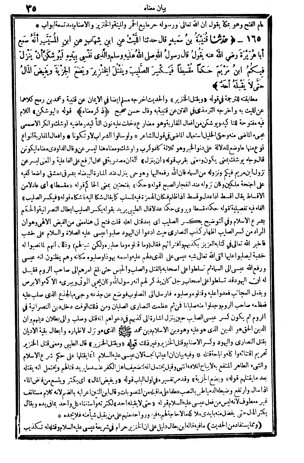 2222 - حدَّثنا قُتَيْبَةُ بنُ سَعِيدٍ قَالَ حدَّثنا اللَّيْثُ عنِ ابنِ شِهَابٍ عنِ ابنِ المُسَيَّبِ أنَّهُ سَمِعَ أبَا هُرَيْرَةَ رَضِي الله تَعَالَى عَنهُ يَقُولُ قَالَ رسولُ الله صلى الله عَلَيْهِ وَسلم والَّذِي نَفْسِي بيَدِهِ لَيُوشِكَنَّ أنْ يَنْزِلَ فِيكُمُ ابنُ مَرْيَمَ حَكما مُقْسِطا فيَكْسِرَ الصَّلِيبَ ويَقْتُلَ الخِنْزِيرَ ويَضَعَ الجِزْيَةَ ويَفِيضَ المالُ حَتَّى لاَ يَقْبَلَهُ أحدٌ. .