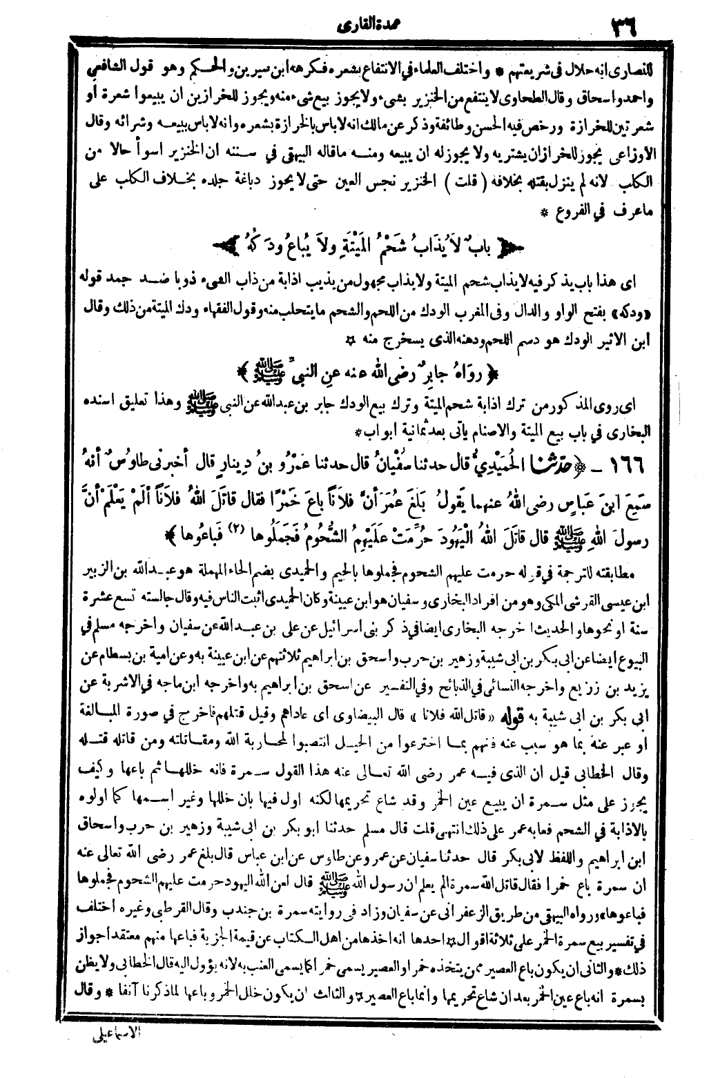 166 - (حَدثنَا الْحميدِي قَالَ حَدثنَا سُفْيَان قَالَ حَدثنَا عَمْرو بن دِينَار قَالَ أَخْبرنِي طَاوس أَنه سمع ابْن عَبَّاس رَضِي الله عَنْهُمَا يَقُول بلغ عمر أَن فلَانا بَاعَ خمرًا فَقَالَ قَاتل الله فلَانا ألم يعلم أَن رَسُول الله - صَلَّى اللَّهُ عَلَيْهِ وَسَلَّم َ - قَالَ قَاتل الله الْيَهُود حرمت عَلَيْهِم الشحوم فجملوها فَبَاعُوهَا) مطابقته للتَّرْجَمَة فِي قَوْله حرمت عَلَيْهِم الشحوم فجملوها بِالْجِيم والْحميدِي بِضَم الْحَاء الْمُهْملَة هُوَ عبد الله بن الزبير ابْن عِيسَى الْقرشِي الْمَكِّيّ وَهُوَ من أَفْرَاد البُخَارِيّ وسُفْيَان هُوَ ابْن عُيَيْنَة وَكَانَ الْحميدِي أثبت النَّاس وَفِيه وَقَالَ جالسته تسع عشرَة سنة أَو نَحْوهَا والْحَدِيث أخرجه البُخَارِيّ أَيْضا فِي ذكر بني إِسْرَائِيل عَن عَليّ بن عبد الله عَن سُفْيَان وَأخرجه مُسلم فِي الْبيُوع أَيْضا عَن أبي بكر بن أبي شيبَة وَزُهَيْر بن حَرْب واسحق بن إِبْرَاهِيم ثَلَاثَتهمْ عَن ابْن عُيَيْنَة بِهِ وَعَن أُميَّة بن بسطَام عَن يزِيد بن زُرَيْع وَأخرجه النَّسَائِيّ فِي الذَّبَائِح وَفِي التَّفْسِير عَن اسحق بن إِبْرَاهِيم بِهِ وَأخرجه ابْن ماجة فِي الْأَشْرِبَة عَن أبي بكر بن أبي شيبَة بِهِ قَوْله " قَاتل الله فلَانا " قَالَ الْبَيْضَاوِيّ أَي عاداهم وَقيل قَتلهمْ فَأخْرج فِي صُورَة الْمُبَالغَة أَو عبر عَنهُ بِمَا هُوَ سَبَب عَنهُ فَمنهمْ بِمَا اخترعوا من الْحِيَل انتصبوا لمحاربة الله ومقاتلته وَمن قَاتله قَتله وَقَالَ الْخطابِيّ قيل أَن الَّذِي فِيهِ عمر رَضِي الله تَعَالَى عَنهُ هَذَا القَوْل سَمُرَة فَإِنَّهُ خللها ثمَّ بَاعهَا وَكَيف يجوز على مثل سَمُرَة أَن يَبِيع عين الْخمر وَقد شاع تَحْرِيمهَا لكنه أول فِيهَا بِأَن خللها وَغير اسْمهَا كَمَا أولوه بالإذابة فِي الشَّحْم فعابه عمر على ذَلِك انْتهى قلت قَالَ مُسلم حَدثنَا أَبُو بكر بن أبي شيبَة وَزُهَيْر بن حَرْب وَإِسْحَاق بن إِبْرَاهِيم وَاللَّفْظ لأبي بكر قَالَ حَدثنَا سُفْيَان عَن عَمْرو وَعَن طَاوس عَن ابْن عَبَّاس قَالَ بلغ عمر رَضِي الله تَعَالَى عَنهُ أَن سَمُرَة بَاعَ خمرًا فَقَالَ قَاتل الله سَمُرَة ألم يعلم أَن رَسُول الله - صَلَّى اللَّهُ عَلَيْهِ وَسَلَّم َ - قَالَ لعن الله الْيَهُود حرمت عَلَيْهِم الشحوم فجملوها فَبَاعُوهَا " وَرَوَاهُ الْبَيْهَقِيّ من طَرِيق الزَّعْفَرَانِي عَن سُفْيَان وَزَاد فِي رِوَايَته سَمُرَة بن جُنْدُب وَقَالَ الْقُرْطُبِيّ وَغَيره اخْتلف فِي تَفْسِيره بيع سَمُرَة الْخمر على ثَلَاثَة أَقْوَال أَحدهمَا أَنه أَخذهَا من أهل الْكتاب عَن قيمَة الْجِزْيَة فَبَاعَهَا مِنْهُم مُعْتَقدًا جَوَاز ذَلِك وَالثَّانِي أَن يكون بَاعَ الْعصير مِمَّن يَتَّخِذهُ خمرًا والعصير يُسمى خمرًا كَمَا يُسمى الْعِنَب بِهِ لِأَنَّهُ يؤول إِلَيْهِ قَالَ الْخطابِيّ وَلَا يظنّ بسمرة أَنه بَاعَ عين الْخمر بعد أَن شاع تَحْرِيمهَا وَإِنَّمَا بَاعَ الْعصير وَالثَّالِث أَن يكون خلل الْخمر وباعها لما ذكرنَا آنِفا وَقَالَ
