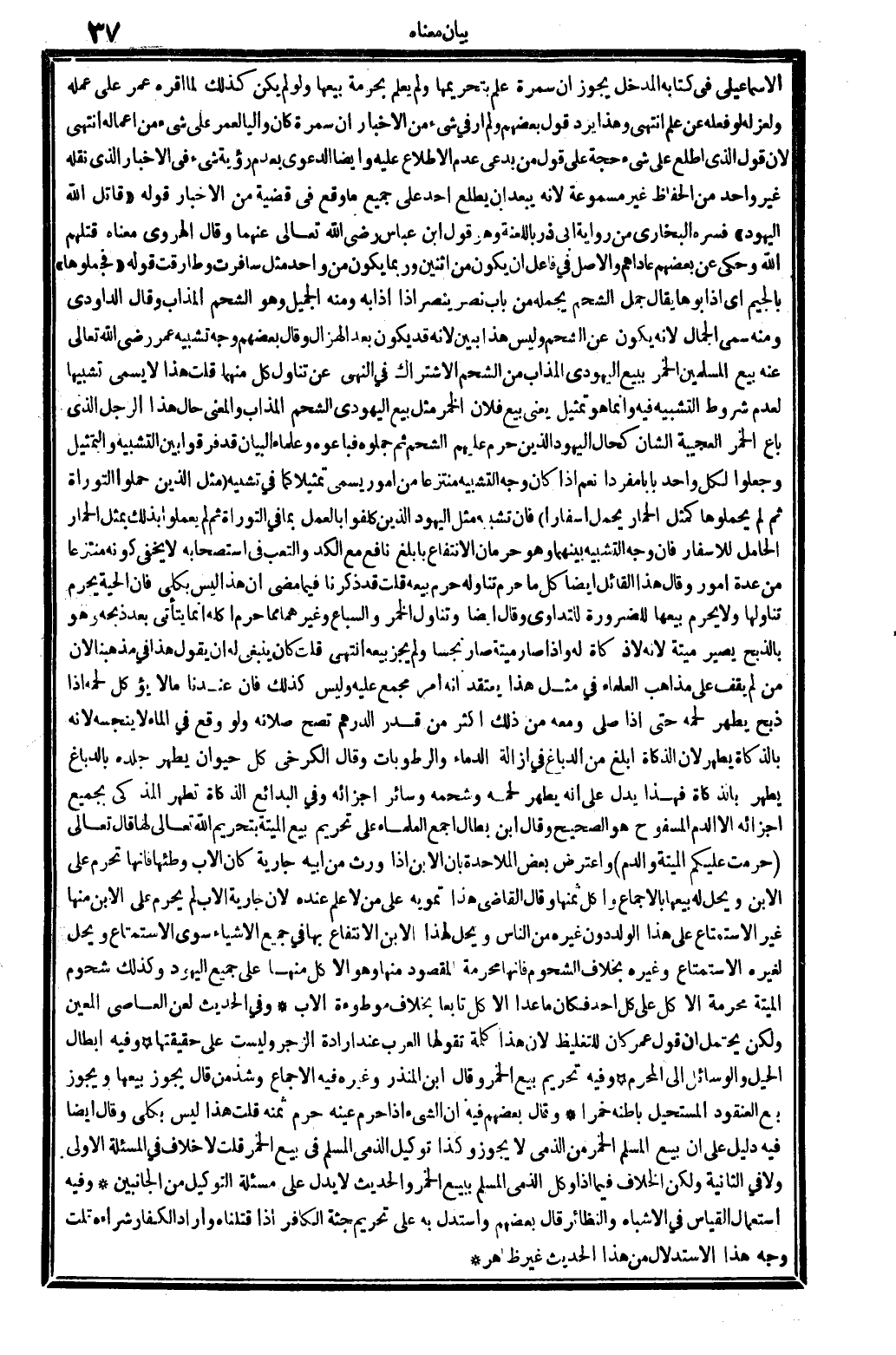 الْإِسْمَاعِيلِيّ فِي كِتَابه الْمدْخل يجوز أَن سَمُرَة علم بتحريمها وَلم يعلم بِحرْمَة بيعهَا وَلَو لم يكن كَذَلِك لما أقره عمر على عمله ولعزله لَو فعله عَن علم انْتهى وَهَذَا يرد قَول بَعضهم وَلم أر فِي شَيْء من الْأَخْبَار أَن سَمُرَة كَانَ واليا لعمر على شَيْء من أَعماله انْتهى لِأَن قَول الَّذِي اطلع على شَيْء حجَّة على قَول من يَدعِي عدم الِاطِّلَاع عَلَيْهِ وَأَيْضًا الدَّعْوَى بِعَدَمِ رُؤْيَة شَيْء فِي الْأَخْبَار الَّذِي نَقله غير وَاحِد من الْحفاظ غير مسموعة لِأَنَّهُ يبعد أَن يطلع أحد على جَمِيع مَا وَقع فِي قَضِيَّة من الْأَخْبَار قَوْله " قَاتل الله الْيَهُود " فسره البُخَارِيّ من رِوَايَة أبي ذَر باللعنة وَهُوَ قَول ابْن عَبَّاس رَضِي الله تَعَالَى عَنْهُمَا وَقَالَ الْهَرَوِيّ مَعْنَاهُ قَتلهمْ الله وَحكى عَن بَعضهم عاداهم وَالْأَصْل فِي فَاعل أَن يكون من اثْنَيْنِ وَرُبمَا يكون من وَاحِد مثل سَافَرت وطارقت قَوْله " فجملوها " بِالْجِيم أَي أذابوها يُقَال جمل الشَّحْم يجمله من بَاب نصر ينصر إِذا أذابه وَمِنْه الْجَمِيل وَهُوَ الشَّحْم الْمُذَاب وَقَالَ الدَّاودِيّ وَمِنْه سمى الْجمال لِأَنَّهُ يكون عَن الشَّحْم وَلَيْسَ هَذَا بَين لِأَنَّهُ قد يكون بعد الهزال وَقَالَ بَعضهم وَجه تَشْبِيه عمر رَضِي الله تَعَالَى عَنهُ بيع الْمُسلمين الْخمر بِبيع الْيَهُودِيّ الْمُذَاب من الشَّحْم الِاشْتِرَاك فِي النَّهْي عَن تنَاول كل مِنْهُمَا قلت هَذَا لَا يُسمى تَشْبِيها لعدم شُرُوط التَّشْبِيه فِيهِ وَإِنَّمَا هُوَ تَمْثِيل يَعْنِي بيع فلَان الْخمر مثل بيع الْيَهُودِيّ الشَّحْم الْمُذَاب وَالْمعْنَى حَال هَذَا الرجل الَّذِي بَاعَ الْخمر العجيبة الشَّأْن كَحال الْيَهُود الَّذين حرم عَلَيْهِم الشَّحْم ثمَّ جملوه فباعوه وعلماء الْبَيَان قد فرقوا بَين التَّشْبِيه والتمثيل وَجعلُوا لكل وَاحِد بَابا مُفردا نعم إِذا كَانَ وَجه التَّشْبِيه منتزعا من أُمُور يُسمى تمثيلا كَمَا فِي تَشْبِيه {مثل الَّذِي حملُوا التَّوْرَاة ثمَّ لم يحملوها كَمثل الْحمار يحمل أسفارا} فَإِن تَشْبِيه مثل الْيَهُود الَّذين كلفوا بِالْعَمَلِ بِمَا فِي التَّوْرَاة ثمَّ لم يعملوا بذلك بِمثل الْحمار الْحَامِل للأسفار فَإِن وَجه التَّشْبِيه بَينهمَا وَهُوَ حرمَان الِانْتِفَاع بأبلغ نَافِع مَعَ الكد والتعب فِي استصحابه لَا يخفى كَونه منتزعا من عدَّة أُمُور وَقَالَ هَذَا الْقَائِل أَيْضا كل مَا حرم تنَاوله حرم بَيْعه قلت قد ذكرنَا فِيمَا مضى أَن هَذَا لَيْسَ بكلي فَإِن الْحَيَّة يحرم تنَاولهَا وَلَا يحرم بيعهَا للضَّرُورَة للتداوي وَقَالَ أَيْضا وَتَنَاول الْخمر وَالسِّبَاع وَغَيرهمَا مِمَّا حرم أكله إِنَّمَا يَتَأَتَّى بعد ذبحه وَهُوَ بِالذبْحِ يصير ميتَة لِأَنَّهُ لَا ذَكَاة لَهُ وَإِذا صارة ميتَة صَار نجسا وَلم يجز بَيْعه انْتهى قلت كَانَ يَنْبَغِي لَهُ أَن يَقُول هَذَا فِي مَذْهَبنَا لِأَن من لم يقف على مَذَاهِب الْعلمَاء فِي مثل هَذَا يعْتَقد أَنه أَمر مجمع عَلَيْهِ وَلَيْسَ كَذَلِك فَإِن عندنَا مَا لَا يُؤْكَل لَحْمه إِذا ذبح يطهر لَحْمه حَتَّى إِذا صلى وَمَعَهُ من ذَلِك أَكثر من قدر الدِّرْهَم تصح صلَاته وَلَو وَقع فِي المَاء لَا يُنجسهُ لِأَنَّهُ بالذكاة يطهر لِأَن الذَّكَاة أبلغ من الدّباغ فِي إِزَالَة الدِّمَاء والرطوبات وَقَالَ الْكَرْخِي كل حَيَوَان يطهر جلده بالدباع يطهر بالذكاة فَهَذَا يدل على أَنه يطهر لَحْمه وشحمه وَسَائِر أَجْزَائِهِ وَفِي الْبَدَائِع الذَّكَاة تطهر المذكي بِجَمِيعِ أَجْزَائِهِ إِلَّا الدَّم المسفوح هُوَ الصَّحِيح وَقَالَ ابْن بطال أجمع الْعلمَاء على تَحْرِيم بيع الْميتَة بِتَحْرِيم الله تَعَالَى لَهَا قَالَ تَعَالَى {حرمت عَلَيْكُم الْميتَة وَالدَّم} وَاعْترض بعض الْمَلَاحِدَة بِأَن الابْن إِذ