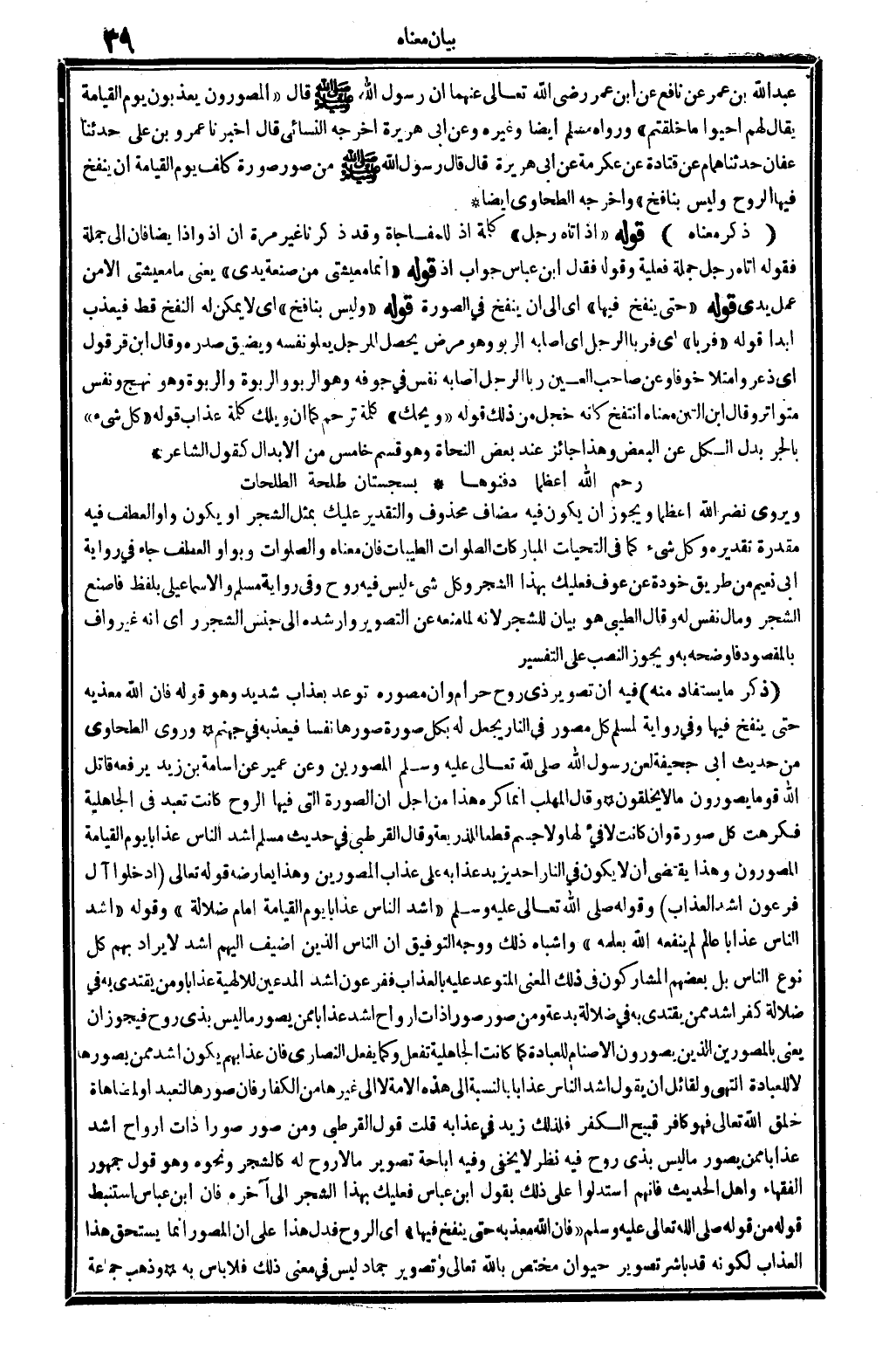 عبد الله بن عمر عَن نَافِع عَن ابْن عمر، رَضِي الله تَعَالَى عَنْهُمَا، أَن رَسُول الله صلى الله عَلَيْهِ وَسلم قَالَ: (المصورون يُعَذبُونَ يَوْم الْقِيَامَة، يُقَال لَهُم: أحيوا مَا خلقْتُمْ) ، وَرَوَاهُ مُسلم أَيْضا وَغَيره، وَعَن أبي هُرَيْرَة أخرجه النَّسَائِيّ قَالَ: أخبرنَا عَمْرو بن عَليّ حَدثنَا عَفَّان حَدثنَا همام عَن قَتَادَة عَن عِكْرِمَة عَن أبي هُرَيْرَة، قَالَ: قَالَ رَسُول الله صلى الله عَلَيْهِ وَسلم: (من صور صُورَة كلف يَوْم الْقِيَامَة أَن ينْفخ فِيهَا الرّوح، وَلَيْسَ بنافخ) . وَأخرجه الطَّحَاوِيّ أَيْضا.