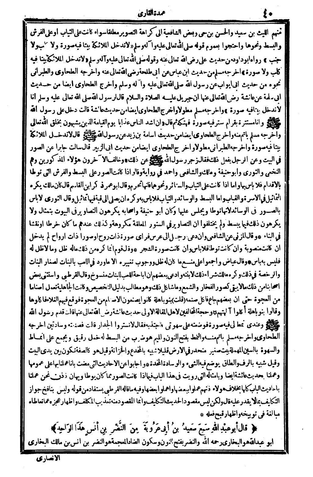 مِنْهُم اللَّيْث بن سعيد وَالْحسن بن حَيّ وَبَعض الشَّافِعِيَّة إِلَى كَرَاهَة التَّصْوِير مُطلقًا، سَوَاء كَانَت على الثِّيَاب أَو على الْفرش والبسط وَنَحْوهَا، وَاحْتَجُّوا بِعُمُوم قَوْله، صلى الله عَلَيْهِ وَسلم: (لَا تدخل الْمَلَائِكَة بَيْتا فِيهِ صُورَة وَلَا كلب وَلَا جنب) ، رَوَاهُ أَبُو دَاوُد من حَدِيث عَليّ، رَضِي الله تَعَالَى عَنهُ، وَقَوله، صلى الله عَلَيْهِ وَسلم: (لَا تدخل الْمَلَائِكَة بَيْتا فِيهِ كلب وَلَا صُورَة) ، أخرجه مُسلم من حَدِيث ابْن عَبَّاس عَن أبي طَلْحَة، وَأخرجه الطَّحَاوِيّ وَالطَّبَرَانِيّ نَحوه من حَدِيث أبي أَيُّوب عَن رَسُول الله، صلى الله عَلَيْهِ وَسلم، وَأخرج الطَّحَاوِيّ أَيْضا من حَدِيث أبي سَلمَة عَن عَائِشَة، رَضِي الله تَعَالَى عَنْهَا: (أَن جِبْرِيل، عَلَيْهِ الصَّلَاة وَالسَّلَام، قَالَ لرَسُول الله، صلى الله عَلَيْهِ وَسلم: إِنَّا لَا ندخل بَيْتا فِيهِ صُورَة) . وَأخرجه مُسلم مطولا. وَأخرج الطَّحَاوِيّ أَيْضا من حَدِيث عَائِشَة، قَالَت: دخل عليَّ رَسُول الله صلى الله عَلَيْهِ وَسلم وَأَنا مستترة بقرام ستر فِيهِ صُورَة فهتكه، ثمَّ قَالَ: (إِن أَشد النَّاس عذَابا يَوْم الْقِيَامَة الَّذين يشبهون بِخلق الله تَعَالَى) . وَأخرجه مُسلم بأتم مِنْهُ. وَأخرج الطَّحَاوِيّ أَيْضا من حَدِيث أُسَامَة بن زيد عَن رَسُول الله صلى الله عَلَيْهِ وَسلم، قَالَ: لَا تدخل الْمَلَائِكَة بَيْتا فِيهِ صُورَة. وَأخرجه الطَّبَرَانِيّ مطولا. وَأخرج الطَّحَاوِيّ أَيْضا من حَدِيث أبي الزبير: قَالَ: سَأَلت جَابِرا عَن الصُّور فِي الْبَيْت وَعَن الرجل يفعل ذَلِك؟ فَقَالَ: زجر رَسُول الله صلى الله عَلَيْهِ وَسلم عَن ذَلِك.
