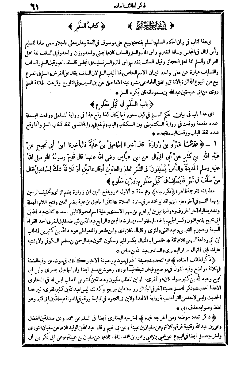 ذكر لطائف إِسْنَاده فِيهِ: التحديث بِصِيغَة الْجمع فِي مَوضِع وبصيغة الْإِخْبَار كَذَلِك فِي موضِعين. وَفِيه: العنعنة فِي ثَلَاثَة مَوَاضِع. وَفِيه: القَوْل فِي مَوضِع. وَفِيه: أَن شَيْخه نيسابوري وَهُوَ شيخ مُسلم أَيْضا وَأَن إِسْمَاعِيل بَصرِي وَابْن أبي نجيح وَعبد الله بن كثير، سَوَاء كَانَ هُوَ المقرىء أَو ابْن الْمطلب، مكيون، وَعبد الله بن كثير بن الْمطلب لَيْسَ لَهُ فِي البُخَارِيّ إلاَّ هَذَا الحَدِيث، وَذكر لَهُ مُسلم حَدِيثا آخر فِي الْجَنَائِز رَوَاهُ عَنهُ ابْن جريج، وَكَذَلِكَ لَيْسَ لعبد الله بن كثير المقرىء غير هَذَا الحَدِيث، وَلَيْسَ لأحد من الْقُرَّاء السَّبْعَة رِوَايَة إلاَّ لهَذَا وَلابْن أبي النجُود فِي الْمُبَايعَة، وَوَقع فِي (الْمُدَوَّنَة) : عبد الله بن أبي كثير، وَهُوَ غلط وَصَوَابه حذف: أبي.