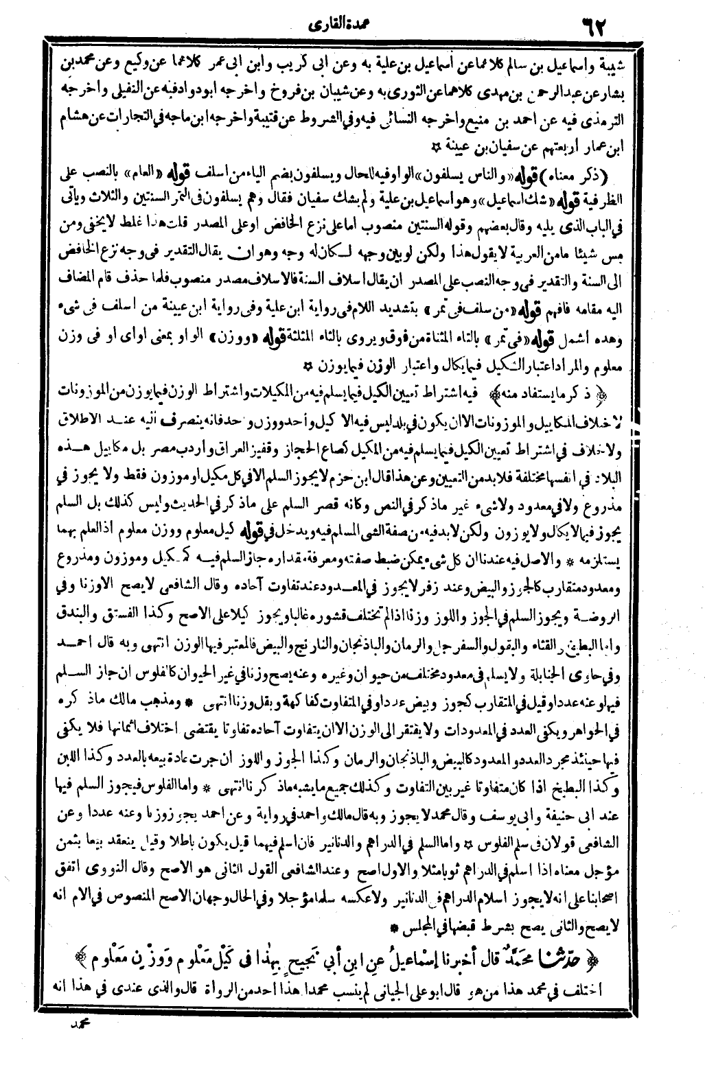 ذكر مَا يُسْتَفَاد مِنْهُ فِيهِ: اشْتِرَاط تعْيين الْكَيْل فِيمَا يسلم فِيهِ من المكيلات، وَاشْتِرَاط الْوَزْن فِيمَا يُوزن من الموزونات لاخْتِلَاف المكاييل والموزونات، إلاَّ أَن يكون فِي بلد لَيْسَ فِيهِ إلاَّ كيل وَاحِد وَوزن وَاحِد فَإِنَّهُ ينْصَرف إِلَيْهِ عِنْد الْإِطْلَاق، وَلَا خلاف فِي اشْتِرَاط تعْيين الْكَيْل فِيمَا يسلم فِيهِ من الْمكيل، كصاع الْحجاز وقفيز الْعرَاق وإردب مصر، بل مكاييل هَذِه الْبِلَاد فِي أَنْفسهَا مُخْتَلفَة، فَلَا بُد من التعين. وَعَن هَذَا قَالَ ابْن حزم: لَا يجوز السّلم إلاَّ فِي مَكِيل أَو مَوْزُون فَقَط، وَلَا يجوز فِي مذروع وَلَا فِي مَعْدُود وَلَا شَيْء غير مَا ذكر فِي النَّص، وَكَأَنَّهُ قصر السّلم على مَا ذكر فِي الحَدِيث، وَلَيْسَ كَذَلِك بل السّلم يجوز فِيمَا لَا يُكَال وَلَا يوزون، وَلَكِن لَا بُد فِيهِ من صفة الشَّيْء الْمُسلم فِيهِ وَيدخل فِي قَوْله: كيل مَعْلُوم وَوزن مَعْلُوم، إِذْ الْعلم بهما يستلزمه.
