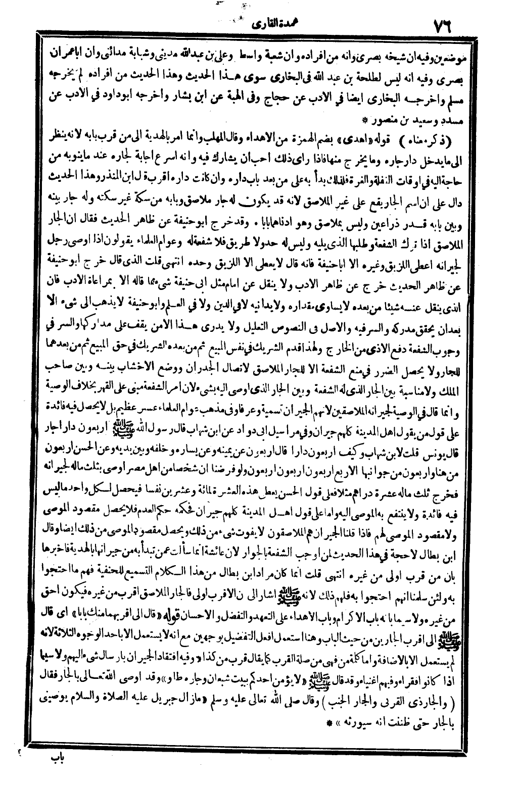 موضِعين. وَفِيه: أَن شَيْخه بَصرِي وَأَنه من أَفْرَاده، وَأَن شُعْبَة واسطي وَعلي بن عبد الله مديني وشبابة مدائني، وَأَن أَبَا عمرَان بَصرِي. وَفِيه: أَنه لَيْسَ لطلْحَة بن عبد الله فِي البُخَارِيّ سوى هَذَا الحَدِيث.