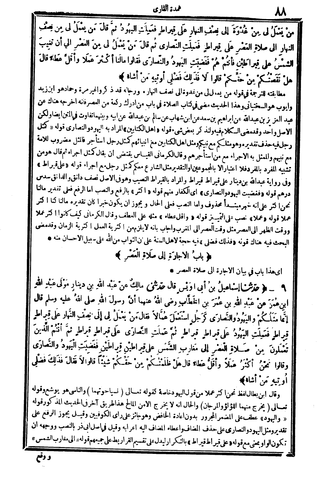 9622 - حدَّثنا إسماعِيلُ بنُ أبِي أوَيْسٍ قَالَ حدَّثني مالِكٌ عنْ عَبْدِ الله بنِ دينارٍ مَوْلَى عَبْدِ الله ابنِ عُمَرَ عنْ عَبْدِ الله بنِ عُمَرَ بنِ الخَطَّابِ رَضِي الله تَعَالَى عَنْهُمَا أنَّ رسولَ الله صلى الله عَلَيْهِ وَسلم قَالَ إنَّما مَثَلُكُمْ واليَهُودُ والنَّصارَى كَرَجُلٍ اسْتَعْمَلَ عُمَّالاً فقالَ منْ يَعْمَلُ لِي نِصْفَ النَّهارِ علَى قِيراطٍ قِيراطٍ فعَمِلَتِ اليَهُودُ علَى قِيراطٍ قيراطٍ ثُمَّ عَملَتِ النَّصارَى علَى قيراطٍ قيراطٍ ثُمَّ أنْتُمْ الَّذِينَ تَعْمَلُونَ مِنْ صَلاةِ العَصْرِ إلَى مغَارِبِ الشِّمْسِ على قِيراطَيْنِ قيرَاطَيْنِ فغَضِبَتِ الْيَهُودُ والنَّصَارَى وَقَالُوا نَحْنُ أكْثَرُ عَمَلاً وأقَلُّ عَطاءً قَالَ هَلْ ظَلَمْتُكُمْ مِنْ حَقِّكُمْ شَيْئا قَالُوا لاَ فقالَ فذَلِكَ فَضْلِي أُوتِيهِ مَنْ أشَاءُ. .