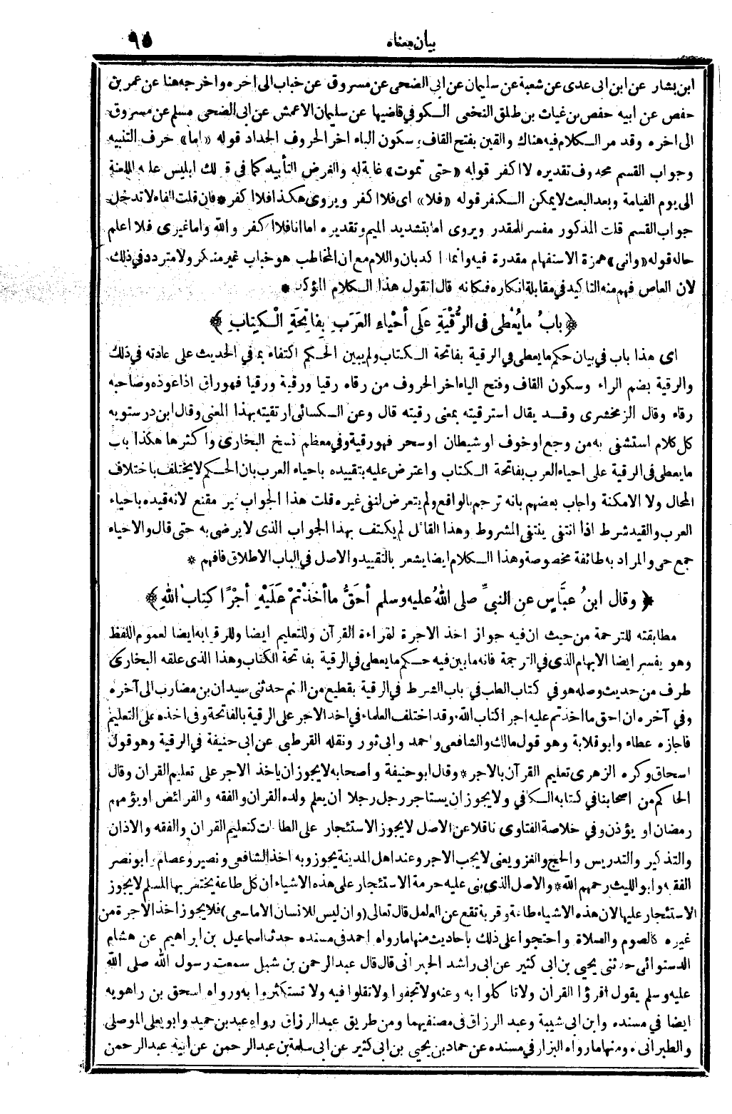 وَقد اخْتلف الْعلمَاء فِي أَخذ الْأجر على الرّقية بِالْفَاتِحَةِ، وَفِي أَخذه على التَّعْلِيم، فَأَجَازَهُ عَطاء وَأَبُو قلَابَة، وَهُوَ قَول مَالك وَالشَّافِعِيّ وَأحمد وَأبي ثَوْر، وَنَقله الْقُرْطُبِيّ عَن أبي حنيفَة فِي الرّقية، وَهُوَ قَول إِسْحَاق. وَكره الزُّهْرِيّ تَعْلِيم الْقُرْآن بِالْأَجْرِ. وَقَالَ أَبُو حنيفَة وَأَصْحَابه: لَا يجوز أَن يَأْخُذ الْأجر على تَعْلِيم الْقُرْآن، وَقَالَ الْحَاكِم من أَصْحَابنَا فِي كِتَابه (الْكَافِي) : وَلَا يجوز أَن يسْتَأْجر رجل رجلا أَن يعلم وَلَده الْقُرْآن وَالْفِقْه والفرائض أَو يؤمهم رَمَضَان أَو يُؤذن، وَفِي (خُلَاصَة الْفَتَاوَى) نَاقِلا عَن الأَصْل: لَا يجوز الِاسْتِئْجَار على الطَّاعَات كتعليم الْقُرْآن وَالْفِقْه وَالْأَذَان والتذكير والتدريس وَالْحج والغزو، يَعْنِي: لَا يجب الْأجر، وَعند أهل الْمَدِينَة: يجوز، وَبِه أَخذ الشَّافِعِي ونصير وعصام، وَأَبُو نصر الْفَقِيه وَأَبُو اللَّيْث رَحِمهم الله. وَالْأَصْل الَّذِي بنى عَلَيْهِ حُرْمَة الِاسْتِئْجَار على هَذِه الْأَشْيَاء: أَن كل طَاعَة يخْتَص بهَا الْمُسلم لَا يجوز الِاسْتِئْجَار عَلَيْهَا، لِأَن هَذِه الْأَشْيَاء طَاعَة وقربة تقع على الْعَامِل. قَالَ تَعَالَى: {وَأَن لَيْسَ للْإنْسَان إلاَّ مَا سعى} (النَّجْم: 93) . فَلَا يجوز أَخذ الْأُجْرَة من غَيره كَالصَّوْمِ وَالصَّلَاة، وَاحْتَجُّوا على ذَلِك بِأَحَادِيث: مِنْهَا: مَا رَوَاهُ أَحْمد فِي (مُسْنده) : حَدثنَا إِسْمَاعِيل بن إِبْرَاهِيم عَن هِشَام الدستوَائي حَدثنِي يحى بن أبي كثير عَن أبي رَاشد الحبراني قَالَ: قَالَ عبد الرَّحْمَن بن شبْل: سَمِعت رَسُول الله، صلى الله عَلَيْهِ وَسلم، يَقُول: إقرأوا الْقُرْآن وَلَا تَأْكُلُوا بِهِ، وَعنهُ: وَلَا تجفوا وَلَا تقلوا فِيهِ وَلَا تَسْتَكْثِرُوا بِهِ، وَرَوَاهُ إِسْحَاق بن رَاهَوَيْه أَيْضا فِي (مُسْنده) وَابْن أبي شيبَة وَعبد الرَّزَّاق فِي (مصنفيهما) . وَمن طَرِيق عبد الرَّزَّاق رَوَاهُ عبد بن حميد وَأَبُو يعلى الْموصِلِي وَالطَّبَرَانِيّ. وَمِنْهَا: مَا رَوَاهُ الْبَزَّار فِي (مُسْنده) عَن حَمَّاد بن يحيى بن أبي كثير عَن أبي سَلمَة بن عبد الرَّحْمَن عَن أَبِيه عبد الرَّحْمَن