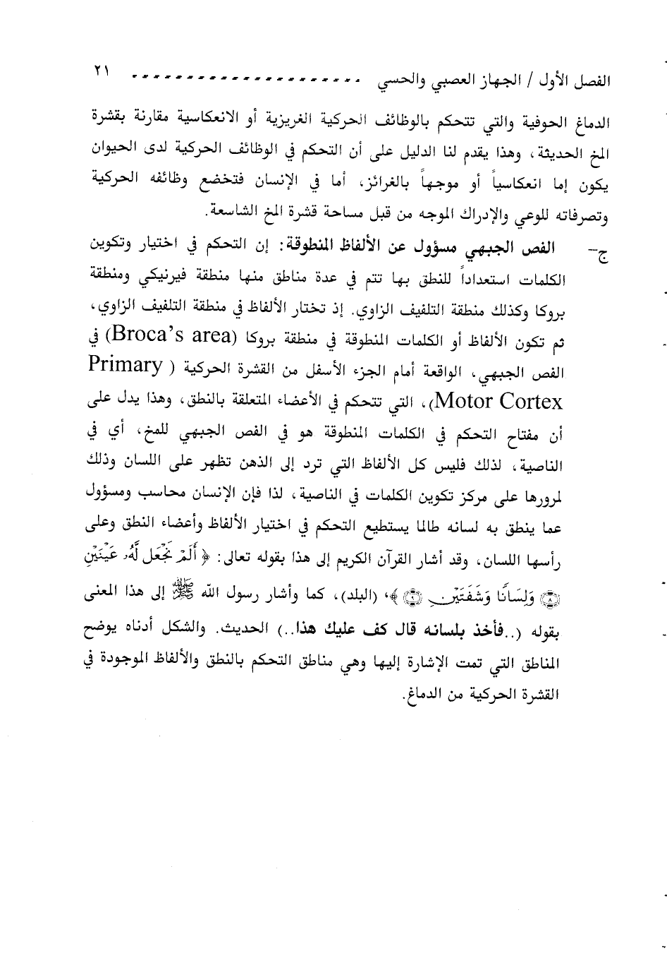 إن التحكم في اختيار وتكوين الكلمات استعدادا للنطق بها تتم في عدة مناطق منها منطقة فيرنيكي ومنطقة بروكا وكذلك منطقة التلفيف الزاوي. إذ تختار الألفاظ في منطقة التلفيف الزاوي، ثم تكون الألفاظ أو الكلمات المنطوقة في منطقة بروكا ( Broca ,s area) في الفص الجبهي، الواقعة أمام الجزء الأسفل من القشرة الحركية ( Primary Motor Cortex)، التي تتحكم في الأعضاء المتعلقة بالنطق، وهذا يدل على أن مفتاح التحكم في الكلمات المنطوقة هو في الفص الجبهي للمخ، أي في الناصية، لذلك فليس كل الألفاظ التي ترد إلى الذهن تظهر على اللسان وذلك لمرورها على مركز تكوين الكلمات في الناصية، لذا فإن الإنسان محاسب ومسئول عما ينطق به لسانه طالما يستطيع التحكم في اختيار الألفاظ وأعضاء النطق وعلى رأسها اللسان، وقد أشار القرآن الكريم إلى هذا بقوله تعالى: أَلَمْ نَجْعَلْ لَهُ عَيْنَيْنِ (8) ولِساناً وشَفَتَيْنِ (9)، (البلد)، كما وأشار رسول اللّه صلّى اللّه عليه وسلّم إلى هذا المعنى بقوله ( .. فأخذ بلسانه قال كف عليك هذا .. ) الحديث. والشكل أدناه يوضح المناطق التي تمت الإشارة إليها وهي مناطق التحكم بالنطق والألفاظ الموجودة في القشرة الحركية من الدماغ.