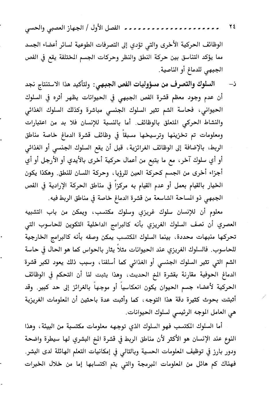 معلوم أن للإنسان سلوك غريزي وسلوك مكتسب، ويمكن من باب التشبيه العصري أن نصف السلوك الغريزي بأنه كالبرامج الداخلية التكوين للحاسوب التي تحركها منبهات محددة، بينما السلوك المكتسب يمكن وصفه بأنه كالبرامج الخارجية للحاسوب. فالسلوك الغريزي عند الحيوانات مثلا يثار بالحواس كما هو الحال في حاسة الشم التي تثير السلوك الجنسي أو الغذائي كما أسلفنا، وسبب ذلك يعود لكبر قشرة الدماغ الحوفية مقارنة بقشرة المخ الحديث، وهذا يثبت لنا أن التحكم في الوظائف الحركية لأعضاء جسم الحيوان يكون انعكاسيا أو موجها بالغرائز إلى حد كبير. وقد أثبتت بحوث كثيرة دقة هذا التوجه، كما وأثبت عدة باحثين أن المعلومات الغريزية هي العامل الموجه الرئيسي لسلوك الحيوانات.