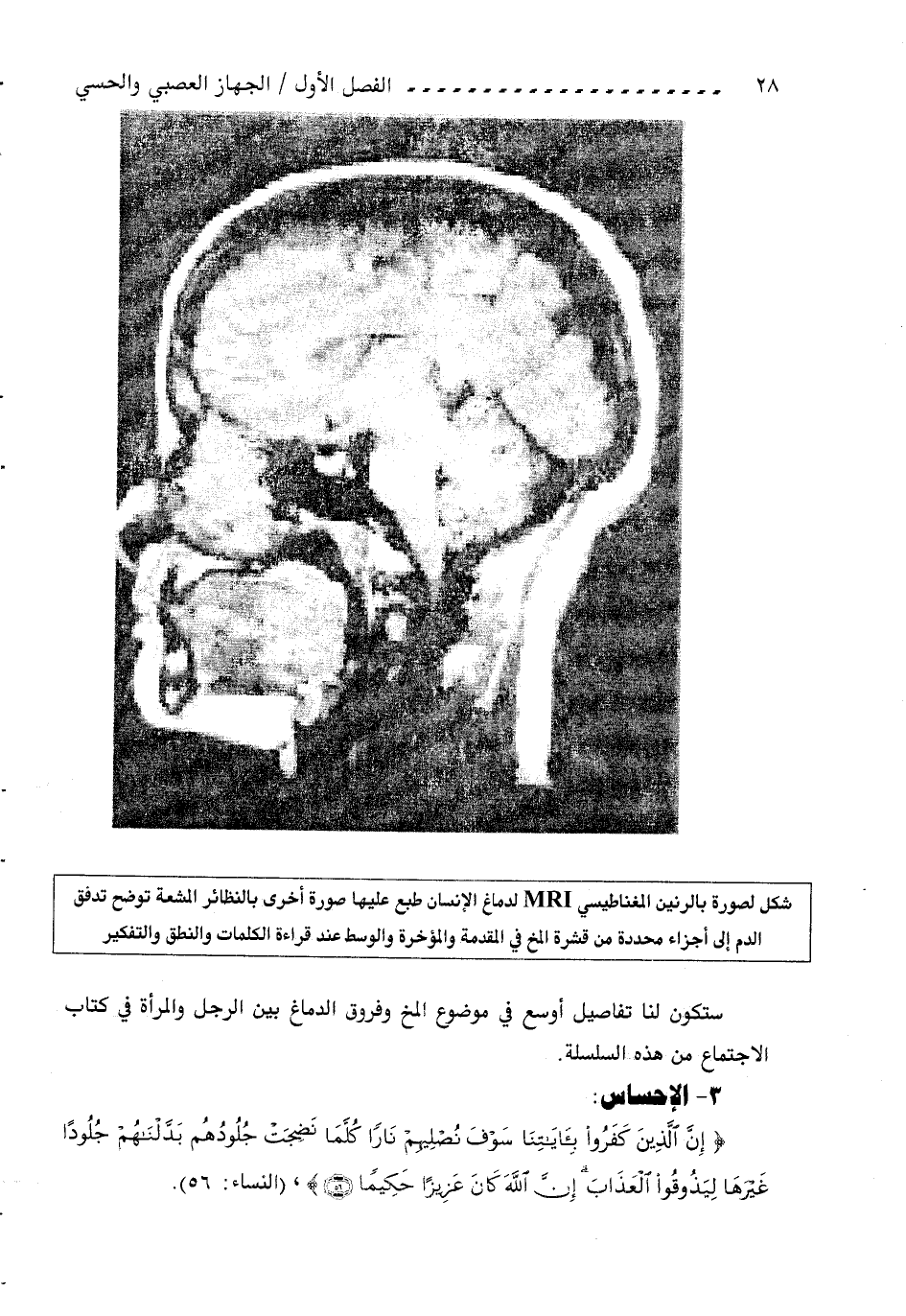 شكل لصورة بالرنين المغناطيسي MRi لدماغ الإنسان طبع عليها صورة أخرى بالنظائر المشعة توضح تدفق الدم إلى أجزاء محددة من قشرة المخ في المقدمة والمؤخرة والوسط عند قراءة الكلمات والنطق والتفكير ستكون لنا تفاصيل أوسع في موضوع المخ وفروق الدماغ بين الرجل والمرأة في كتاب الاجتماع من هذه السلسلة.