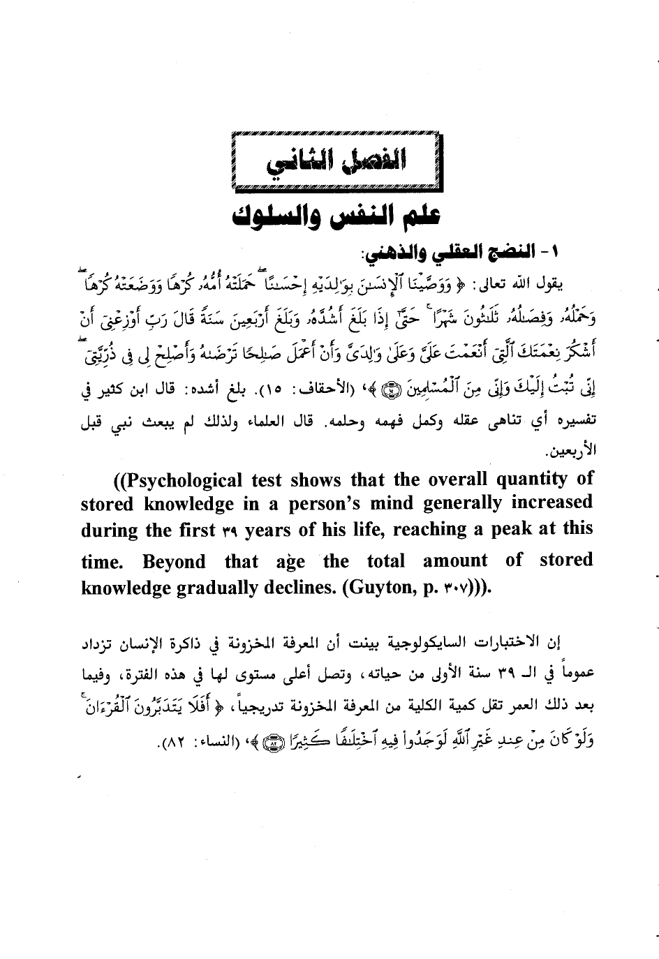 إن الاختبارات السايكولوجية بينت أن المعرفة المخزونة في ذاكرة الإنسان تزداد عموما في ال 39 سنة الأولى من حياته، وتصل أعلى مستوى لها في هذه الفترة، وفيما بعد ذلك العمر تقل كمية الكلية من المعرفة المخزونة تدريجيا، أَفَلا يَتَدَبَّرُونَ الْقُرْآنَ ولَوْ كانَ مِنْ عِنْدِ غَيْرِ اللَّهِ لَوَجَدُوا فِيهِ اخْتِلافاً كَثِيراً (82)، (النساء: 82).