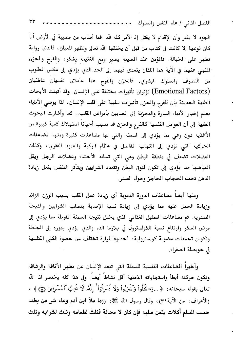 وأخيرا المضاعفات النفسية للسمنة التي تبعد الإنسان عن مظهر الأناقة والرشاقة وتكون حركته أبطأ واستجاباته الذهنية أقل نشاطا أيضا. وفي هذا كله يختصر لنا اللّه تعالى بقوله سبحانه: ... وكُلُوا واشْرَبُوا ولا تُسْرِفُوا إِنَّهُ لا يُحِبُّ الْمُسْرِفِينَ (31)، (الأعراف: من الآية 31)، وقال رسول اللّه صلّى اللّه عليه وسلّم: ((ما ملأ ابن آدم وعاء شر من بطنه حسب المسلم أكلات يقمن صلبه فإن كان لا محالة فثلث لطعامه وثلث لشرابه وثلث