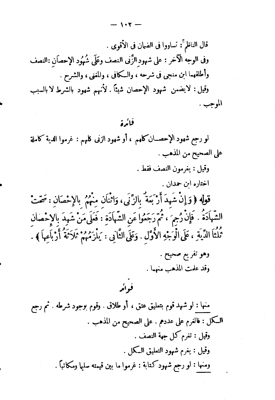 قَوْلُهُ (وَإِنْ شَهِدَ أَرْبَعَةٌ بِالزِّنَى، وَاثْنَانِ مِنْهُمْ بِالْإِحْصَانِ: صَحَّتْ الشَّهَادَةُ. فَإِنْ رُجِمَ، ثُمَّ رَجَعُوا عَنْ الشَّهَادَةِ: فَعَلَى مَنْ شَهِدَ بِالْإِحْصَانِ ثُلُثَا الدِّيَةِ، عَلَى الْوَجْهِ الْأَوَّلِ. وَعَلَى الثَّانِي: يَلْزَمُهُمْ ثَلَاثَةُ أَرْبَاعِهَا) . وَهُوَ تَفْرِيعٌ صَحِيحٌ. وَقَدْ عَلِمْت الْمَذْهَبَ مِنْهُمَا. فَوَائِدُ