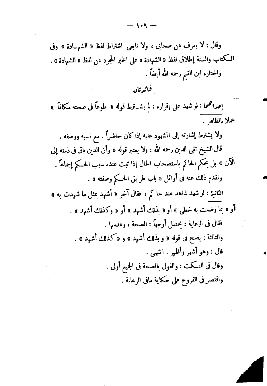 وَقَالَ: لَا يُعْرَفُ عَنْ صَحَابِيٍّ، وَلَا تَابِعِيٍّ اشْتِرَاطُ لَفْظِ " الشَّهَادَةِ " وَفِي الْكِتَابِ وَالسُّنَّةِ إطْلَاقُ لَفْظِ " الشَّهَادَةِ " عَلَى الْخَبَرِ الْمُجَرَّدِ عَنْ لَفْظِ " الشَّهَادَةِ ". وَاخْتَارَهُ ابْنُ الْقَيِّمِ - رَحِمَهُ اللَّهُ - أَيْضًا. فَائِدَتَانِ