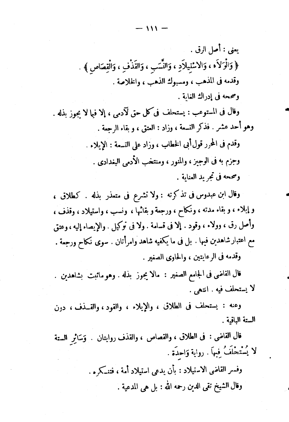يَعْنِي: أَصْلَ الرِّقِّ. (وَالْوَلَاءِ، وَالِاسْتِيلَادِ، وَالنَّسَبِ، وَالْقَذْفِ، وَالْقِصَاصِ) . وَقَدَّمَهُ فِي الْمُذْهَبِ، وَمَسْبُوكِ الذَّهَبِ، وَالْخُلَاصَةِ. وَصَحَّحَهُ فِي إدْرَاكِ الْغَايَةِ. وَقَالَ فِي الْمُسْتَوْعِبِ: يُسْتَحْلَفُ فِي كُلِّ حَقٍّ لِآدَمِيٍّ، إلَّا فِيمَا لَا يَجُوزُ بَذْلُهُ. وَهُوَ أَحَدَ عَشَرَ. فَذَكَرَ التِّسْعَةَ، وَزَادَ: الْعِتْقَ وَبَقَاءَ الرَّجْعَةِ. وَقَدَّمَ فِي الْمُحَرَّرِ قَوْلَ أَبِي الْخَطَّابِ، وَزَادَ عَلَى التِّسْعَةِ: الْإِيلَاءَ. وَجَزَمَ بِهِ فِي الْوَجِيزِ، وَالْمُنَوِّرِ، وَمُنْتَخَبِ الْأَدَمِيِّ الْبَغْدَادِيِّ. وَصَحَّحَهُ فِي تَجْرِيدِ الْعِنَايَةِ. وَقَالَ ابْنُ عَبْدُوسٍ فِي تَذْكِرَتِهِ: وَلَا تُشْرَعُ فِي مُتَعَذِّرٍ بَذْلَهُ. كَطَلَاقٍ، وَإِيلَاءٍ، وَبَقَاءِ مُدَّتِهِ، وَنِكَاحٍ، وَرَجْعَةٍ وَبَقَائِهَا، وَنَسَبٍ، وَاسْتِيلَادٍ، وَقَذْفٍ، وَأَصْلِ رِقٍّ، وَوَلَاءٍ، وَقَوَدٍ. إلَّا فِي قَسَامَةٍ. وَلَا فِي تَوْكِيلٍ. وَالْإِيصَاءِ إلَيْهِ، وَعِتْقٍ مَعَ اعْتِبَارِ شَاهِدَيْنِ فِيهَا. بَلْ فِي مَا يَكْفِيهِ شَاهِدٌ وَامْرَأَتَانِ. سِوَى نِكَاحٍ وَرَجْعَةٍ. وَقَدَّمَهُ فِي الرِّعَايَتَيْنِ، وَالْحَاوِي الصَّغِيرِ. قَالَ الْقَاضِي فِي الْجَامِعِ الصَّغِيرِ: مَا لَا يَجُوزُ بَذْلُهُ. وَهُوَ مَا ثَبَتَ بِشَاهِدَيْنِ. لَا يُسْتَحْلَفُ فِيهِ. انْتَهَى. وَعَنْهُ: يُسْتَحْلَفُ فِي الطَّلَاقِ، وَالْإِيلَاءِ، وَالْقَوَدِ، وَالْقَذْفِ، دُونَ السِّتَّةِ الْبَاقِيَةِ. قَالَ الْقَاضِي: فِي الطَّلَاقِ، وَالْقِصَاصِ، وَالْقَذْفِ رِوَايَتَانِ. وَسَائِرِ السِّتَّةِ لَا يُسْتَحْلَفُ فِيهَا. رِوَايَةً وَاحِدَةً. وَفَسَّرَ الْقَاضِي الِاسْتِيلَادَ: بِأَنْ يَدَّعِيَ، اسْتِيلَادَ أَمَةٍ، فَتُنْكِرُهُ. وَقَالَ الشَّيْخُ تَقِيُّ الدِّينِ - رَحِمَهُ اللَّهُ -: بَلْ هِيَ الْمُدَّعِيَةُ.
