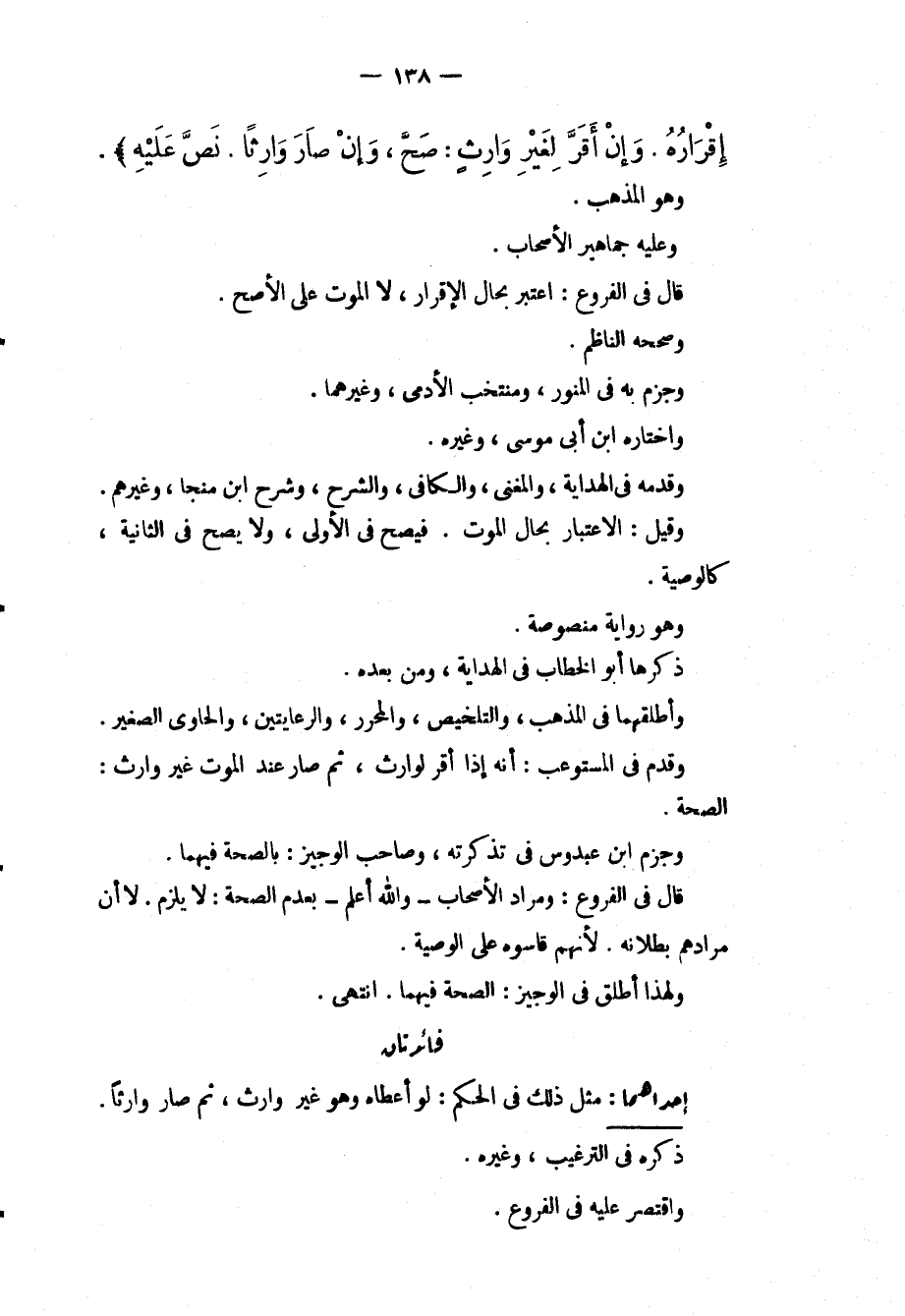 إقْرَارُهُ. وَإِنْ أَقَرَّ لِغَيْرِ وَارِثٍ: صَحَّ، وَإِنْ صَارَ وَارِثًا. نَصَّ عَلَيْهِ) . وَهُوَ الْمَذْهَبُ. وَعَلَيْهِ جَمَاهِيرُ الْأَصْحَابِ. قَالَ فِي الْفُرُوعِ: اُعْتُبِرَ بِحَالِ الْإِقْرَارِ، لَا الْمَوْتِ عَلَى الْأَصَحِّ. وَصَحَّحَهُ النَّاظِمُ. وَجَزَمَ بِهِ فِي الْمُنَوِّرِ، وَمُنْتَخَبِ الْأَدَمِيِّ، وَغَيْرِهِمَا. وَاخْتَارَهُ ابْنُ أَبِي مُوسَى، وَغَيْرُهُ. وَقَدَّمَهُ فِي الْهِدَايَةِ، وَالْمُغْنِي، وَالْكَافِي، وَالشَّرْحِ، وَشَرْحِ ابْنِ مُنَجَّا، وَغَيْرِهِمْ. وَقِيلَ: الِاعْتِبَارُ بِحَالِ الْمَوْتِ. فَيَصِحُّ فِي الْأُولَى، وَلَا يَصِحُّ فِي الثَّانِيَةِ كَالْوَصِيَّةِ. وَهُوَ رِوَايَةٌ مَنْصُوصَةٌ. ذَكَرَهَا أَبُو الْخَطَّابِ فِي الْهِدَايَةِ، وَمَنْ بَعْدَهُ. وَأَطْلَقَهُمَا فِي الْمُذْهَبِ، وَالتَّلْخِيصِ، وَالْمُحَرَّرِ، وَالرِّعَايَتَيْنِ، وَالْحَاوِي الصَّغِيرِ. وَقَدَّمَ فِي الْمُسْتَوْعِبِ: أَنَّهُ إذَا أَقَرَّ لِوَارِثٍ، ثُمَّ صَارَ عِنْدَ الْمَوْتِ غَيْرَ وَارِثٍ: الصِّحَّةَ. وَجَزَمَ ابْنُ عَبْدُوسٍ فِي تَذْكِرَتِهِ، وَصَاحِبُ الْوَجِيزِ: بِالصِّحَّةِ فِيهِمَا. قَالَ فِي الْفُرُوعِ: وَمُرَادُ الْأَصْحَابِ وَاَللَّهُ أَعْلَمُ بِعَدَمِ الصِّحَّةِ: لَا يَلْزَمُ. لَا أَنَّ مُرَادَهُمْ بُطْلَانُهُ. لِأَنَّهُمْ قَاسُوهُ عَلَى الْوَصِيَّةِ. وَلِهَذَا أَطْلَقَ فِي الْوَجِيزِ: الصِّحَّةَ فِيهِمَا. انْتَهَى. فَائِدَتَانِ