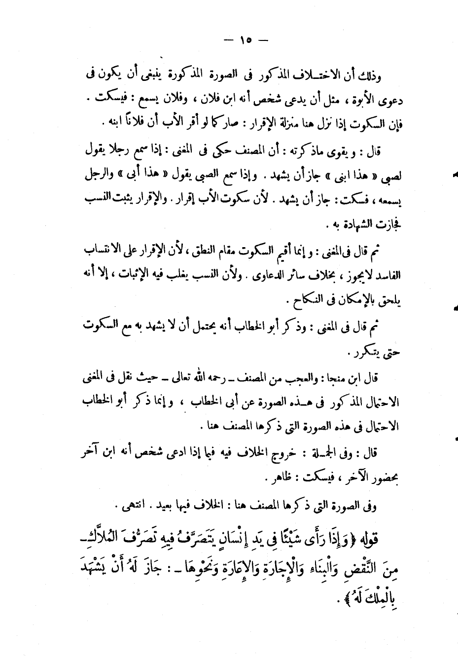 وَذَلِكَ أَنَّ الِاخْتِلَافَ الْمَذْكُورَ فِي الصُّورَةِ الْمَذْكُورَةِ يَنْبَغِي أَنْ يَكُونَ فِي دَعْوَى الْأُبُوَّةِ، مِثْلُ أَنْ يَدَّعِيَ شَخْصٌ أَنَّهُ ابْنُ فُلَانٍ، وَفُلَانٌ يَسْمَعُ: فَيَسْكُتُ، فَإِنَّ السُّكُوتَ إذًا نُزِّلَ هُنَا مَنْزِلَةَ الْإِقْرَارِ: صَارَ كَمَا لَوْ أَقَرَّ الْأَبُ أَنَّ فُلَانًا ابْنُهُ، قَالَ: وَيُقَوِّي مَا ذَكَرْته: أَنَّ الْمُصَنِّفَ حَكَى فِي الْمُغْنِي: إذَا سَمِعَ رَجُلًا يَقُولُ لِصَبِيٍّ " هَذَا ابْنِي " جَازَ أَنْ يَشْهَدَ، وَإِذَا سَمِعَ الصَّبِيَّ يَقُولُ " هَذَا أَبِي " وَالرَّجُلُ يَسْمَعُهُ، فَسَكَتَ: جَازَ أَنْ يَشْهَدَ؛ لِأَنَّ سُكُوتَ الْأَبِ إقْرَارٌ، وَالْإِقْرَارُ يُثْبِتُ النَّسَبَ فَجَازَتْ الشَّهَادَةُ بِهِ، ثُمَّ قَالَ فِي الْمُغْنِي: وَإِنَّمَا أُقِيمَ السُّكُوتُ مَقَامَ النُّطْقِ؛ لِأَنَّ الْإِقْرَارَ عَلَى الِانْتِسَابِ الْفَاسِدِ لَا يَجُوزُ، بِخِلَافِ سَائِرِ الدَّعَاوَى؛ وَلِأَنَّ النَّسَبَ يَغْلِبُ فِيهِ الْإِثْبَاتُ، إلَّا أَنَّهُ يَلْحَقُ بِالْإِمْكَانِ فِي النِّكَاحِ، ثُمَّ قَالَ فِي الْمُغْنِي: وَذَكَرَ أَبُو الْخَطَّابِ أَنَّهُ يَحْتَمِلُ أَنْ لَا يَشْهَدَ بِهِ مَعَ السُّكُوتِ حَتَّى يَتَكَرَّرَ، قَالَ ابْنُ مُنَجَّا: وَالْعَجَبُ مِنْ الْمُصَنِّفِ - رَحِمَهُ اللَّهُ تَعَالَى - حَيْثُ نَقَلَ فِي الْمُغْنِي الِاحْتِمَالَ الْمَذْكُورَ فِي هَذِهِ الصُّورَةِ عَنْ أَبِي الْخَطَّابِ، وَإِنَّمَا ذَكَرَ أَبُو الْخَطَّابِ الِاحْتِمَالَ فِي هَذِهِ الصُّورَةِ الَّتِي ذَكَرَهَا الْمُصَنِّفُ هُنَا، قَالَ: وَفِي الْجُمْلَةِ: خُرُوجُ الْخِلَافِ فِيهِ فِيمَا إذَا ادَّعَى شَخْصٌ أَنَّهُ ابْنُ آخَرَ بِحُضُورِ الْآخَرِ، فَيَسْكُتُ: ظَاهِرٌ، وَفِي الصُّورَةِ الَّتِي ذَكَرَهَا الْمُصَنِّفُ هُنَا: الْخِلَافُ فِيهَا بَعِيدٌ. انْتَهَى.