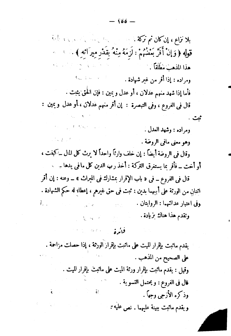 بِلَا نِزَاعٍ، إنْ كَانَ ثَمَّ تَرِكَةٌ. قَوْلُهُ (وَإِنْ أَقَرَّ بَعْضُهُمْ: لَزِمَهُ مِنْهُ بِقَدْرِ مِيرَاثِهِ) . هَذَا الْمَذْهَبُ مُطْلَقًا. وَمُرَادُهُ: إذَا أَقَرَّ مِنْ غَيْرِ شَهَادَةٍ. فَأَمَّا إذَا شَهِدَ مِنْهُمْ عَدْلَانِ، أَوْ عَدْلٌ وَيَمِينٌ: فَإِنَّ الْحَقَّ يَثْبُتُ. قَالَ فِي الْفُرُوعِ، وَفِي التَّبْصِرَةِ إنْ أَقَرَّ مِنْهُمْ عَدْلَانِ، أَوْ عَدْلٌ وَيَمِينٌ: ثَبَتَ. وَمُرَادُهُ: وَشَهِدَ الْعَدْلُ. وَهُوَ مَعْنَى مَا فِي الرَّوْضَةِ. وَقَالَ فِي الرَّوْضَةِ أَيْضًا: إنْ خَلَّفَ وَارِثًا وَاحِدًا لَا يَرِثُ كُلَّ الْمَالِ - كَبِنْتٍ، أَوْ أُخْتٍ - فَأَقَرَّ بِمَا يَسْتَغْرِقُ التَّرِكَةَ: أَخَذَ رَبُّ الدَّيْنِ كُلَّ مَا فِي يَدِهَا. قَالَ فِي الْفُرُوعِ - فِي " بَابِ الْإِقْرَارِ بِمُشَارِكٍ فِي الْمِيرَاثِ " - وَعَنْهُ: إنْ أَقَرَّ اثْنَانِ مِنْ. الْوَرَثَةِ عَلَى أَبِيهِمَا بِدَيْنٍ: ثَبَتَ فِي حَقِّ غَيْرِهِمْ، إعْطَاءً لَهُ حُكْمَ الشَّهَادَةِ. وَفِي اعْتِبَارِ عَدَالَتِهِمَا: الرِّوَايَتَانِ. وَتَقَدَّمَ هَذَا هُنَاكَ بِزِيَادَةٍ.