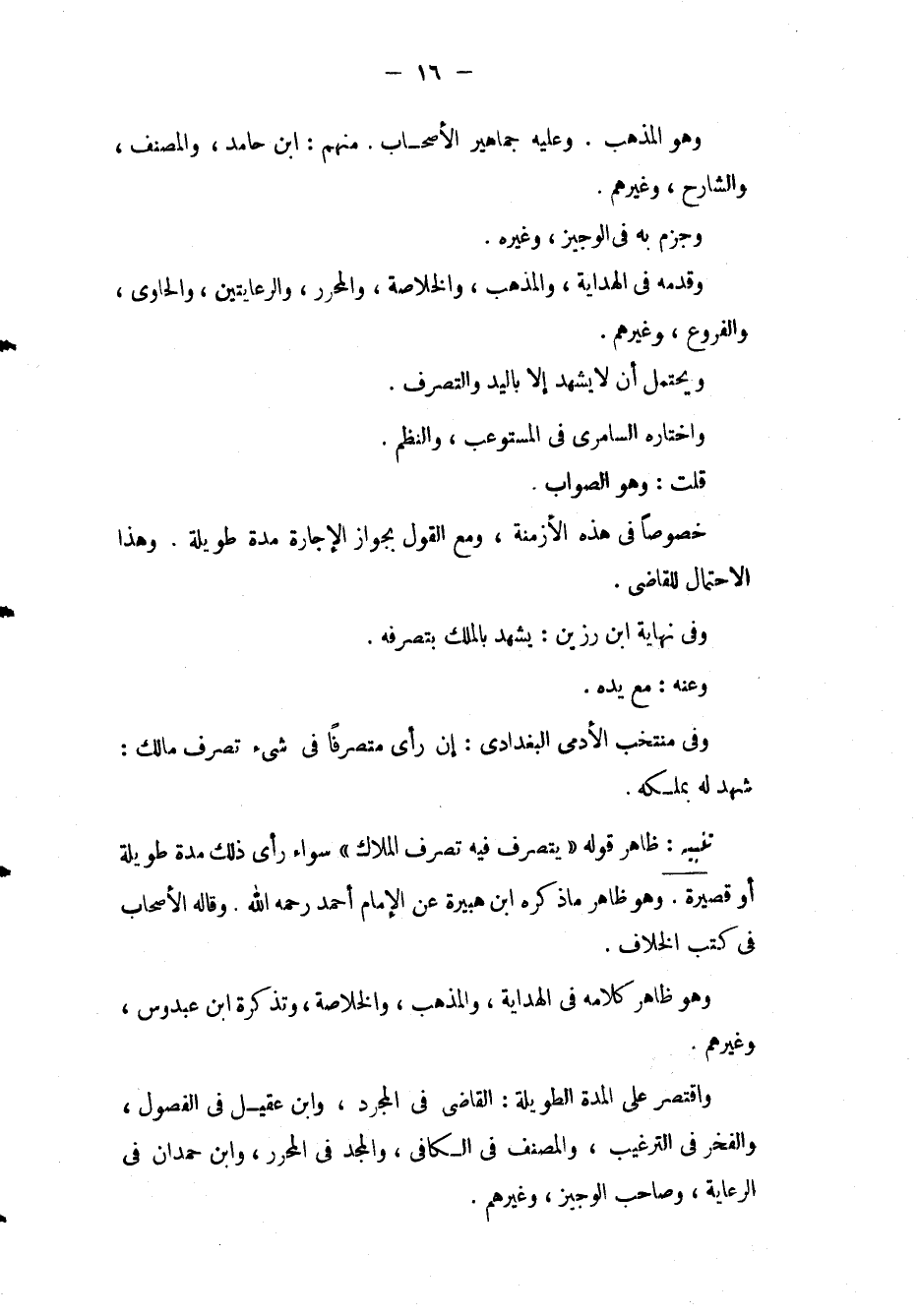 وَهُوَ الْمَذْهَبُ، وَعَلَيْهِ جَمَاهِيرُ الْأَصْحَابِ، مِنْهُمْ: ابْنُ حَامِدٍ، وَالْمُصَنِّفُ، وَالشَّارِحُ، وَغَيْرُهُمْ، وَجَزَمَ بِهِ فِي الْوَجِيزِ، وَغَيْرِهِ، وَقَدَّمَهُ فِي الْهِدَايَةِ، وَالْمُذْهَبِ، وَالْخُلَاصَةِ، وَالْمُحَرَّرِ، وَالرِّعَايَتَيْنِ، وَالْحَاوِي، وَالْفُرُوعِ، وَغَيْرِهِمْ، وَيَحْتَمِلُ أَنْ لَا يَشْهَدَ إلَّا بِالْيَدِ وَالتَّصَرُّفِ، وَاخْتَارَهُ السَّامِرِيُّ فِي الْمُسْتَوْعِبِ، وَالنَّظْمِ، قُلْت وَهُوَ الصَّوَابُ خُصُوصًا فِي هَذِهِ الْأَزْمِنَةِ، وَمَعَ الْقَوْلِ بِجَوَازِ الْإِجَارَةِ مُدَّةً طَوِيلَةً، وَهَذَا الِاحْتِمَالُ لِلْقَاضِي، وَفِي نِهَايَةِ ابْنِ رَزِينٍ: يَشْهَدُ بِالْمِلْكِ بِتَصَرُّفِهِ، وَعَنْهُ: مَعَ يَدِهِ، وَفِي مُنْتَخَبِ الْأَدَمِيِّ الْبَغْدَادِيِّ: إنْ رَأَى مُتَصَرِّفًا فِي شَيْءٍ تَصَرُّفَ مَالِكٍ: شَهِدَ لَهُ بِمِلْكِهِ.