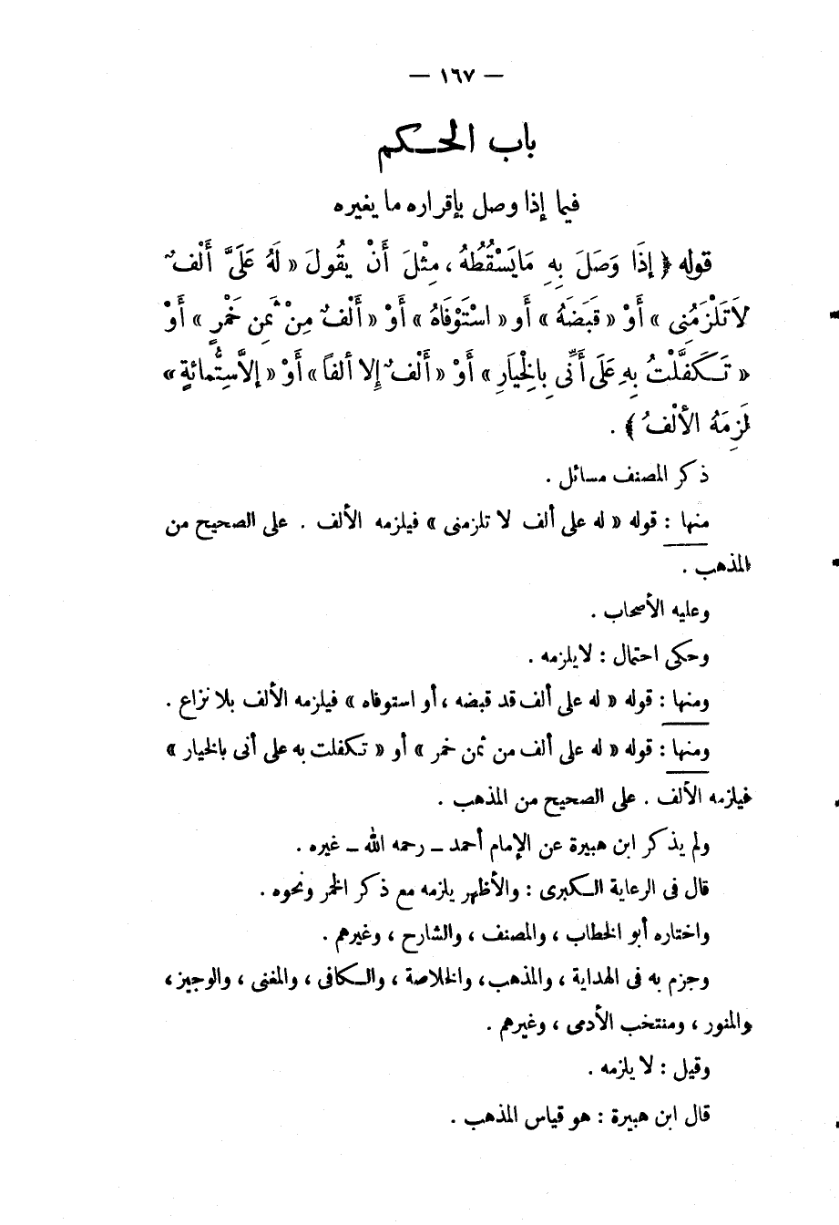ُ قَوْلُهُ (إذَا وَصَلَ بِهِ مَا يَسْقُطُهُ، مِثْلُ أَنْ يَقُولَ " لَهُ عَلَيَّ أَلْفٌ لَا تَلْزَمُنِي " أَوْ " قَبَضَهُ " أَوْ " اسْتَوْفَاهُ " أَوْ " أَلْفٌ مِنْ ثَمَنِ خَمْرٍ " أَوْ " تَكَفَّلْت بِهِ عَلَى أَنِّي بِالْخِيَارِ " أَوْ " أَلْفٌ إلَّا أَلْفًا " أَوْ " إلَّا سِتَّمِائَةٍ " لَزِمَهُ الْأَلْفُ) . ذَكَرَ الْمُصَنِّفُ مَسَائِلَ. مِنْهَا: قَوْلُهُ " لَهُ عَلَيَّ أَلْفٌ لَا تَلْزَمُنِي " فَيَلْزَمُهُ. الْأَلْفُ. عَلَى الصَّحِيحِ مِنْ الْمَذْهَبِ. وَعَلَيْهِ الْأَصْحَابُ. وَحُكِيَ احْتِمَالٌ: لَا يَلْزَمُهُ. وَمِنْهَا قَوْلُهُ " لَهُ عَلَيَّ أَلْفٌ قَدْ قَبَضَهُ، أَوْ اسْتَوْفَاهُ " فَيَلْزَمُهُ الْأَلْفُ بِلَا نِزَاعٍ. وَمِنْهَا: قَوْلُهُ " لَهُ عَلَيَّ أَلْفٌ مِنْ ثَمَنِ الْخَمْرِ " أَوْ " تَكَفَّلْت بِهِ عَلَى أَنِّي بِالْخِيَارِ " فَيَلْزَمُهُ الْأَلْفُ. عَلَى الصَّحِيحِ مِنْ الْمَذْهَبِ. وَلَمْ يَذْكُرْ ابْنُ هُبَيْرَةَ عَنْ الْإِمَامِ أَحْمَدَ - رَحِمَهُ اللَّهُ - غَيْرَهُ. قَالَ فِي الرِّعَايَةِ الْكُبْرَى: وَالْأَظْهَرُ يَلْزَمُهُ مَعَ ذِكْرِ الْخَمْرِ وَنَحْوِهِ. وَاخْتَارَهُ أَبُو الْخَطَّابِ، وَالْمُصَنِّفُ، وَالشَّارِحُ، وَغَيْرُهُمْ. وَجَزَمَ بِهِ فِي الْهِدَايَةِ، وَالْمُذْهَبِ، وَالْخُلَاصَةِ، وَالْكَافِي، وَالْمُغْنِي، وَالْوَجِيزِ، وَالْمُنَوِّرِ، وَمُنْتَخَبِ الْأَدَمِيِّ، وَغَيْرِهِمْ. وَقِيلَ: لَا يَلْزَمُهُ.
