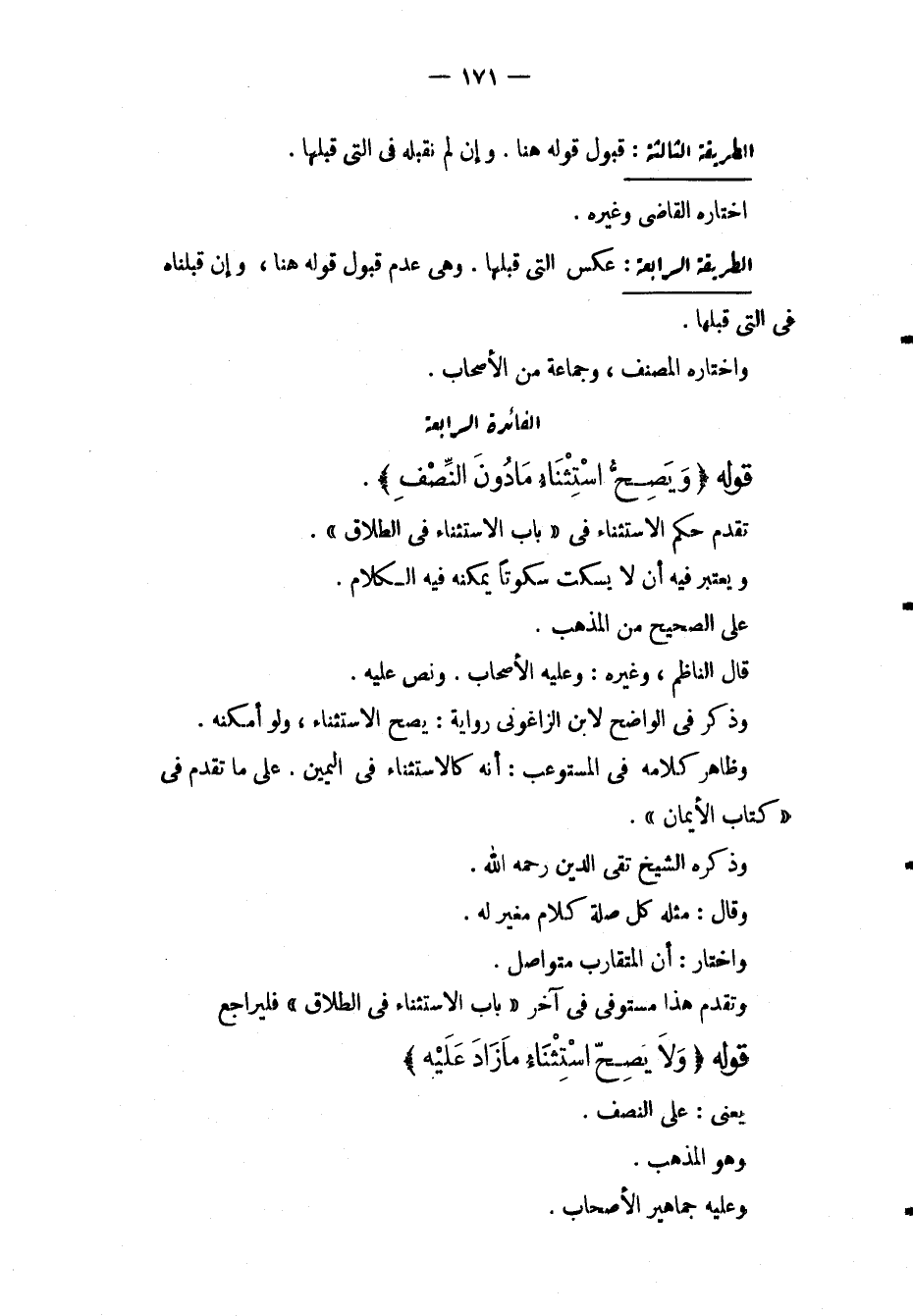 الْفَائِدَةُ الرَّابِعَةُ قَوْلُهُ (وَيَصِحُّ اسْتِثْنَاءُ مَا دُونَ النِّصْفِ) . تَقَدَّمَ حُكْمُ الِاسْتِثْنَاءِ فِي " بَابِ الِاسْتِثْنَاءِ فِي الطَّلَاقِ ". وَيُعْتَبَرُ فِيهِ أَنْ لَا يَسْكُتَ سُكُوتًا يُمْكِنُهُ فِيهِ الْكَلَامُ. عَلَى الصَّحِيحِ مِنْ الْمَذْهَبِ. قَالَ النَّاظِمُ، وَغَيْرُهُ: وَعَلَيْهِ الْأَصْحَابُ. وَنَصَّ عَلَيْهِ. وَذَكَرَ فِي الْوَاضِحِ لِابْنِ الزَّاغُونِيِّ رِوَايَةً: يَصِحُّ الِاسْتِثْنَاءُ، وَلَوْ أَمْكَنَهُ. وَظَاهِرُ كَلَامِهِ فِي الْمُسْتَوْعِبِ: أَنَّهُ كَالِاسْتِثْنَاءِ فِي الْيَمِينِ. عَلَى مَا تَقَدَّمَ فِي " كِتَابِ الْأَيْمَانِ ". وَذَكَرَهُ الشَّيْخُ تَقِيُّ الدِّينِ - رَحِمَهُ اللَّهُ -. وَقَالَ: مِثْلُهُ كُلُّ صِلَةِ كَلَامٍ مُغَيِّرٍ لَهُ. وَاخْتَارَ: أَنَّ الْمُتَقَارِبَ مُتَوَاصِلٌ. وَتَقَدَّمَ هَذَا مُسْتَوْفًى فِي آخِرِ " بَابِ الِاسْتِثْنَاءِ فِي الطَّلَاقِ " فَلْيُرَاجَعْ قَوْلُهُ (وَلَا يَصِحُّ اسْتِثْنَاءُ مَا زَادَ عَلَيْهِ) يَعْنِي: عَلَى النِّصْفِ. وَهُوَ الْمَذْهَبُ. وَعَلَيْهِ جَمَاهِيرُ الْأَصْحَابِ.