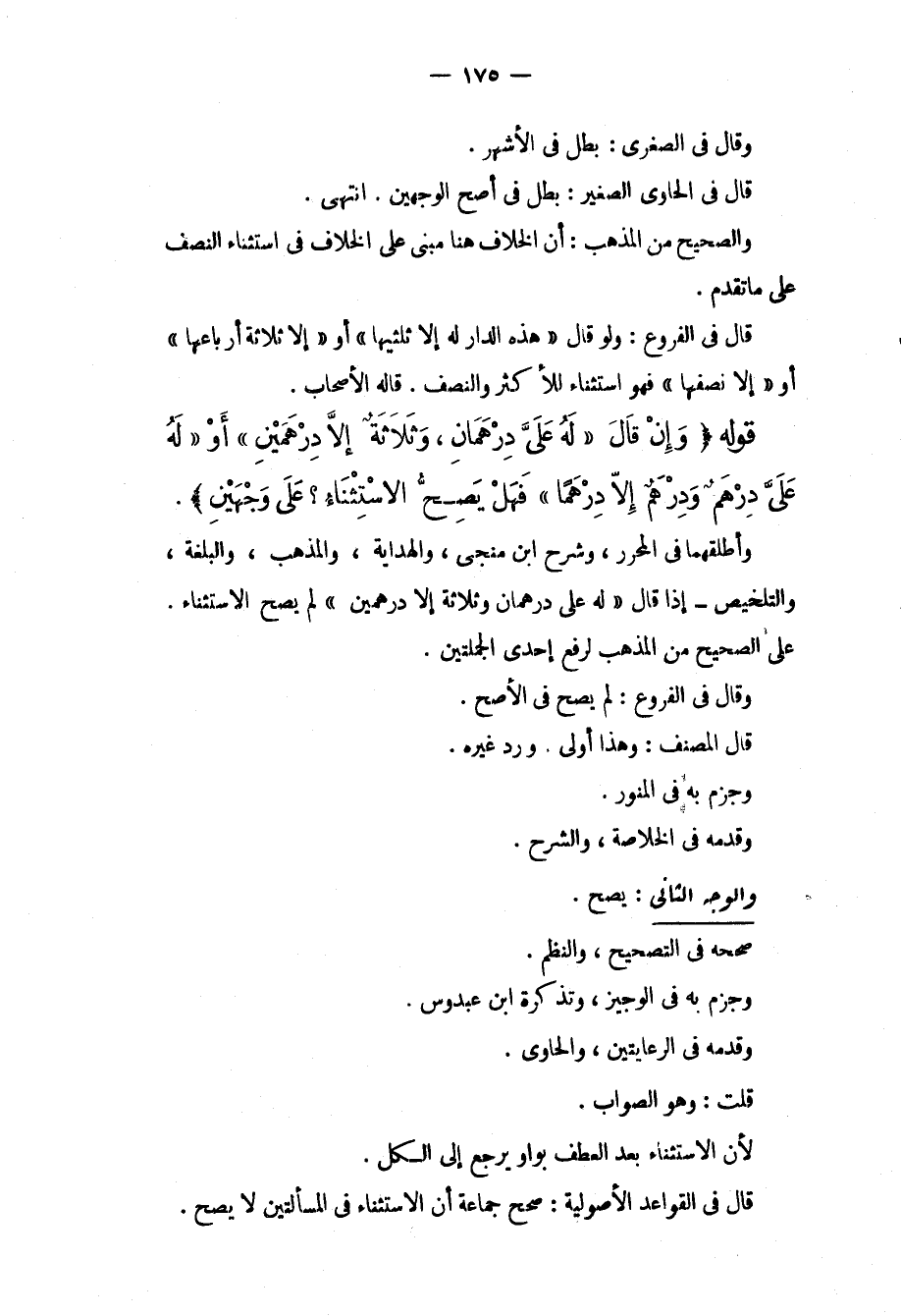 وَقَالَ فِي الصُّغْرَى: بَطَلَ فِي الْأَشْهَرِ. قَالَ فِي الْحَاوِي الصَّغِيرِ: بَطَلَ فِي أَصَحِّ الْوَجْهَيْنِ. انْتَهَى. وَالصَّحِيحُ مِنْ الْمَذْهَبِ: أَنَّ الْخِلَافَ هُنَا مَبْنِيٌّ عَلَى الْخِلَافِ فِي اسْتِثْنَاءِ النِّصْفِ عَلَى مَا تَقَدَّمَ. قَالَ فِي الْفُرُوعِ: وَلَوْ قَالَ " هَذِهِ الدَّارُ لَهُ إلَّا ثُلُثَيْهَا " أَوْ " إلَّا ثَلَاثَةَ أَرْبَاعِهَا " أَوْ " إلَّا نِصْفَهَا " فَهُوَ اسْتِثْنَاءٌ لِلْأَكْثَرِ وَالنِّصْفِ. قَالَهُ الْأَصْحَابُ. قَوْلُهُ (وَإِنْ قَالَ " لَهُ عَلَيَّ دِرْهَمَانِ، وَثَلَاثَةٌ إلَّا دِرْهَمَيْنِ " أَوْ " لَهُ عَلَيَّ دِرْهَمٌ وَدِرْهَمٌ إلَّا دِرْهَمًا " فَهَلْ يَصِحُّ الِاسْتِثْنَاءُ؟ عَلَى وَجْهَيْنِ) . وَأَطْلَقَهُمَا فِي الْمُحَرَّرِ، وَشَرْحِ ابْنِ مُنَجَّى، وَالْهِدَايَةِ، وَالْمُذْهَبِ، وَالْبُلْغَةِ، وَالتَّلْخِيصِ إذَا قَالَ " لَهُ عَلَيَّ دِرْهَمَانِ وَثَلَاثَةٌ إلَّا دِرْهَمَيْنِ " لَمْ يَصِحَّ الِاسْتِثْنَاءُ. عَلَى الصَّحِيحِ مِنْ الْمَذْهَبِ لِرَفْعِ إحْدَى الْجُمْلَتَيْنِ. وَقَالَ فِي الْفُرُوعِ: لَمْ يَصِحَّ فِي الْأَصَحِّ. قَالَ الْمُصَنِّفُ: وَهَذَا أَوْلَى. وَرُدَّ غَيْرُهُ. وَجَزَمَ بِهِ فِي الْمُنَوِّرِ. وَقَدَّمَهُ فِي الْخُلَاصَةِ، وَالشَّرْحِ. وَالْوَجْهِ الثَّانِي: يَصِحُّ. صَحَّحَهُ. فِي التَّصْحِيحِ، وَالنَّظْمِ. وَجَزَمَ بِهِ فِي الْوَجِيزِ، وَتَذْكِرَةِ ابْنِ عَبْدُوسٍ. وَقَدَّمَهُ فِي الرِّعَايَتَيْنِ، وَالْحَاوِي. قُلْت: وَهُوَ الصَّوَابُ. لِأَنَّ الِاسْتِثْنَاءَ بَعْدَ الْعَطْفِ بِوَاوٍ يَرْجِعُ إلَى الْكُلِّ. قَالَ فِي الْقَوَاعِدِ الْأُصُولِيَّةِ: صَحَّحَ جَمَاعَةٌ أَنَّ الِاسْتِثْنَاءَ فِي الْمَسْأَلَتَيْنِ لَا يَصِحُّ.