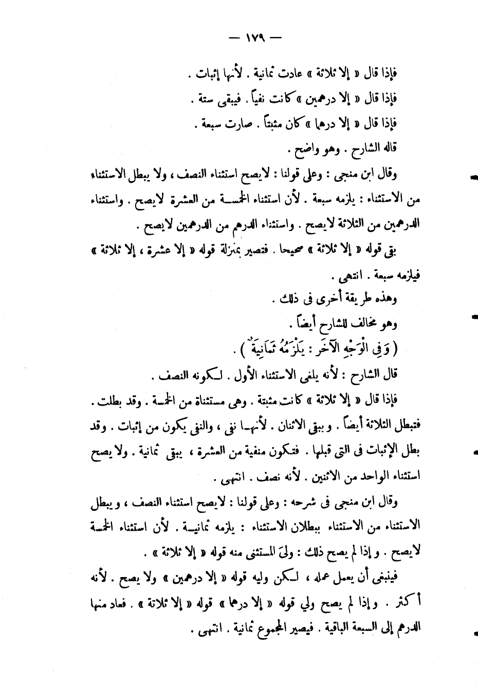 (وَفِي الْوَجْهِ الْآخَرِ: يَلْزَمُهُ ثَمَانِيَةٌ) . قَالَ الشَّارِحُ؛ لِأَنَّهُ يُلْغِي الِاسْتِثْنَاءَ الْأَوَّلَ؛ لِكَوْنِهِ النِّصْفَ. فَإِذَا قَالَ " إلَّا ثَلَاثَةً " كَانَتْ مُثْبَتَةً. وَهِيَ مُسْتَثْنَاةٌ مِنْ الْخَمْسَةِ. وَقَدْ بَطَلَتْ. فَتَبْطُلُ الثَّلَاثَةُ أَيْضًا. وَيَبْقَى الِاثْنَانِ؛ لِأَنَّهَا نَفْيٌ، وَالنَّفْيُ يَكُونُ مِنْ إثْبَاتٍ. وَقَدْ بَطَلَ الْإِثْبَاتُ فِي الَّتِي قَبْلَهَا. فَتَكُونُ مَنْفِيَّةً مِنْ الْعَشَرَةِ، يَبْقَى ثَمَانِيَةٌ. وَلَا يَصِحُّ اسْتِثْنَاءُ الْوَاحِدِ مِنْ الِاثْنَيْنِ؛ لِأَنَّهُ نِصْفٌ. انْتَهَى. وَقَالَ ابْنُ مُنَجَّى فِي شَرْحِهِ: وَعَلَى قَوْلِنَا: لَا يَصِحُّ اسْتِثْنَاءُ النِّصْفِ، وَيَبْطُلُ الِاسْتِثْنَاءُ مِنْ الِاسْتِثْنَاءِ بِبُطْلَانِ الِاسْتِثْنَاءِ: يَلْزَمُهُ ثَمَانِيَةٌ؛ لِأَنَّ اسْتِثْنَاءَ الْخَمْسَةِ لَا يَصِحُّ. وَإِذَا لَمْ يَصِحَّ ذَلِكَ: وَلِيَ الْمُسْتَثْنَى مِنْهُ قَوْلَهُ " إلَّا ثَلَاثَةً ". فَيَنْبَغِي أَنْ يَعْمَلَ عَمَلَهُ، لَكِنْ وَلِيَهُ قَوْلُهُ " إلَّا دِرْهَمَيْنِ " وَلَا يَصِحُّ؛ لِأَنَّهُ أَكْثَرُ. وَإِذَا لَمْ يَصِحَّ وَلِيَ قَوْلُهُ " إلَّا دِرْهَمًا " قَوْلَهُ " إلَّا ثَلَاثَةً ". فَعَادَ مِنْهَا الدِّرْهَمُ إلَى السَّبْعَةِ الْبَاقِيَةِ. فَيَصِيرُ الْمَجْمُوعُ ثَمَانِيَةً. انْتَهَى