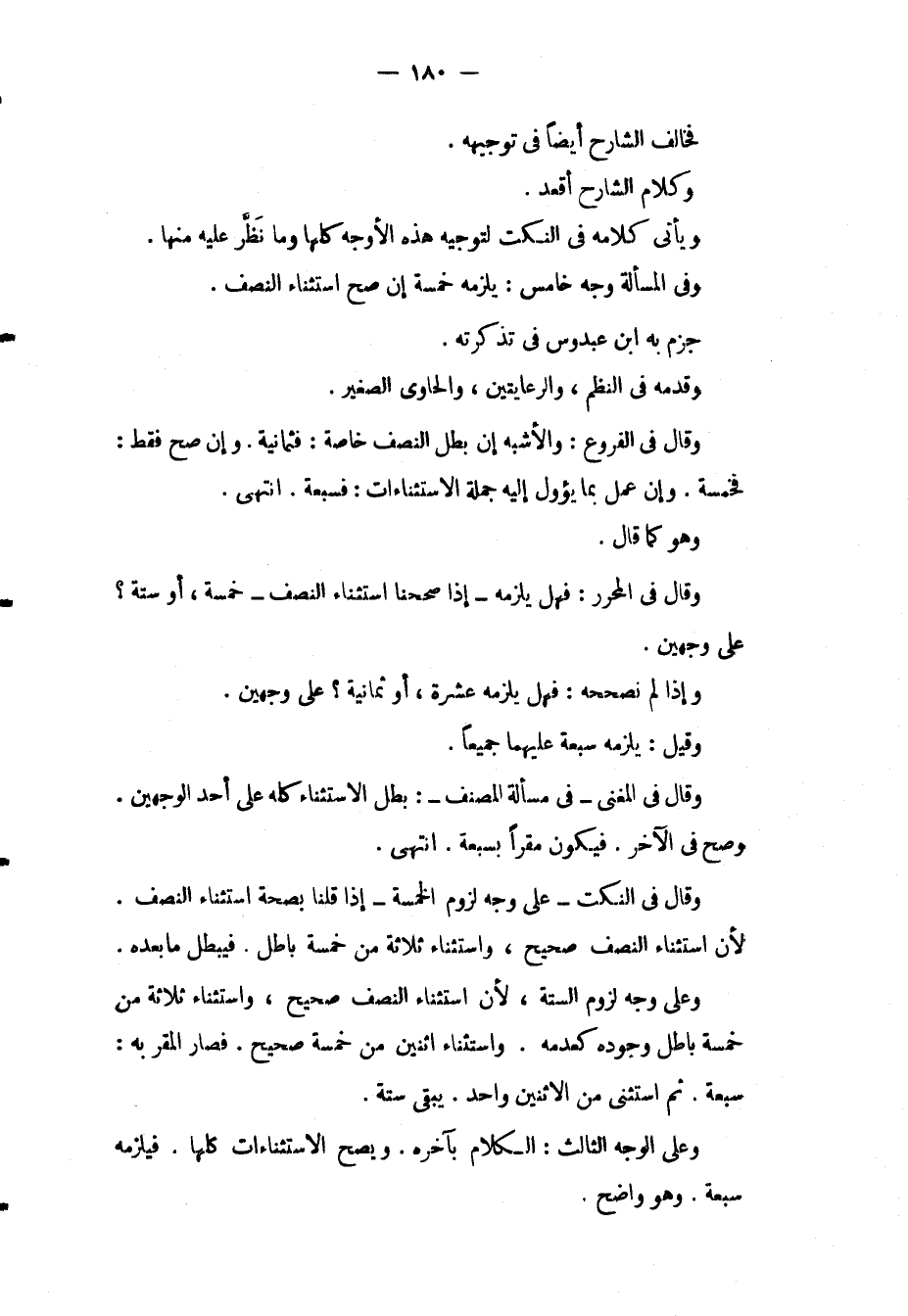 فَخَالَفَ الشَّارِحَ أَيْضًا فِي تَوْجِيهِهِ. وَكَلَامُ الشَّارِحِ أَقْعَدُ. وَيَأْتِي كَلَامُهُ فِي النُّكَتِ لِتَوْجِيهِ هَذِهِ الْأَوْجُهِ كُلِّهَا وَمَا نَظَرَ عَلَيْهِ مِنْهَا. وَفِي الْمَسْأَلَةِ وَجْهٌ خَامِسٌ: يَلْزَمُهُ خَمْسَةٌ إنْ صَحَّ اسْتِثْنَاءُ النِّصْفِ. جَزَمَ بِهِ ابْنُ عَبْدُوسٍ فِي تَذْكِرَتِهِ. وَقَدَّمَهُ فِي النَّظْمِ، وَالرِّعَايَتَيْنِ.، وَالْحَاوِي الصَّغِيرِ. وَقَالَ فِي الْفُرُوعِ: وَالْأَشْبَهِ إنْ بَطَلَ النِّصْفُ خَاصَّةً: فَثَمَانِيَةٌ. وَإِنْ صَحَّ فَقَطْ: فَخَمْسَةٌ. وَإِنْ عَمِلَ بِمَا يَئُولُ إلَيْهِ جُمْلَةُ الِاسْتِثْنَاءَاتِ: فَسَبْعَةٌ. انْتَهَى.
