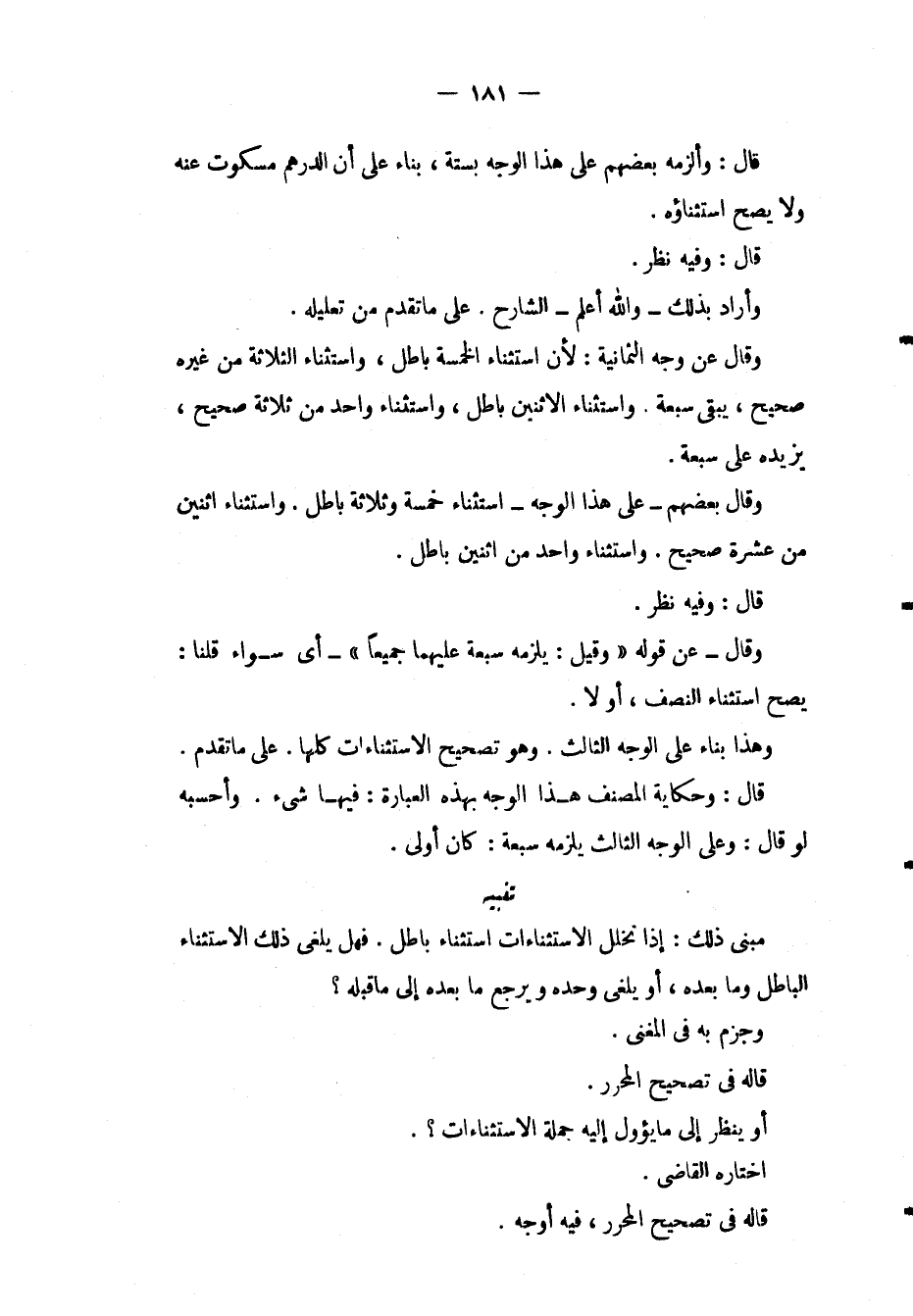 وَقَالَ عَنْ وَجْهِ الثَّمَانِيَةِ: لِأَنَّ اسْتِثْنَاءَ الْخَمْسَةِ بَاطِلٌ، وَاسْتِثْنَاءُ الثَّلَاثَةِ مِنْ غَيْرِهِ صَحِيحٌ، يَبْقَى سَبْعَةٌ. وَاسْتِثْنَاءُ الِاثْنَيْنِ بَاطِلٌ، وَاسْتِثْنَاءُ وَاحِدٍ مِنْ ثَلَاثَةٍ صَحِيحٌ، يَزِيدُهُ عَلَى سَبْعَةٍ. وَقَالَ بَعْضُهُمْ عَلَى هَذَا الْوَجْهِ اسْتِثْنَاءُ خَمْسَةٍ وَثَلَاثَةٍ بَاطِلٌ. وَاسْتِثْنَاءُ اثْنَيْنِ مِنْ عَشَرَةٍ صَحِيحٌ. وَاسْتِثْنَاءُ وَاحِدٍ مِنْ اثْنَيْنِ بَاطِلٌ. قَالَ: وَفِيهِ نَظَرٌ. وَقَالَ عَنْ قَوْلِهِ " وَقِيلَ يَلْزَمُهُ سَبْعَةٌ عَلَيْهِمَا جَمِيعًا " أَيْ سَوَاءٌ قُلْنَا: يَصِحُّ اسْتِثْنَاءُ النِّصْفِ، أَوْ لَا. وَهَذَا بِنَاءً عَلَى الْوَجْهِ الثَّالِثِ. وَهُوَ تَصْحِيحُ الِاسْتِثْنَاءَاتِ كُلِّهَا. عَلَى مَا تَقَدَّمَ. قَالَ: وَحِكَايَةُ الْمُصَنِّفِ هَذَا الْوَجْهَ بِهَذِهِ الْعِبَارَةِ: فِيهَا شَيْءٌ. وَأَحْسِبُهُ لَوْ قَالَ: وَعَلَى الْوَجْهِ الثَّالِثِ يَلْزَمُهُ سَبْعَةٌ: كَانَ أَوْلَى.