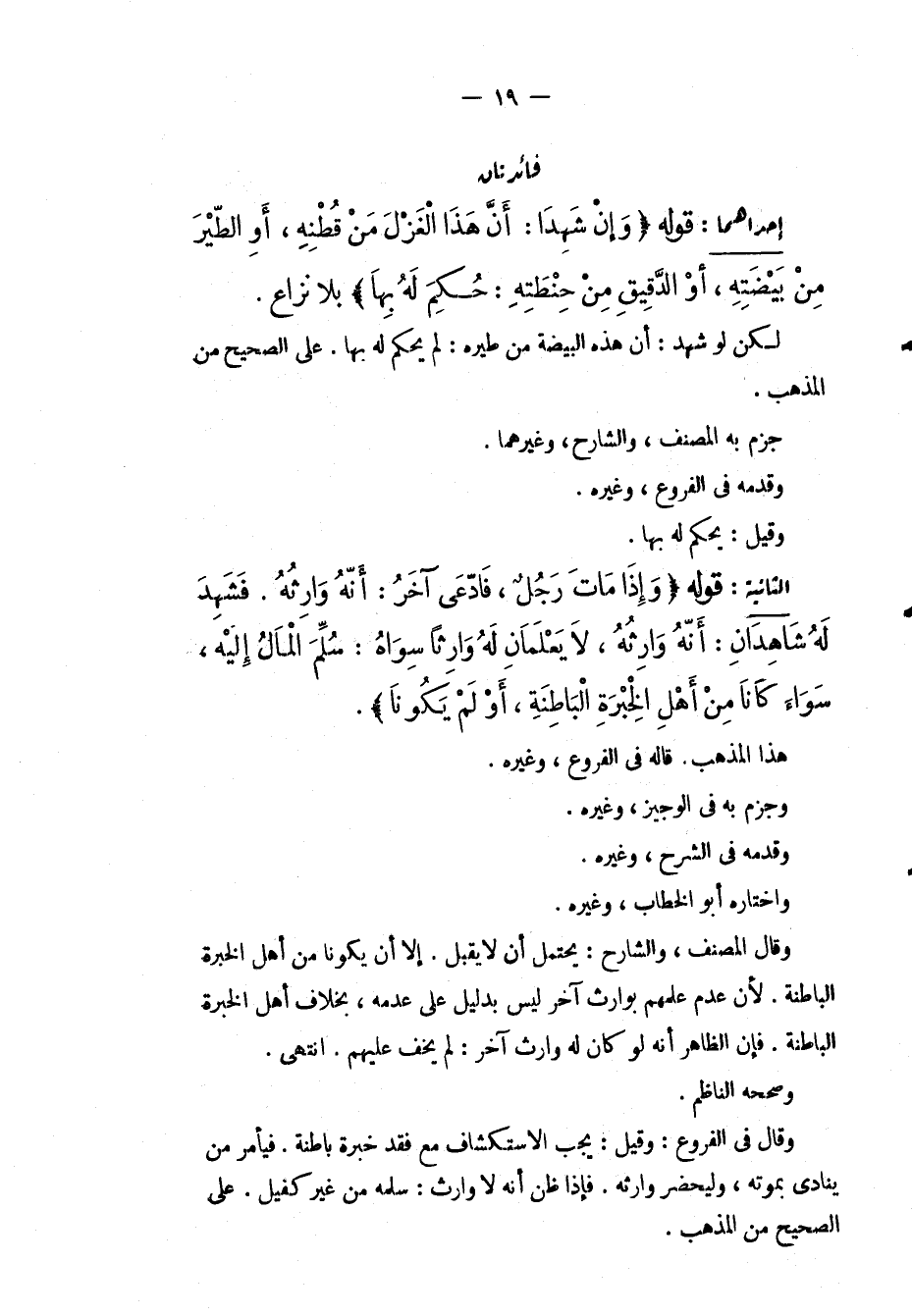 إحْدَاهُمَا: قَوْلُهُ (وَإِنْ شَهِدَا: أَنَّ هَذَا الْغَزْلَ مِنْ قُطْنِهِ، أَوْ الطَّيْرَ مِنْ بَيْضَتِهِ، أَوْ الدَّقِيقَ مِنْ حِنْطَتِهِ: حُكِمَ لَهُ بِهَا) بِلَا نِزَاعٍ، لَكِنْ لَوْ شَهِدَ: أَنَّ هَذِهِ الْبَيْضَةَ مِنْ طَيْرِهِ: لَمْ يُحْكَمْ لَهُ بِهَا، عَلَى الصَّحِيحِ مِنْ الْمَذْهَبِ، جَزَمَ بِهِ الْمُصَنِّفُ، وَالشَّارِحُ، وَغَيْرُهُمَا، وَقَدَّمَهُ فِي الْفُرُوعِ، وَغَيْرِهِ، وَقِيلَ: يُحْكَمُ لَهُ بِهَا. الثَّانِيَةُ: قَوْلُهُ (وَإِذَا مَاتَ رَجُلٌ، فَادَّعَى آخَرُ: أَنَّهُ وَارِثُهُ، فَشَهِدَ لَهُ شَاهِدَانِ: أَنَّهُ وَارِثُهُ، لَا يَعْلَمَانِ لَهُ وَارِثًا سِوَاهُ: سُلِّمَ الْمَالُ إلَيْهِ، سَوَاءٌ كَانَا مِنْ أَهْلِ الْخِبْرَةِ الْبَاطِنَةِ، أَوْ لَمْ يَكُونَا) هَذَا الْمَذْهَبُ، قَالَهُ فِي الْفُرُوعِ، وَغَيْرِهِ، وَجَزَمَ بِهِ فِي الْوَجِيزِ، وَغَيْرِهِ، وَقَدَّمَهُ فِي الشَّرْحِ، وَغَيْرِهِ، وَاخْتَارَهُ أَبُو الْخَطَّابِ، وَغَيْرُهُ، وَقَالَ الْمُصَنِّفُ وَالشَّارِحُ: يَحْتَمِلُ أَنْ لَا يُقْبَلَ، إلَّا أَنْ يَكُونَا مِنْ أَهْلِ الْخِبْرَةِ الْبَاطِنَةِ، لِأَنَّ عَدَمَ عِلْمِهِمْ بِوَارِثٍ آخَرَ لَيْسَ بِدَلِيلٍ عَلَى عَدَمِهِ، بِخِلَافِ أَهْلِ الْخِبْرَةِ الْبَاطِنَةِ، فَإِنَّ الظَّاهِرَ أَنَّهُ لَوْ كَانَ لَهُ وَارِثٌ آخَرُ: لَمْ يَخْفَ عَلَيْهِمْ. انْتَهَى. وَصَحَّحَهُ النَّاظِمُ، وَقَالَ فِي الْفُرُوعِ: وَقِيلَ: يَجِبُ الِاسْتِكْشَافُ مَعَ فَقْدِ خِبْرَةٍ بَاطِنَةٍ، فَيَأْمُرُ مَنْ يُنَادِي بِمَوْتِهِ، وَلْيَحْضُرْ وَارِثُهُ، فَإِذَا ظَنَّ أَنَّهُ لَا وَارِثَ: سَلَّمَهُ مِنْ غَيْرِ كَفِيلٍ، عَلَى الصَّحِيحِ مِنْ الْمَذْهَبِ،
