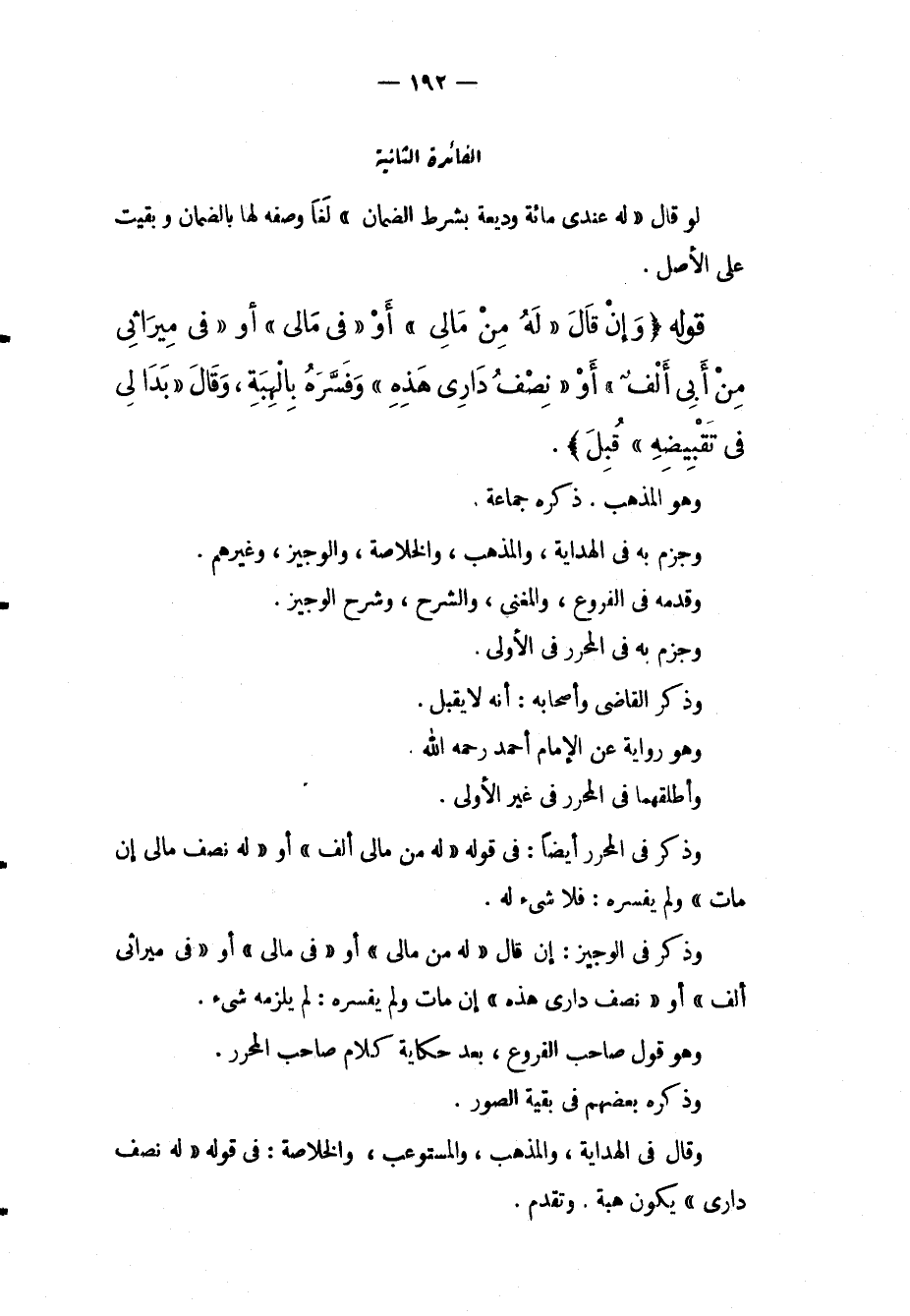 الْفَائِدَةُ الثَّانِيَةُ لَوْ قَالَ " لَهُ عِنْدِي مِائَةٌ وَدِيعَةٌ بِشَرْطِ الضَّمَانِ " لَغَا وَصْفُهُ لَهَا بِالضَّمَانِ وَبَقِيَتْ عَلَى الْأَصْلِ قَوْلُهُ (وَإِنْ قَالَ " لَهُ مِنْ مَالِي " أَوْ " فِي مَالِي " أَوْ " فِي مِيرَاثِي مِنْ أَبِي أَلْفٌ " أَوْ " نِصْفُ دَارِي هَذِهِ " وَفَسَّرَهُ بِالْهِبَةِ، وَقَالَ " بَدَا لِي فِي تَقْبِيضِهِ " قُبِلَ) وَهُوَ الْمَذْهَبُ ذَكَرَهُ جَمَاعَةٌ وَجَزَمَ بِهِ فِي الْهِدَايَةِ، وَالْمُذْهَبِ، وَالْخُلَاصَةِ، وَالْوَجِيزِ، وَغَيْرِهِمْ وَقَدَّمَهُ فِي الْفُرُوعِ، وَالْمُغْنِي، وَالشَّرْحِ، وَشَرْحِ الْوَجِيزِ وَجَزَمَ بِهِ فِي الْمُحَرَّرِ فِي الْأُولَى وَذَكَرَ الْقَاضِي وَأَصْحَابُهُ: أَنَّهُ لَا يُقْبَلُ وَهُوَ رِوَايَةٌ عَنْ الْإِمَامِ أَحْمَدَ - رَحِمَهُ اللَّهُ - وَأَطْلَقَهُمَا فِي الْمُحَرَّرِ فِي غَيْرِ الْأُولَى وَذَكَرَ فِي الْمُحَرَّرِ أَيْضًا: فِي قَوْلِهِ " لَهُ مِنْ مَالِي أَلْفٌ " أَوْ " لَهُ نِصْفُ مَالِي إنْ مَاتَ " وَلَمْ يُفَسِّرْهُ: فَلَا شَيْءَ لَهُ وَذَكَرَ فِي الْوَجِيزِ: إنْ قَالَ " لَهُ مِنْ مَالِي " أَوْ " فِي مَالِي " أَوْ " فِي مِيرَاثِي أَلْفٌ " أَوْ " نِصْفُ دَارِي هَذِهِ " إنْ مَاتَ وَلَمْ يُفَسِّرْهُ: لَمْ يَلْزَمْهُ شَيْءٌ وَهُوَ قَوْلُ صَاحِبِ الْفُرُوعِ، بَعْدَ حِكَايَةِ كَلَامِ صَاحِبِ الْمُحَرَّرِ وَذَكَرَهُ بَعْضُهُمْ فِي بَقِيَّةِ الصُّوَرِ وَقَالَ فِي الْهِدَايَةِ، وَالْمُذْهَبِ، وَالْمُسْتَوْعِبِ، وَالْخُلَاصَةِ: فِي قَوْلِهِ " لَهُ نِصْفُ دَارِي " يَكُونُ هِبَةً وَتَقَدَّمَ