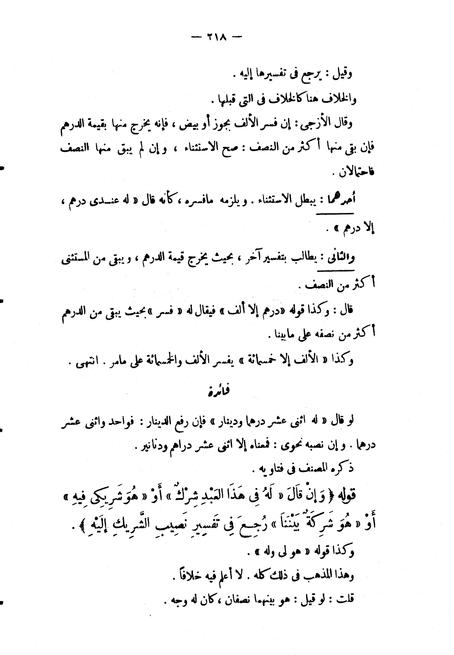 وَقِيلَ: يَرْجِعُ فِي تَفْسِيرِهَا إلَيْهِ وَالْخِلَافُ هُنَا كَالْخِلَافِ فِي الَّتِي قَبْلَهَا وَقَالَ الْأَزَجِيُّ: إنْ فَسَّرَ الْأَلْفَ بِجَوْزٍ أَوْ بَيْضٍ، فَإِنَّهُ يَخْرُجُ مِنْهَا بِقِيمَةِ الدِّرْهَمِ فَإِنْ بَقِيَ مِنْهَا أَكْثَرُ مِنْ النِّصْفِ: صَحَّ الِاسْتِثْنَاءُ، وَإِنْ لَمْ يَبْقَ مِنْهَا النِّصْفُ فَاحْتِمَالَانِ أَحَدُهُمَا: يَبْطُلُ الِاسْتِثْنَاءُ وَيَلْزَمُهُ مَا فَسَّرَهُ، كَأَنَّهُ قَالَ " لَهُ عِنْدِي دِرْهَمٌ، إلَّا دِرْهَمًا " وَالثَّانِي: يُطَالَبُ بِتَفْسِيرٍ آخَرَ، بِحَيْثُ يَخْرُجُ قِيمَةُ الدِّرْهَمِ، وَيَبْقَى مِنْ الْمُسْتَثْنَى أَكْثَرُ مِنْ النِّصْفِ قَالَ: وَكَذَا قَوْلُهُ " دِرْهَمٌ إلَّا أَلْفٌ " فَيُقَالُ لَهُ " فَسِّرْ " بِحَيْثُ يَبْقَى مِنْ الدِّرْهَمِ أَكْثَرُ مِنْ نِصْفِهِ عَلَى مَا بَيَّنَّا وَكَذَا " الْأَلْفُ إلَّا خَمْسَمِائَةٍ " يُفَسِّرُ الْأَلْفَ وَالْخَمْسَمِائَةِ عَلَى مَا مَرَّ انْتَهَى فَائِدَةٌ لَوْ قَالَ " لَهُ اثْنَا عَشَرَ دِرْهَمًا وَدِينَارٌ " فَإِنْ رَفَعَ الدِّينَارَ: فَوَاحِدٌ وَاثْنَا عَشَرَ دِرْهَمًا وَإِنْ نَصَبَهُ نَحْوِيٌّ: فَمَعْنَاهُ إلَّا اثْنَيْ عَشَرَ دَرَاهِمَ وَدَنَانِيرَ ذَكَرَهُ الْمُصَنِّفُ فِي فَتَاوِيهِ