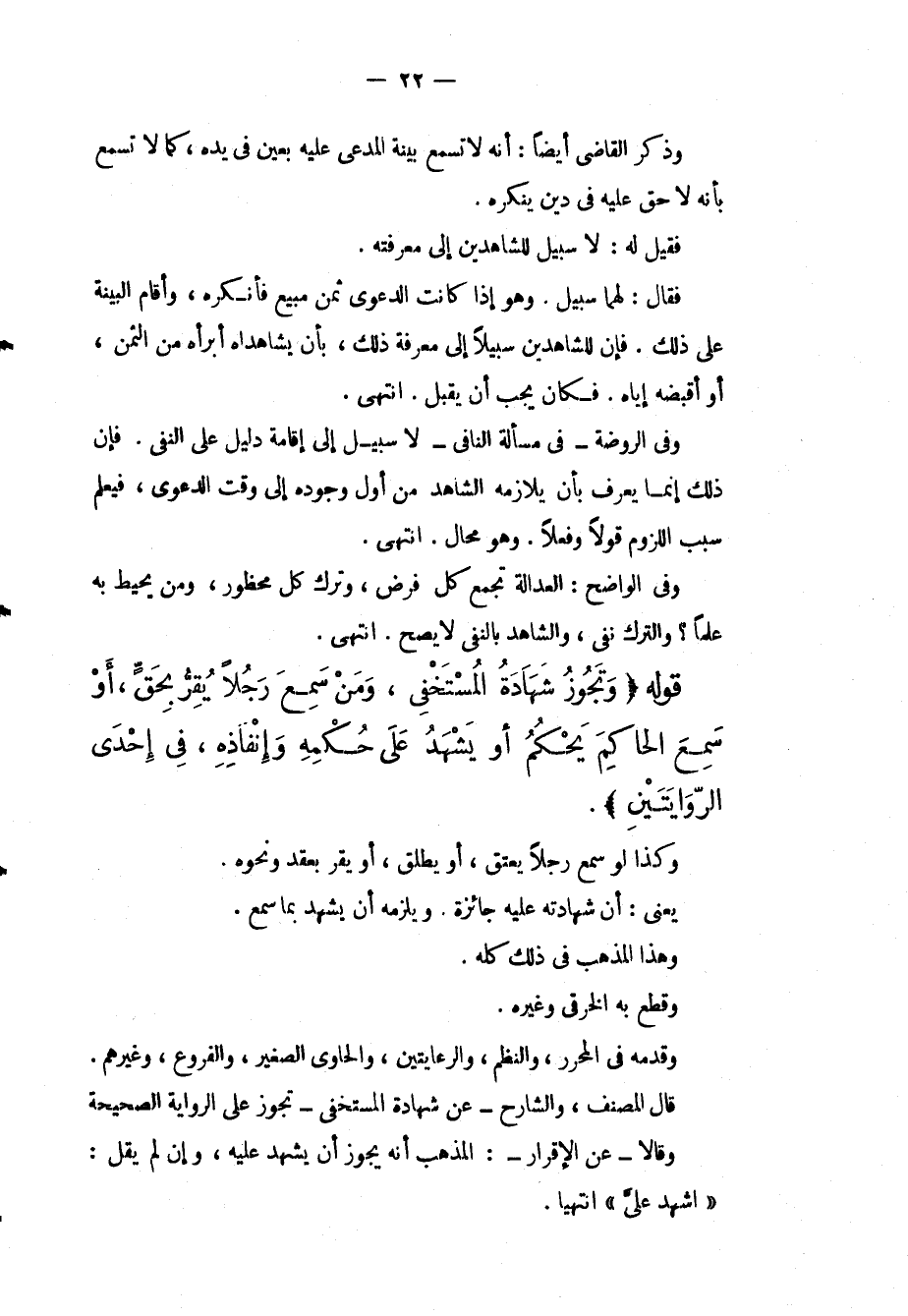 وَذَكَرَ الْقَاضِي أَيْضًا: أَنَّهُ لَا تُسْمَعُ بَيِّنَةُ الْمُدَّعَى عَلَيْهِ بِعَيْنٍ فِي يَدِهِ. كَمَا لَا تُسْمَعُ بِأَنَّهُ لَا حَقَّ عَلَيْهِ فِي دَيْنٍ يُنْكِرُهُ، فَقِيلَ لَهُ: لَا سَبِيلَ لِلشَّاهِدَيْنِ إلَى مَعْرِفَتِهِ، فَقَالَ: لَهُمَا سَبِيلٌ، وَهُوَ إذَا كَانَتْ الدَّعْوَى ثَمَنَ مَبِيعٍ فَأَنْكَرَهُ، وَأَقَامَ الْبَيِّنَةَ عَلَى ذَلِكَ، فَإِنَّ لِلشَّاهِدَيْنِ سَبِيلًا إلَى مَعْرِفَةِ ذَلِكَ، بِأَنْ يُشَاهِدَاهُ أَبْرَأَهُ مِنْ الثَّمَنِ، أَوْ أَقْبَضَهُ إيَّاهُ، فَكَانَ يَجِبُ أَنْ يُقْبَلَ. انْتَهَى. وَفِي الرَّوْضَةِ فِي مَسْأَلَةِ النَّافِي لَا سَبِيلَ إلَى إقَامَةِ دَلِيلٍ عَلَى النَّفْيِ، فَإِنَّ ذَلِكَ إنَّمَا يُعْرَفُ بِأَنْ يُلَازِمَهُ الشَّاهِدُ مِنْ أَوَّلِ وُجُودِهِ إلَى وَقْتِ الدَّعْوَى، فَيَعْلَمُ سَبَبَ اللُّزُومِ قَوْلًا وَفِعْلًا، وَهُوَ مُحَالٌ. انْتَهَى. وَفِي الْوَاضِحِ: الْعَدَالَةُ تَجَمُّعُ كُلِّ فَرْضٍ، وَتَرْكُ كُلِّ مَحْظُورٍ، وَمَنْ يُحِيطُ بِهِ عِلْمًا؟ التَّرْكُ نَفْيٌ، وَالشَّاهِدُ بِالنَّفْيِ لَا يَصِحُّ. انْتَهَى.