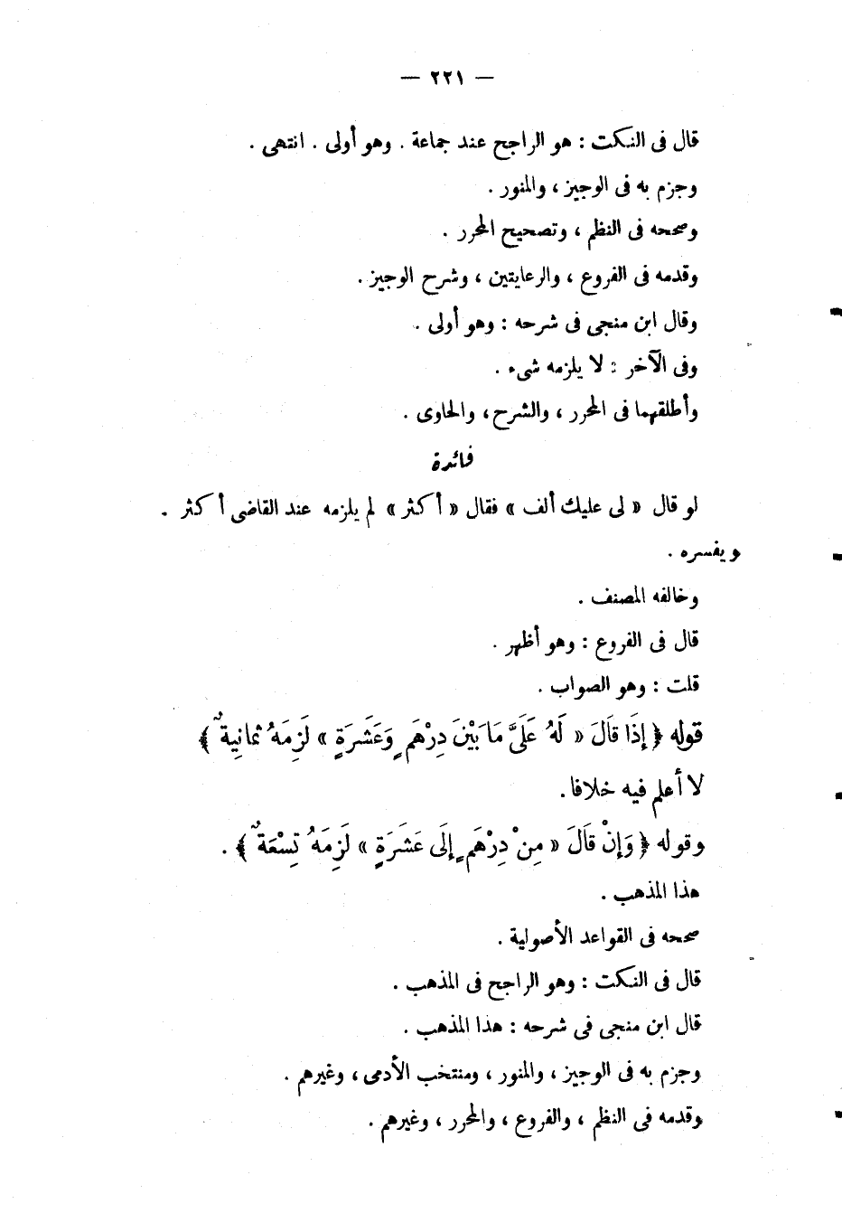 قَالَ فِي النُّكَتِ: وَهُوَ الرَّاجِحُ عِنْدَ جَمَاعَةٍ وَهُوَ أَوْلَى انْتَهَى وَجَزَمَ بِهِ فِي الْوَجِيزِ، وَالْمُنَوِّرِ وَصَحَّحَهُ فِي النَّظْمِ، وَتَصْحِيحِ الْمُحَرَّرِ وَقَدَّمَهُ فِي الْفُرُوعِ، وَالرِّعَايَتَيْنِ، وَشَرْحِ الْوَجِيزِ وَقَالَ ابْنُ مُنَجَّا فِي شَرْحِهِ: وَهُوَ أَوْلَى وَفِي الْآخَرِ: لَا يَلْزَمُهُ شَيْءٌ وَأَطْلَقَهُمَا فِي الْمُحَرَّرِ، وَالشَّرْحِ، وَالْحَاوِي فَائِدَةٌ لَوْ قَالَ " لِي عَلَيْك أَلْفٌ " فَقَالَ " أَكْثَرُ " لَمْ يَلْزَمْهُ عِنْدَ الْقَاضِي أَكْثَرُ وَيُفَسِّرُهُ وَخَالَفَهُ الْمُصَنِّفُ قَالَ فِي الْفُرُوعِ: وَهُوَ أَظْهَرُ قُلْت: وَهُوَ الصَّوَابُ