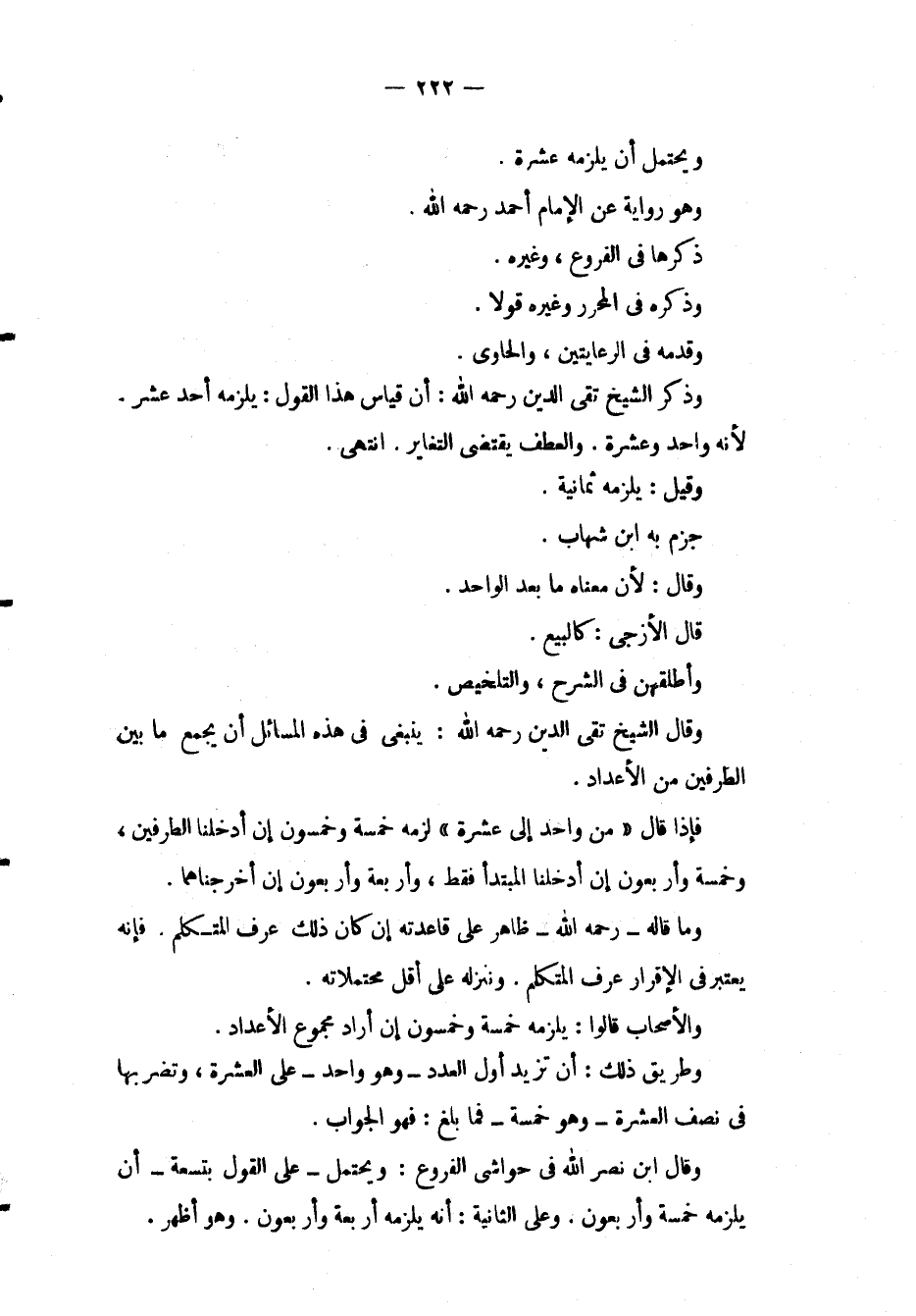 وَيَحْتَمِلُ أَنْ يَلْزَمَهُ عَشَرَةٌ وَهُوَ رِوَايَةُ الْإِمَامِ أَحْمَدَ - رَحِمَهُ اللَّهُ - ذَكَرَهَا فِي الْفُرُوعِ، وَغَيْرِهِ وَذَكَرَهُ فِي الْمُحَرَّرِ وَغَيْرِهِ قَوْلًا وَقَدَّمَهُ فِي الرِّعَايَتَيْنِ، وَالْحَاوِي وَذَكَرَ الشَّيْخُ تَقِيُّ الدِّينِ - رَحِمَهُ اللَّهُ -: أَنَّ قِيَاسَ هَذَا الْقَوْلِ: يَلْزَمُهُ أَحَدَ عَشَرَ؛ لِأَنَّهُ وَاحِدٌ وَعَشَرَةٌ وَالْعَطْفُ بِهِ يَقْتَضِي التَّغَايُرَ. انْتَهَى وَقِيلَ: يَلْزَمُهُ ثَمَانِيَةٌ جَزَمَ بِهِ ابْنُ شِهَابٍ وَقَالَ: لِأَنَّ مَعْنَاهُ مَا بَعْدَ الْوَاحِدِ قَالَ الْأَزَجِيُّ: كَالْبَيْعِ وَأَطْلَقَهُنَّ فِي الشَّرْحِ، وَالتَّلْخِيصِ وَقَالَ الشَّيْخُ تَقِيُّ الدِّينِ - رَحِمَهُ اللَّهُ -: يَنْبَغِي فِي هَذِهِ الْمَسَائِلِ أَنْ يَجْمَعَ مَا بَيْنَ الطَّرَفَيْنِ مِنْ الْأَعْدَادِ فَإِذَا قَالَ " مِنْ وَاحِدٍ إلَى عَشَرَةٍ " لَزِمَهُ خَمْسَةٌ وَخَمْسُونَ إنْ أَدْخَلْنَا الطَّرَفَيْنِ، وَخَمْسَةٌ وَأَرْبَعُونَ إنْ أَدْخَلْنَا الْمُبْتَدَأَ فَقَطْ، وَأَرْبَعَةٌ وَأَرْبَعُونَ إنْ أَخْرَجْنَاهُمَا.