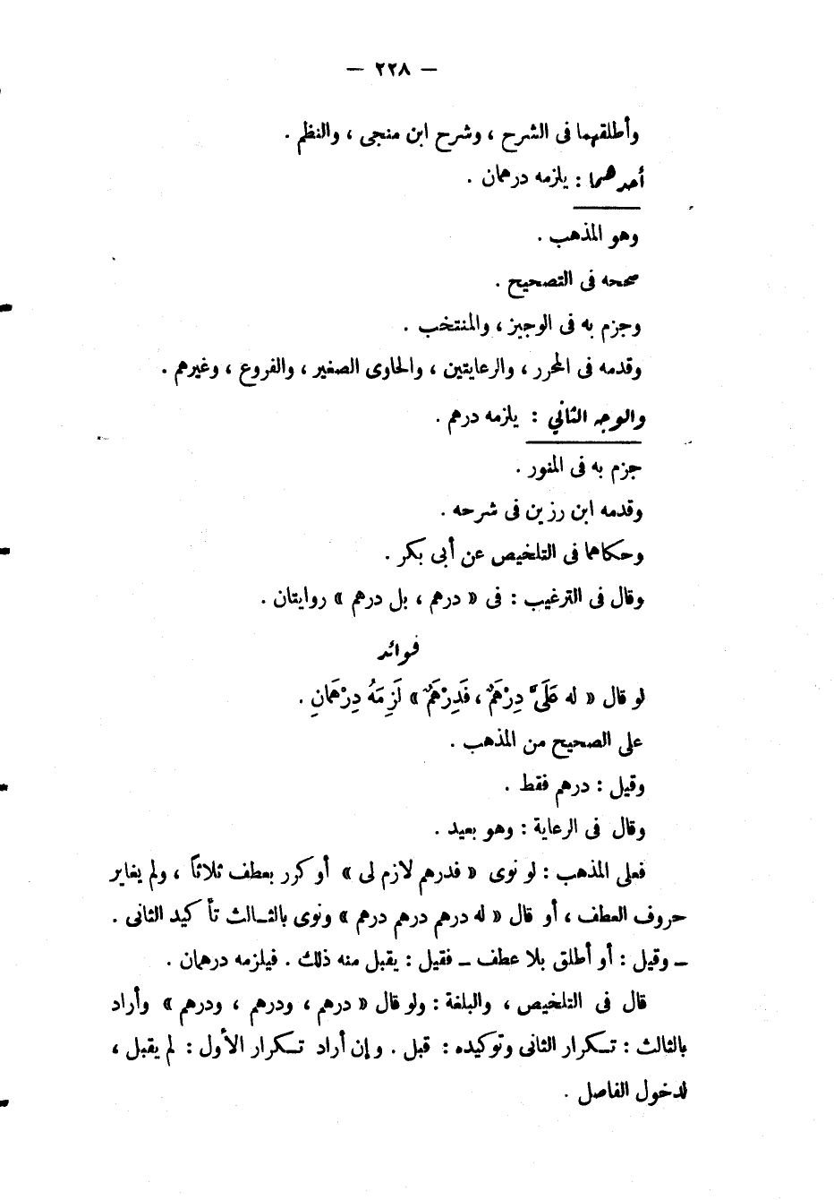 وَأَطْلَقَهُمَا فِي الشَّرْحِ، وَشَرْحِ ابْنِ مُنَجَّا، وَالنَّظْمِ أَحَدُهُمَا: يَلْزَمُهُ دِرْهَمَانِ وَهُوَ الْمَذْهَبُ صَحَّحَهُ فِي التَّصْحِيحِ وَجَزَمَ بِهِ فِي الْوَجِيزِ، وَالْمُنْتَخَبِ وَقَدَّمَهُ فِي الْمُحَرَّرِ، وَالرِّعَايَتَيْنِ، وَالْحَاوِي الصَّغِيرِ، وَالْفُرُوعِ، وَغَيْرِهِمْ وَالْوَجْهُ الثَّانِي: يَلْزَمُهُ دِرْهَمٌ جَزَمَ بِهِ فِي الْمُنَوِّرِ وَقَدَّمَهُ ابْنُ رَزِينٍ فِي شَرْحِهِ وَحَكَاهُمَا فِي التَّلْخِيصِ عَنْ أَبِي بَكْرٍ وَقَالَ فِي التَّرْغِيبِ: فِي " دِرْهَمٌ، بَلْ دِرْهَمٌ " رِوَايَتَانِ فَوَائِدُ لَوْ قَالَ " لَهُ عَلَيَّ دِرْهَمٌ، فَدِرْهَمٌ " لَزِمَهُ دِرْهَمَانِ عَلَى الصَّحِيحِ مِنْ الْمَذْهَبِ وَقِيلَ: دِرْهَمٌ فَقَطْ وَقَالَ فِي الرِّعَايَةِ: وَهُوَ بَعِيدٌ فَعَلَى الْمَذْهَبِ: لَوْ نَوَى " فَدِرْهَمٌ لَازِمٌ لِي " أَوْ كَرَّرَ بِعَطْفٍ ثَلَاثًا، وَلَمْ يُغَايِرْ حُرُوفَ الْعَطْفِ، أَوْ قَالَ " لَهُ دِرْهَمٌ دِرْهَمٌ دِرْهَمٌ " وَنَوَى بِالثَّالِثِ تَأْكِيدَ الثَّانِي وَقِيلَ: أَوْ أَطْلَقَ بِلَا عَطْفٍ فَقِيلَ: يُقْبَلُ مِنْهُ ذَلِكَ فَيَلْزَمُهُ دِرْهَمَانِ قَالَ فِي التَّلْخِيصِ، وَالْبُلْغَةِ: وَلَوْ قَالَ " دِرْهَمٌ، وَدِرْهَمٌ، وَدِرْهَمٌ " وَأَرَادَ بِالثَّالِثِ: تَكْرَارَ الثَّانِي وَتَوْكِيدَهُ: قُبِلَ وَإِنْ أَرَادَ تَكْرَارَ الْأَوَّلِ: لَمْ يُقْبَلْ، لِدُخُولِ الْفَاصِلِ